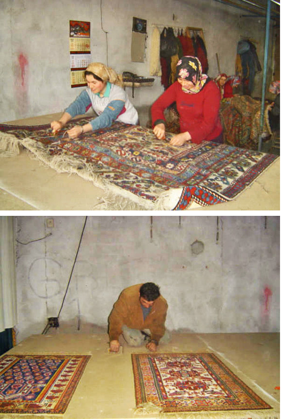 These rugs are crafted using mostly vertical looms, where knots are pulled downward, causing the pile to appear darker when viewed against the knotting direction and lighter when seen from the other side. The contrast varies with lighting conditions. This intricate knotting technique demands a caring touch, which is why these rugs are mostly woven by women while man do sheering, washing, dying & transporting the rugs. Importantly, child labor is never involved with our rugs, particularly with double Turkish knotting—an ancient style practiced by Turkic tribes and Armenians across Central Asia, the Caucasus, and Anatolia. This differs from Persian knotting, developed in the 19th century with Western influence. Historically, Persian rugs also used double knots called Gördes or Turkish knots, but the simpler Persian knot style is now common in regions such as China, India, and refugee camps. Turkey strictly forbids child labor in weaving.