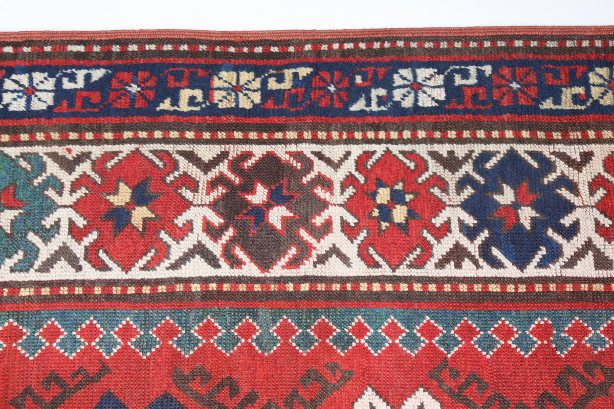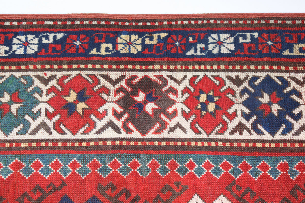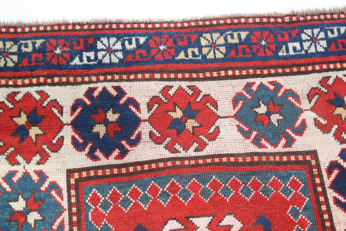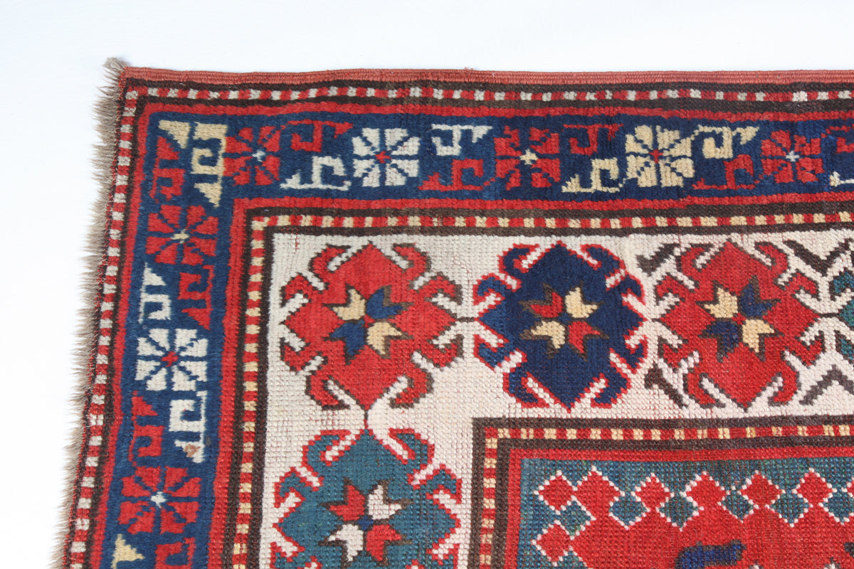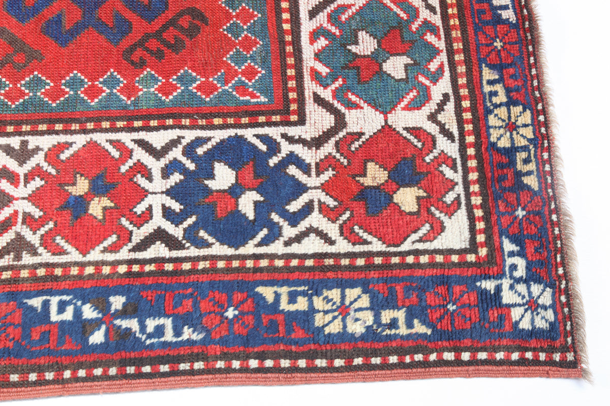 Most of our tribal rugs like this Bordjalo Kazak were woven in the late 19th century along the western coast of the Caspian Sea—an area bordered by the Black Sea and Turkey to the west and Russia to the north—reflects a rich weaving heritage. Woven with hand-spun wool and naturally derived vegetable dyes, this region was historically celebrated as a center for producing exceptional tribal rugs before the Soviet period. The motives of this rug are taken from a much earlier kilim weaving, (flat woven rug). Intricately adorned with spiritual motifs, the patterns draw inspiration from the early shamanistic traditions practiced by the Turkic peoples of Central Asia, embedding deep cultural and historical significance into each thread. This combination of artistry and symbolism not only highlights the weaver’s technical mastery but also offers a tangible connection to the region’s ancient spiritual heritage. The symbols include amulets, dragons, love-birds, and celebrations of significant life events such as weddings or childbirths. The prominent border features beetles symbolizing power, while the outer edge is adorned with running dog motifs, meant to guard against outsiders.