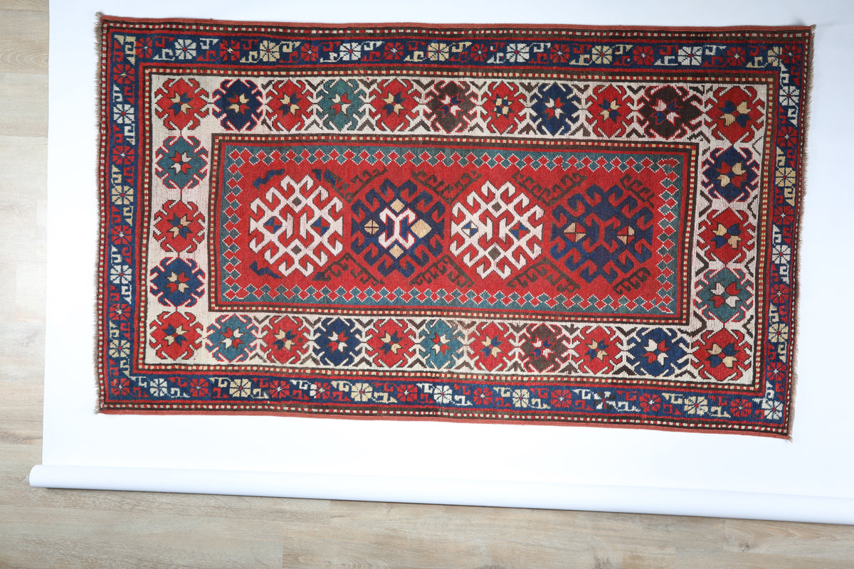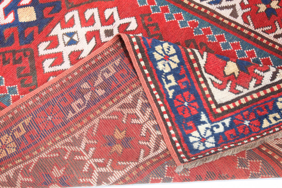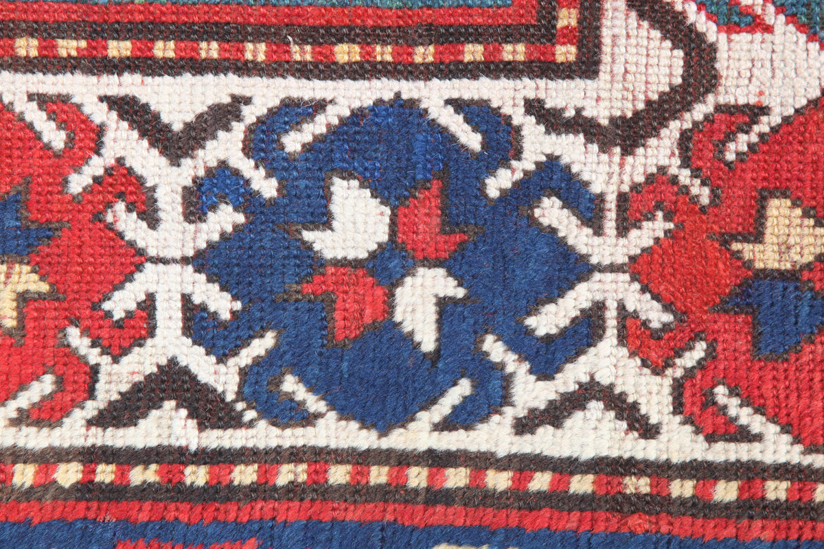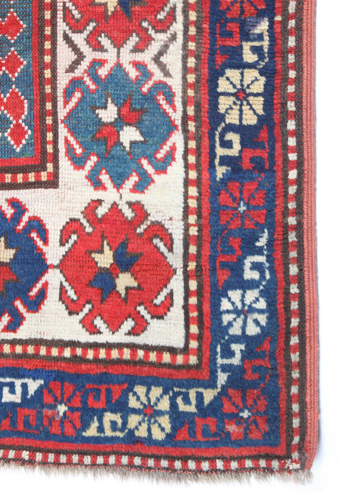 Most of our tribal rugs like this Bordjalo Kazak were woven in the late 19th century along the western coast of the Caspian Sea—an area bordered by the Black Sea and Turkey to the west and Russia to the north—reflects a rich weaving heritage. Woven with hand-spun wool and naturally derived vegetable dyes, this region was historically celebrated as a center for producing exceptional tribal rugs before the Soviet period. The motives of this rug are taken from a much earlier kilim weaving, (flat woven rug). Intricately adorned with spiritual motifs, the patterns draw inspiration from the early shamanistic traditions practiced by the Turkic peoples of Central Asia, embedding deep cultural and historical significance into each thread. This combination of artistry and symbolism not only highlights the weaver’s technical mastery but also offers a tangible connection to the region’s ancient spiritual heritage. The symbols include amulets, dragons, love-birds, and celebrations of significant life events such as weddings or childbirths. The prominent border features beetles symbolizing power, while the outer edge is adorned with running dog motifs, meant to guard against outsiders.