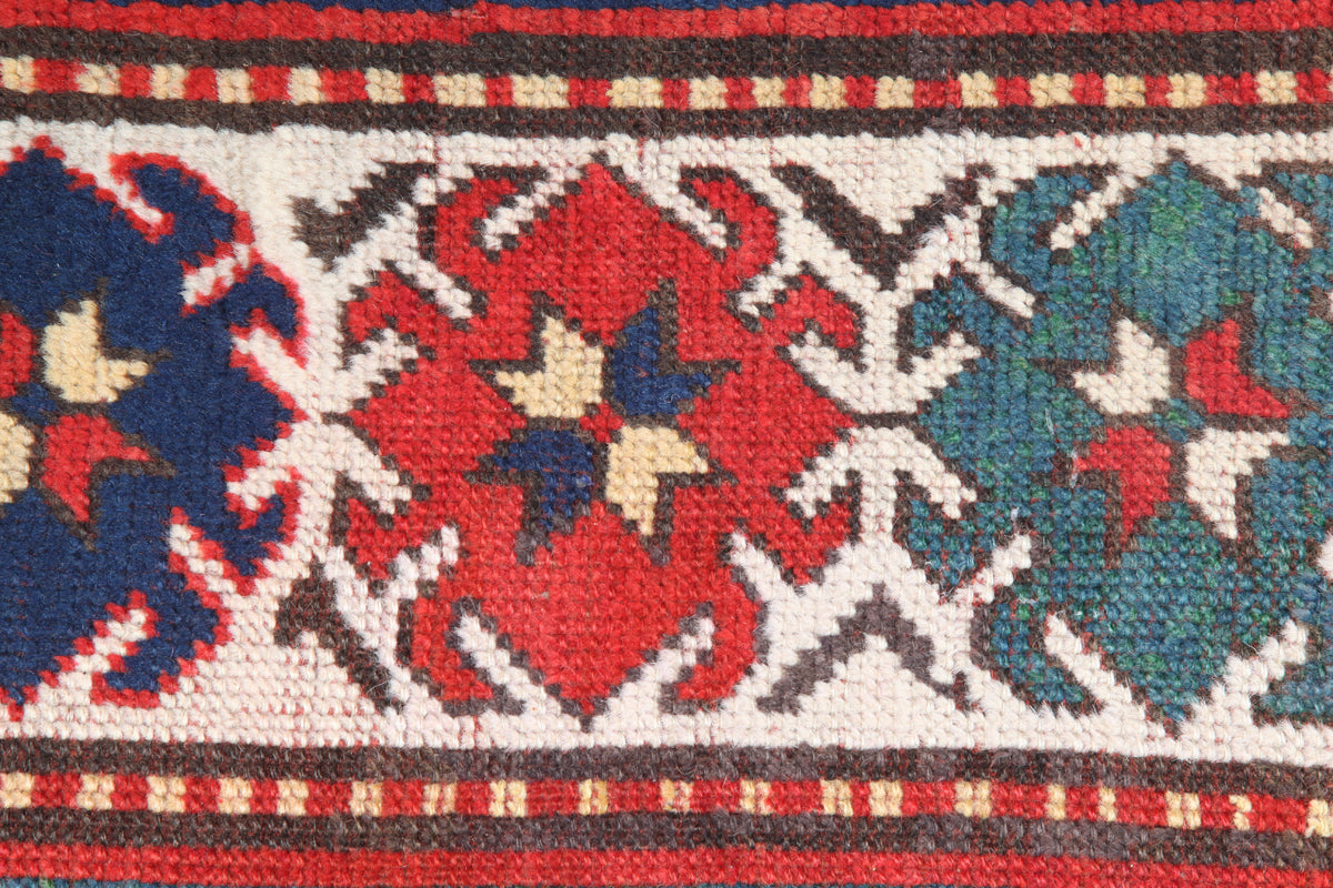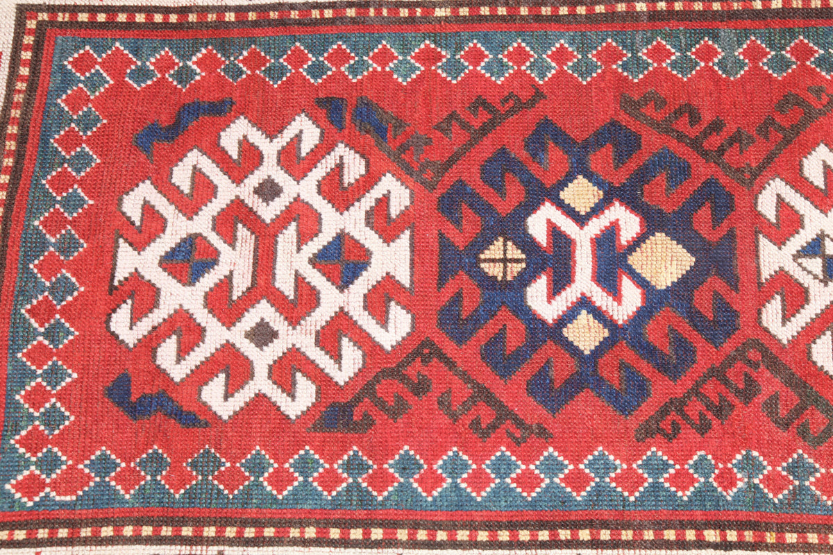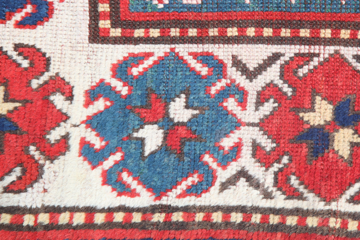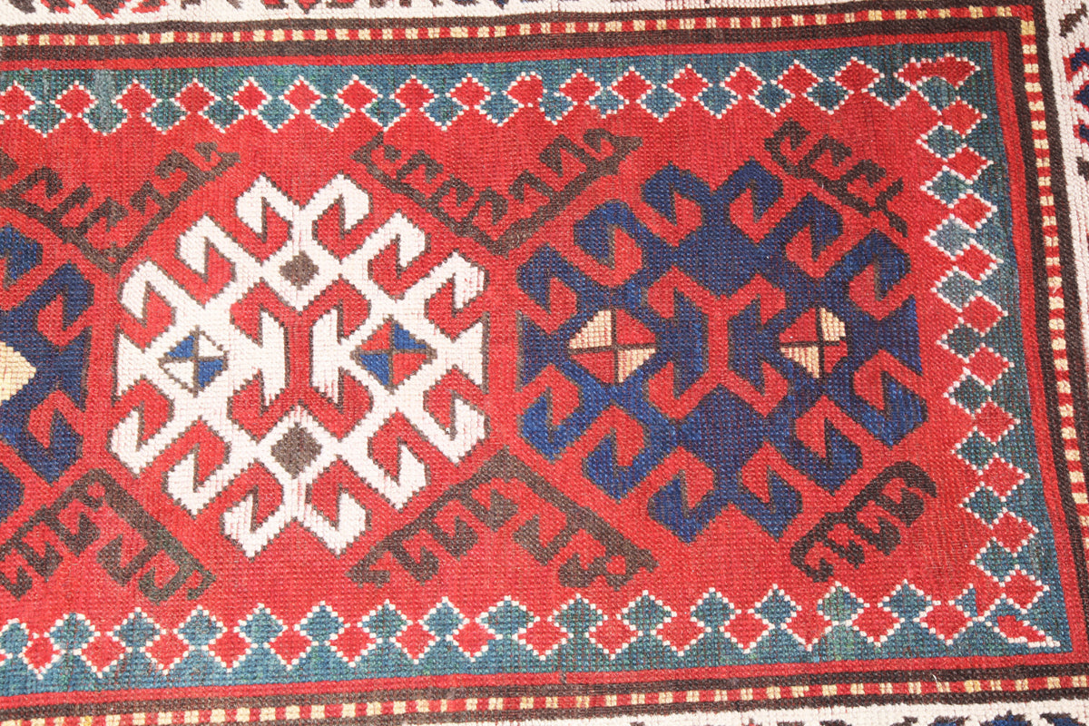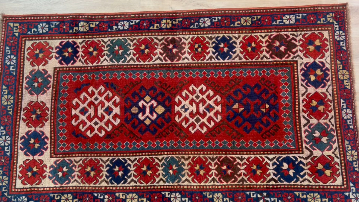 Most of our tribal rugs like this Bordjalo Kazak were woven in the late 19th century along the western coast of the Caspian Sea—an area bordered by the Black Sea and Turkey to the west and Russia to the north—reflects a rich weaving heritage. Woven with hand-spun wool and naturally derived vegetable dyes, this region was historically celebrated as a center for producing exceptional tribal rugs before the Soviet period. The motives of this rug are taken from a much earlier kilim weaving, (flat woven rug). Intricately adorned with spiritual motifs, the patterns draw inspiration from the early shamanistic traditions practiced by the Turkic peoples of Central Asia, embedding deep cultural and historical significance into each thread. This combination of artistry and symbolism not only highlights the weaver’s technical mastery but also offers a tangible connection to the region’s ancient spiritual heritage. The symbols include amulets, dragons, love-birds, and celebrations of significant life events such as weddings or childbirths. The prominent border features beetles symbolizing power, while the outer edge is adorned with running dog motifs, meant to guard against outsiders.
