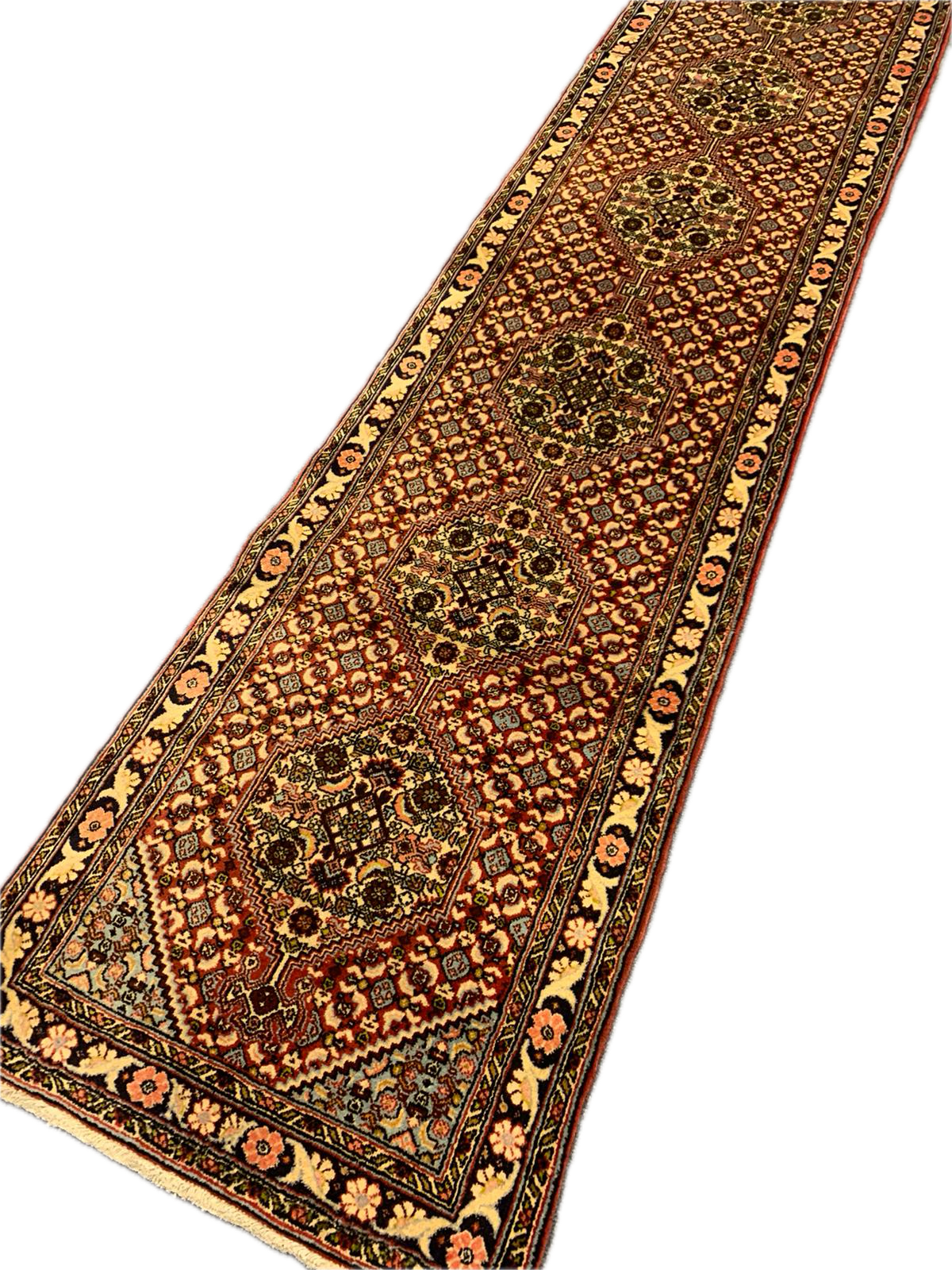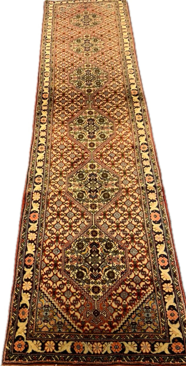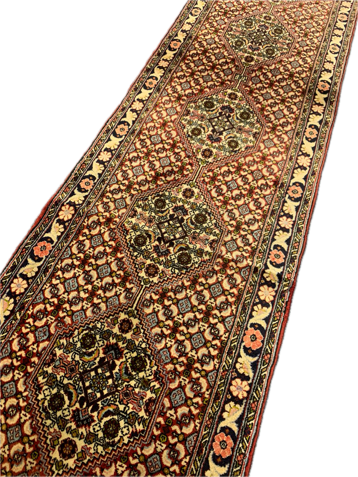 #38374. Originating from Iran, this mid-20th century Farrakhan runner is a distinctive example of traditional craftsmanship. Each rug offered by our collection is unique, and this piece stands out with its exceptionally large border, which artistically features nightingales perched on daisies. These birds are depicted in pairs, creating an elegant natural motif that frames the central field of the rug. The detailed imagery combined with the runner’s rich cultural heritage makes it not only a functional floor covering but also a captivating work of art, perfect for collectors and connoisseurs seeking authenticity and refined design.