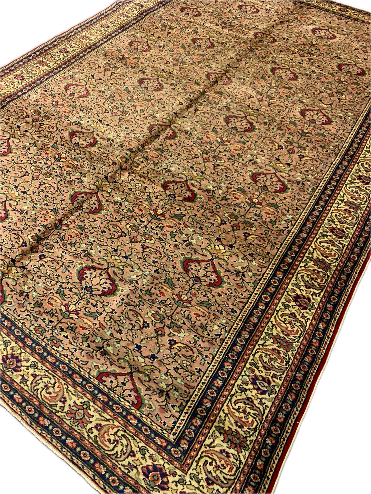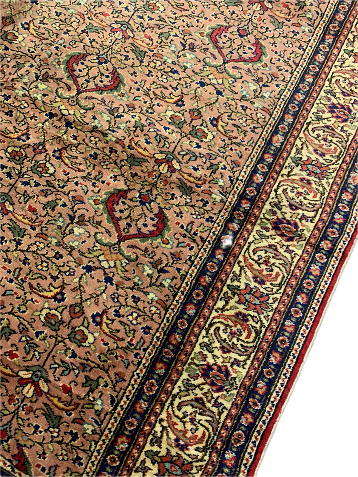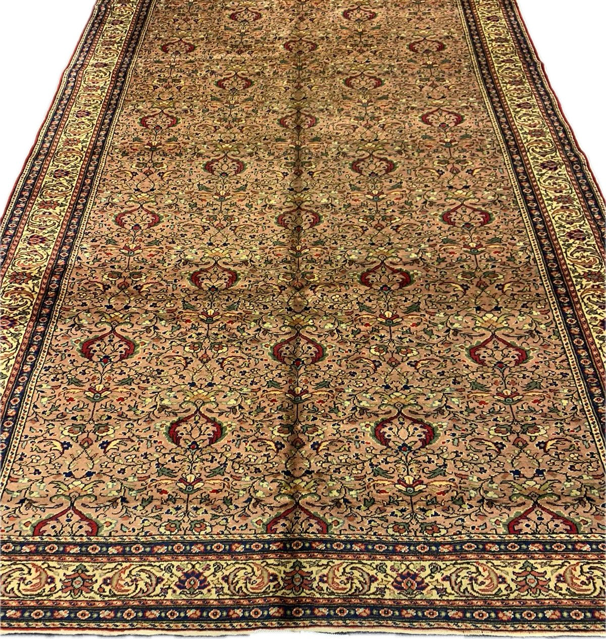 Discover the deep-rooted heritage of Kayseri carpet weaving, originating in Türkiye's city of Kayseri. For centuries, this city has been celebrated for its expert rug making, leading to intricate and lavish designs. This garden-inspired rug design evokes a sense of tranquility and connection to nature, with the apricot background enhancing and highlighting all the motifs. Over the years, various civilizations, including the Hittites, Phrygians, Romans, Ottomans, and Armenians, have played a significant role in shaping the distinct Kayseri rug style. This carpet boasts lovely, muted hues and an open center that accentuates the medallion. It is ideal for a living room with light flooring, such as tile or wood.