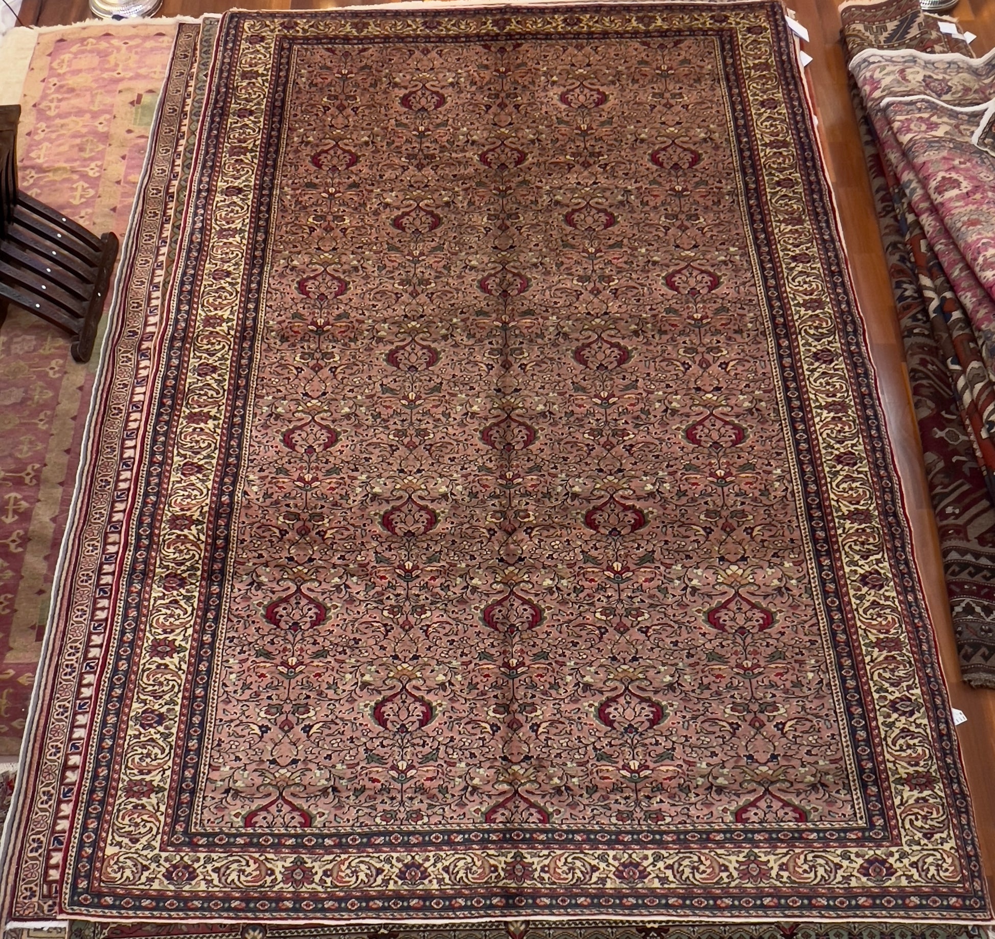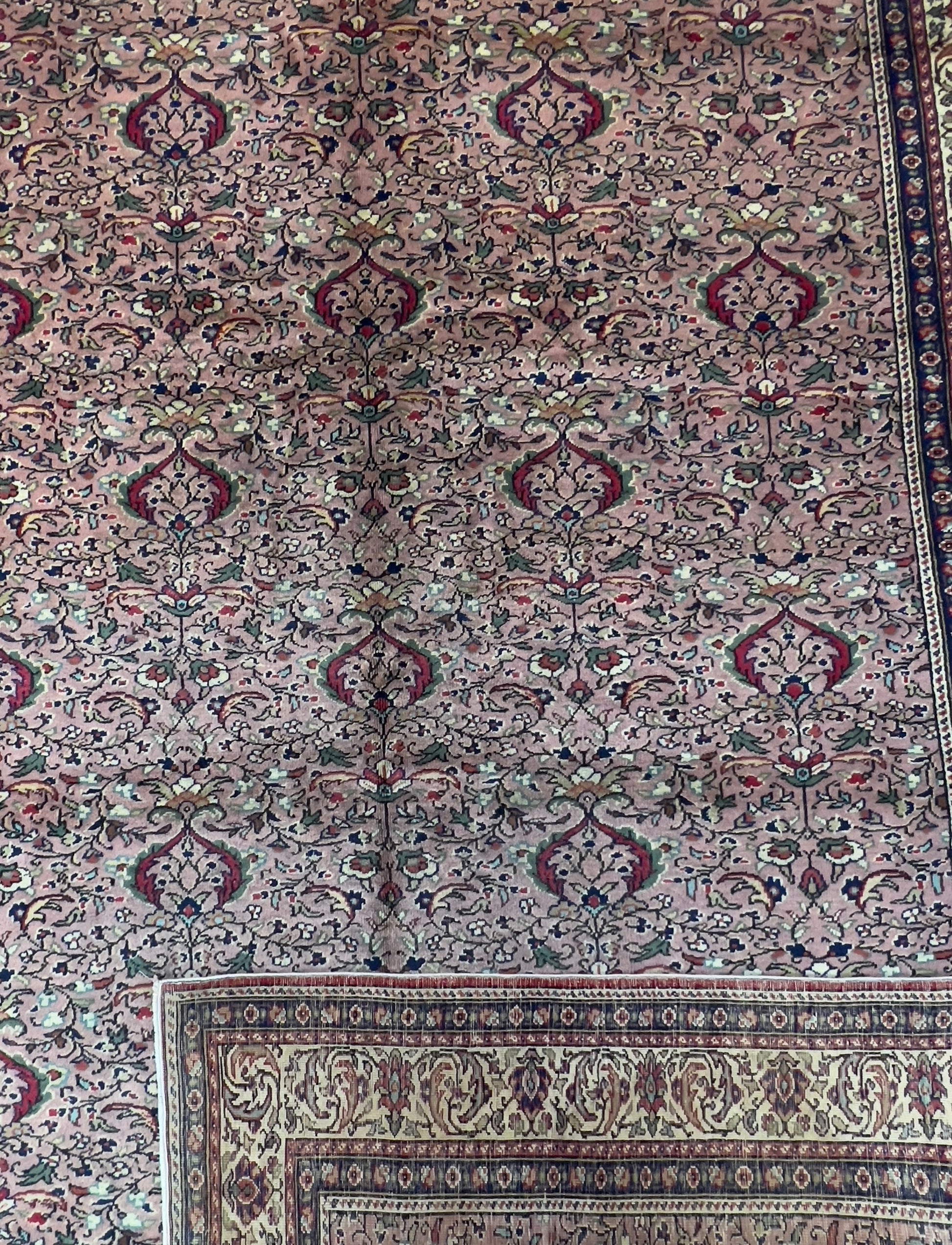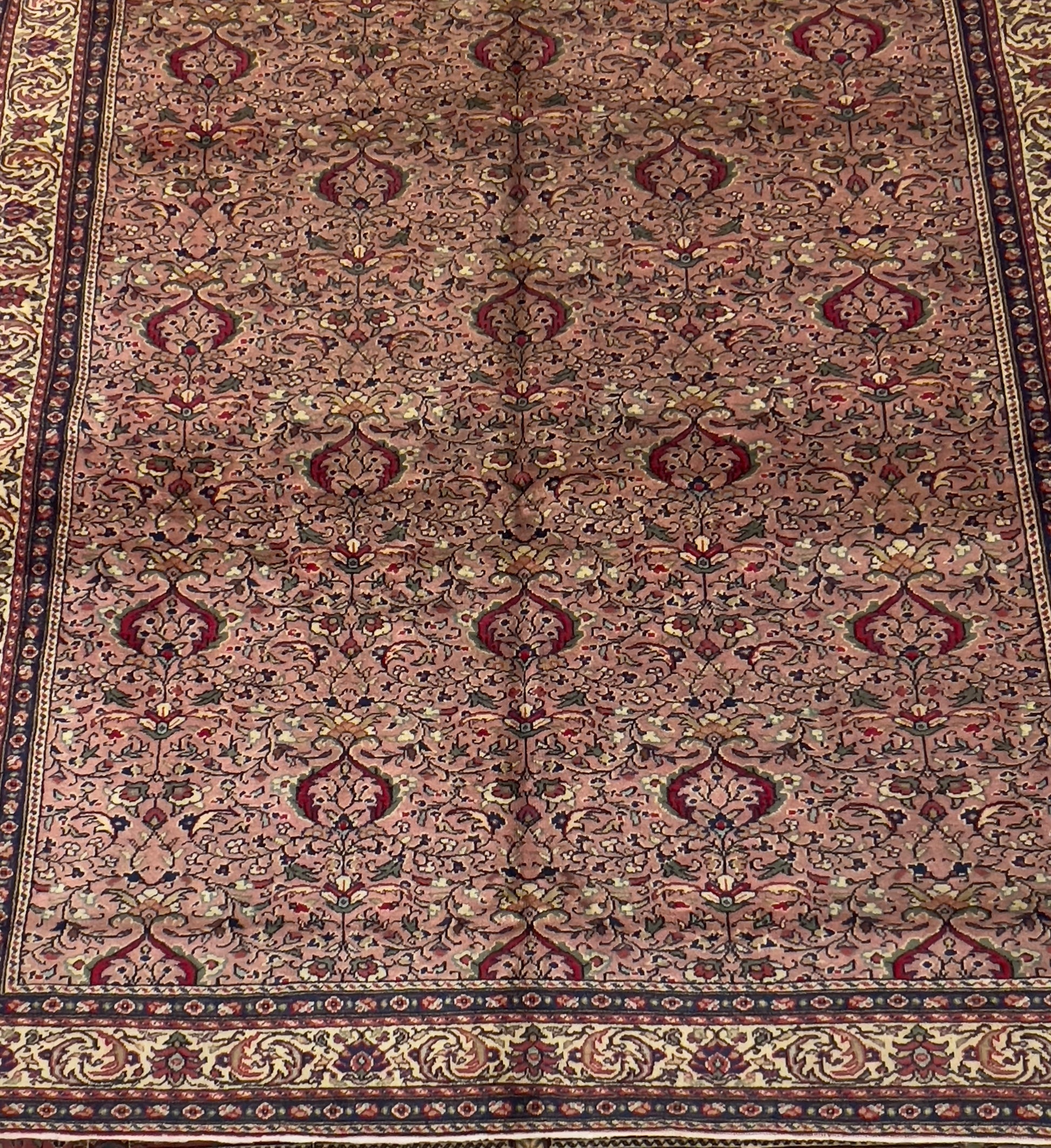 Discover the deep-rooted heritage of Kayseri carpet weaving, originating in Türkiye's city of Kayseri. For centuries, this city has been celebrated for its expert rug making, leading to intricate and lavish designs. This garden-inspired rug design evokes a sense of tranquility and connection to nature, with the apricot background enhancing and highlighting all the motifs. Over the years, various civilizations, including the Hittites, Phrygians, Romans, Ottomans, and Armenians, have played a significant role in shaping the distinct Kayseri rug style. This carpet boasts lovely, muted hues and an open center that accentuates the medallion. It is ideal for a living room with light flooring, such as tile or wood.