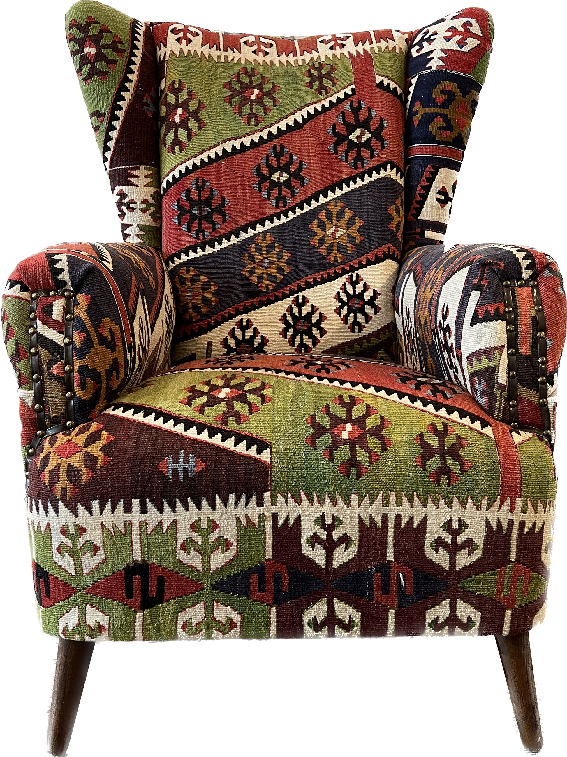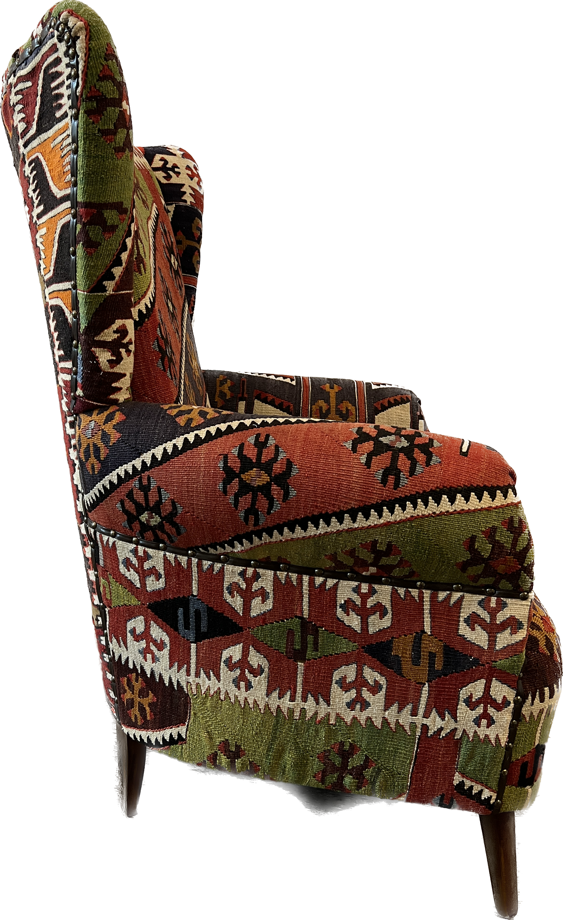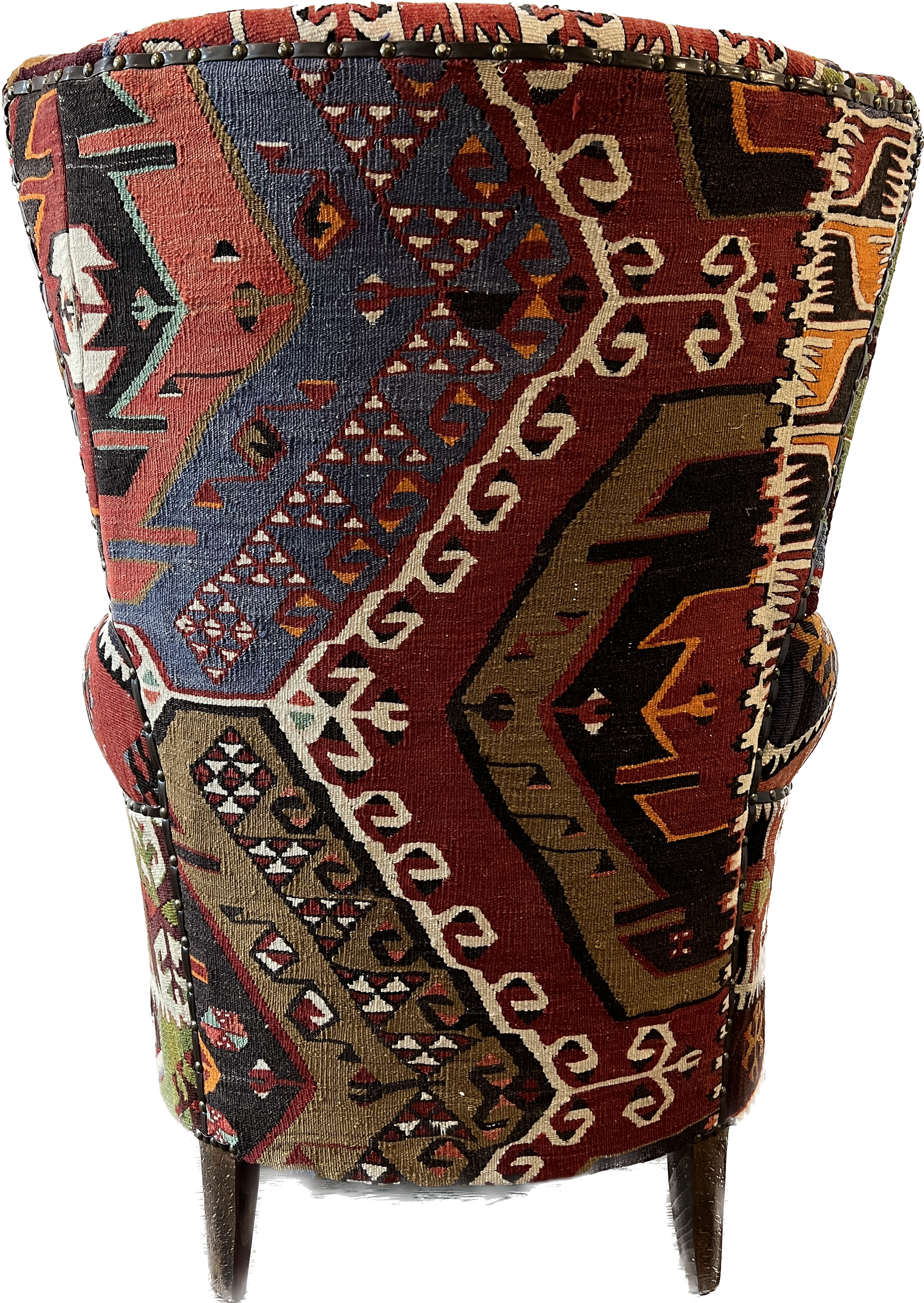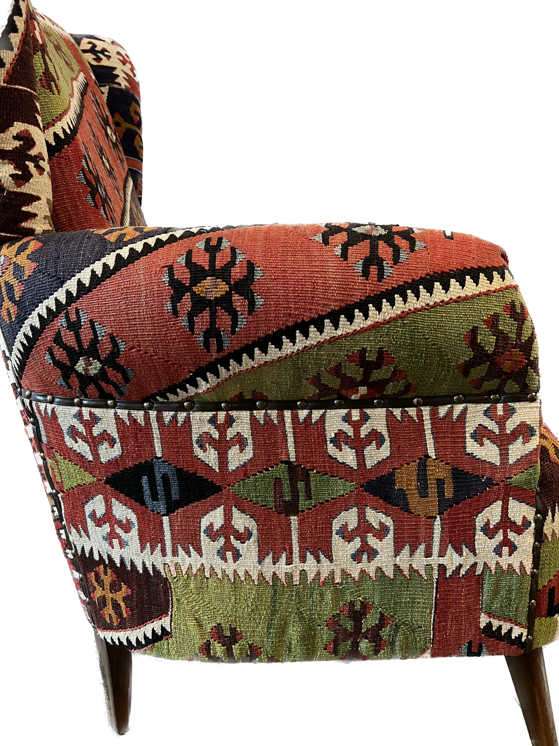 This armchair features upholstery made from tribal Elmadağ kilim fragments, originating from Central Anatolia in Turkey. The kilim was traditionally used for floor coverings or divan (raised bench) coverings, but over time, damaged parts have been repurposed into pillowcases and upholstery, as demonstrated here. Made from 100% hand spun mountain wool and hand woven in the early 20th century, this piece is truly one-of-a-kind.