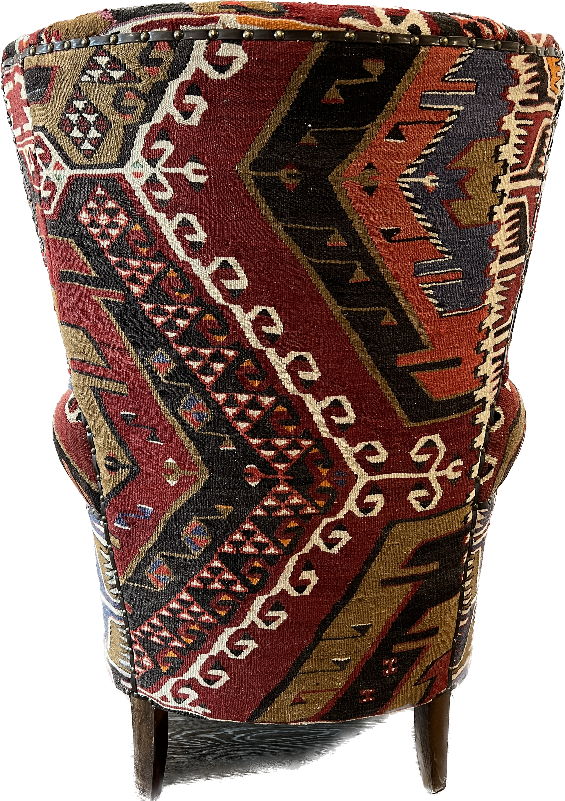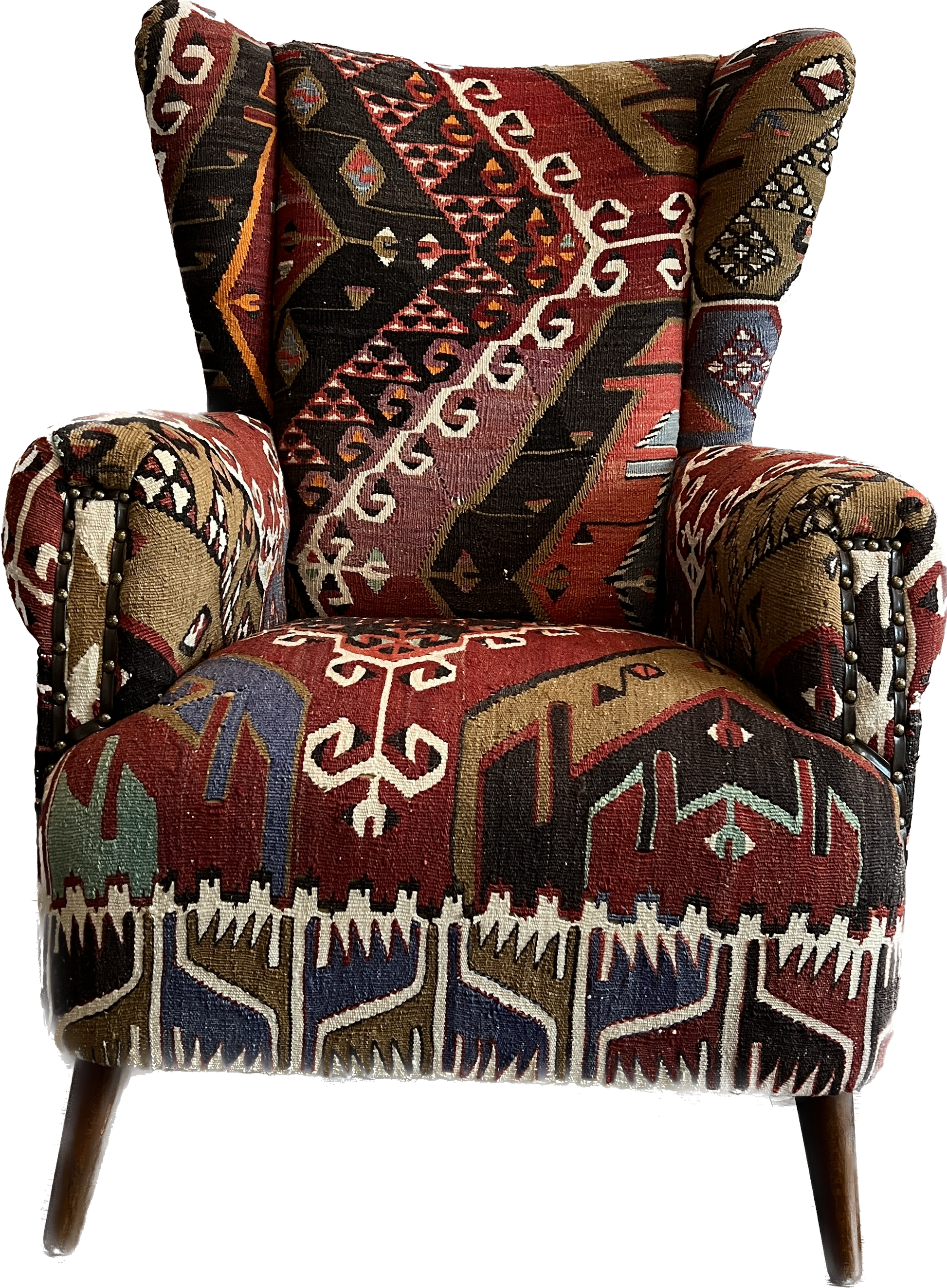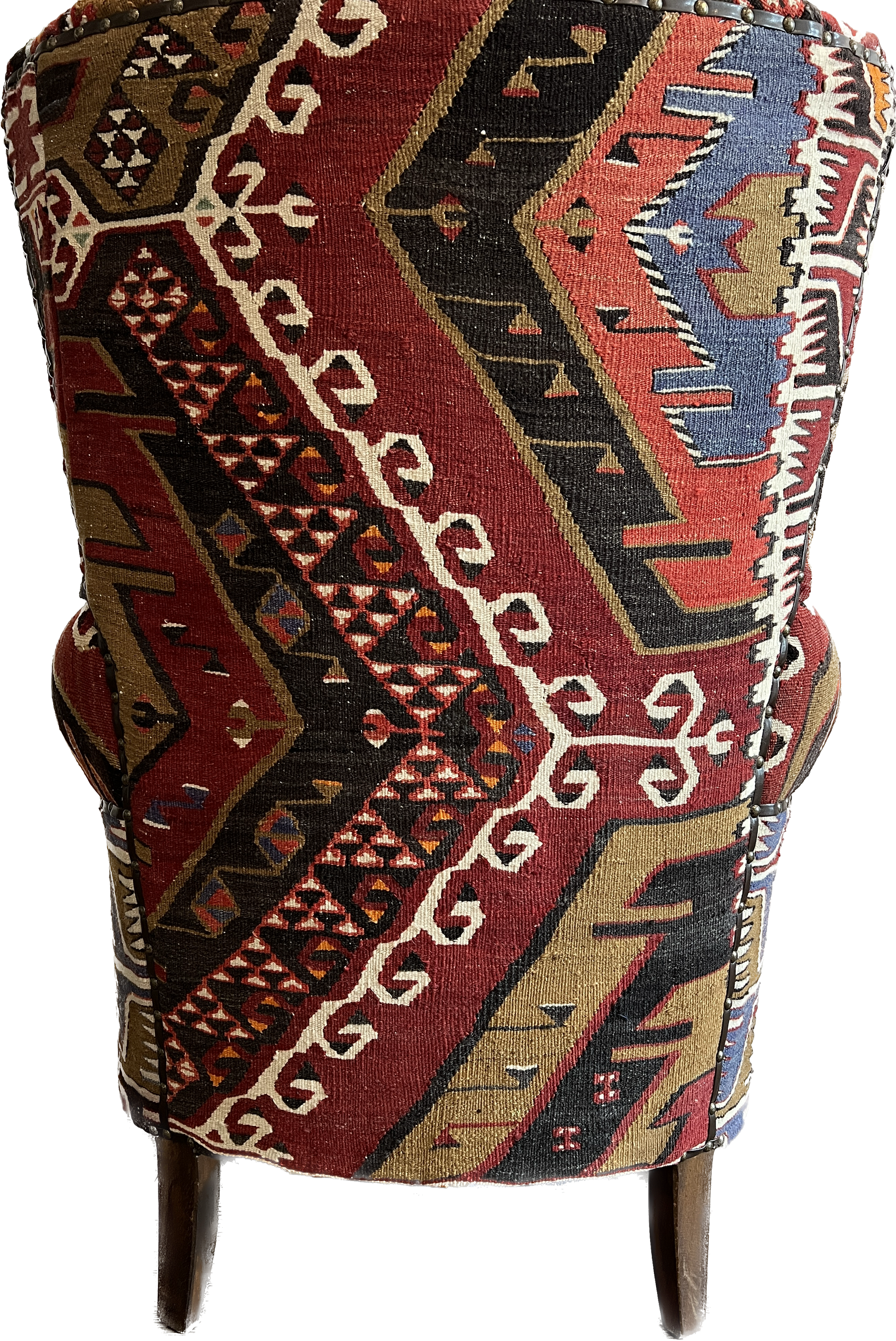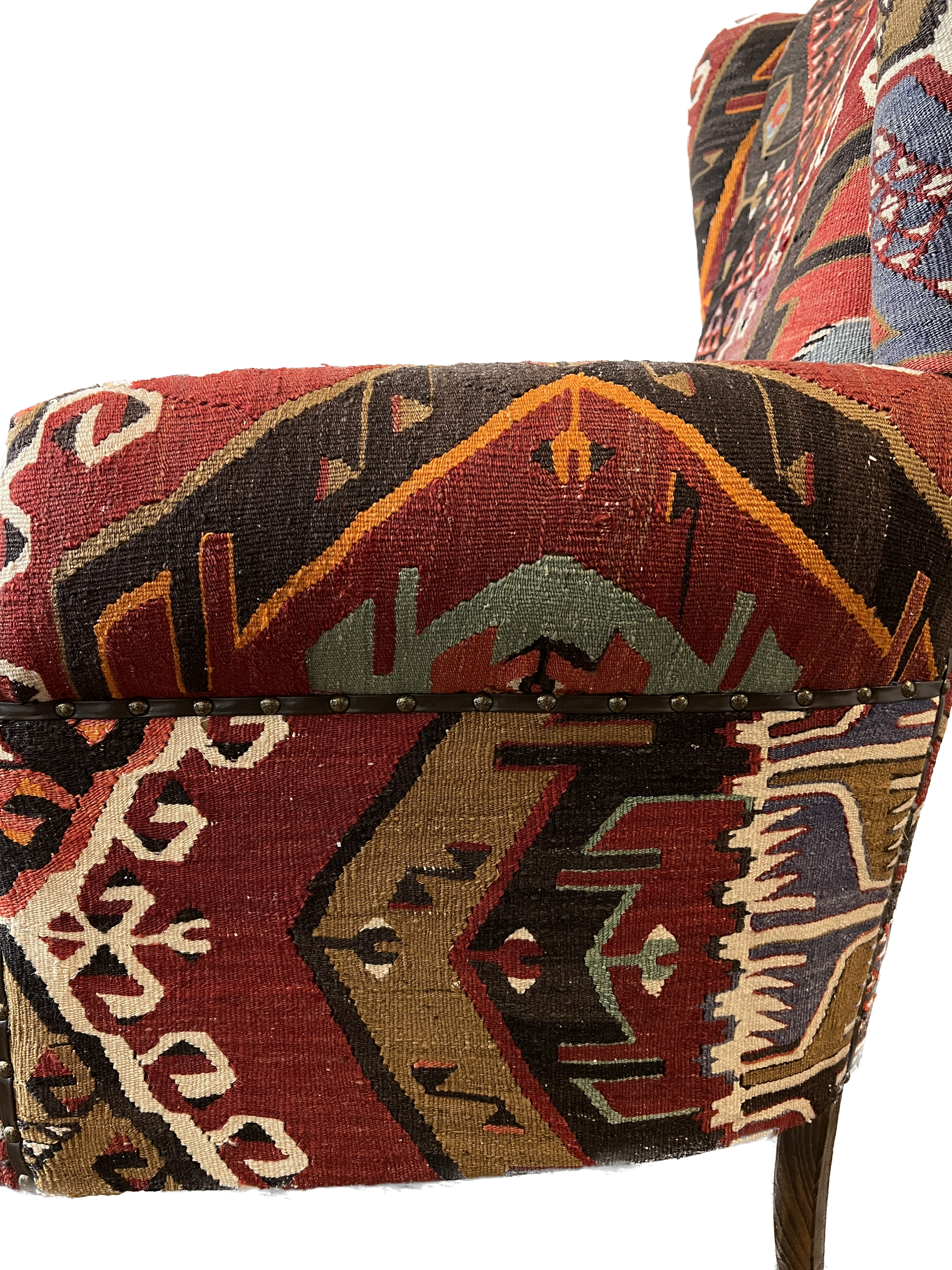 Made in Turkey, this armchair is crafted from fragments of tribal Elmadağ kilim, originally woven for flooring and seating in Central Anatolia. As a one-of-a-kind piece, it showcases the skilled craftsmanship of turning damaged kilim into unique upholstery and pillowcases. This antique armchair features hand-spun mountain wool and was intricately hand-woven in the early 20th century, making it a truly special addition to any space.