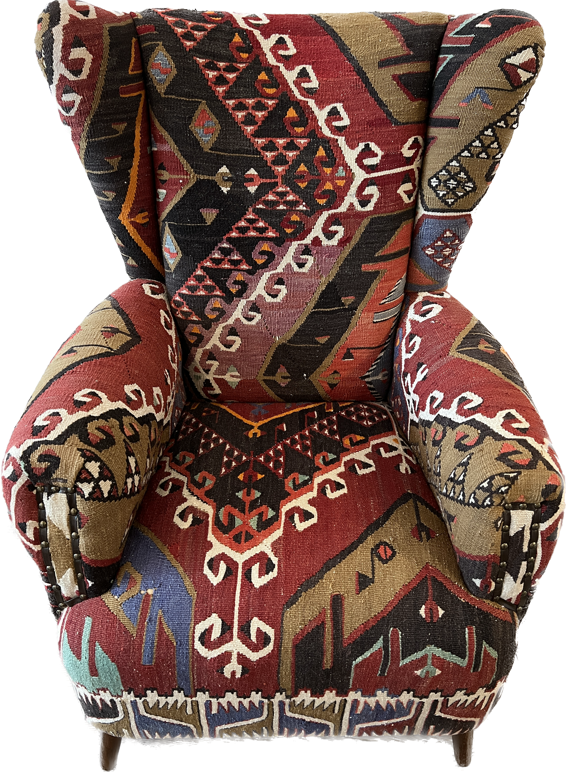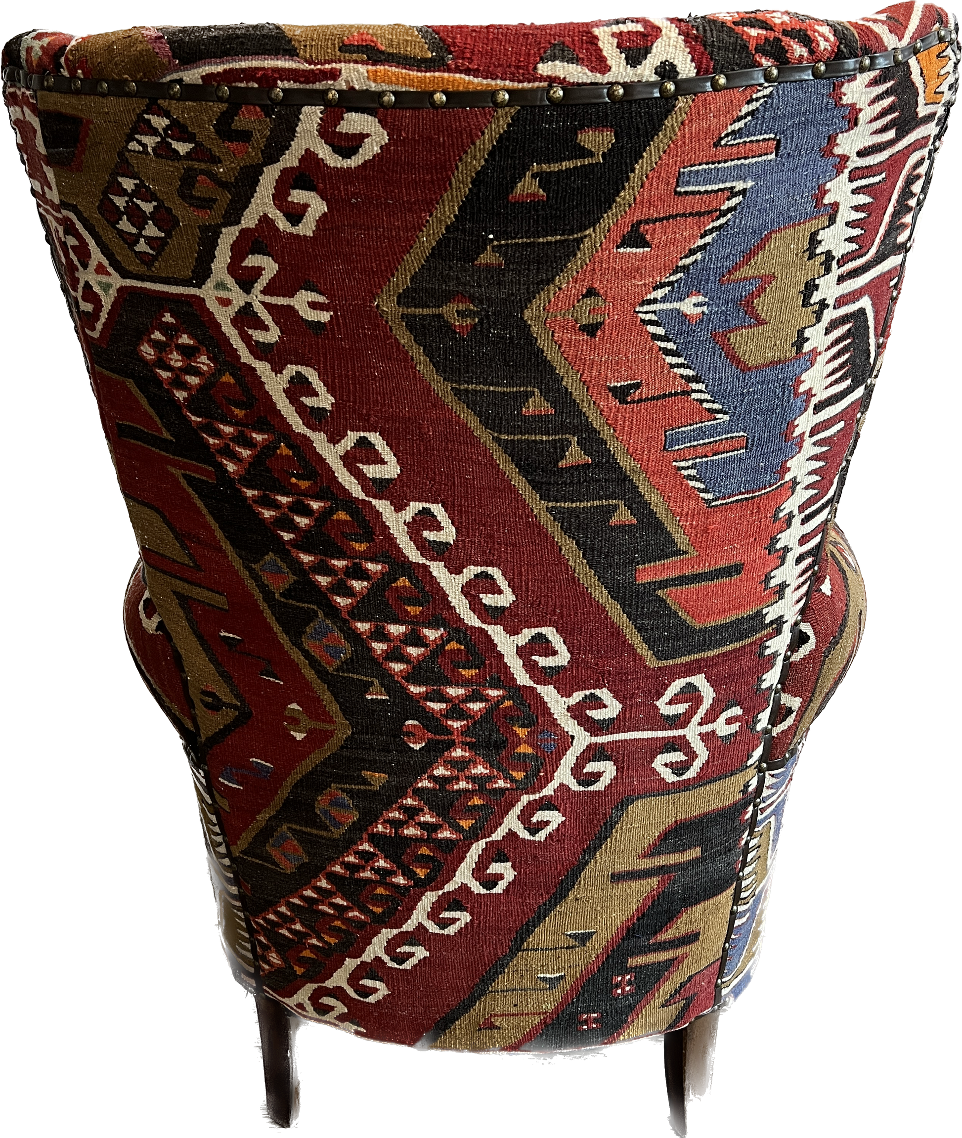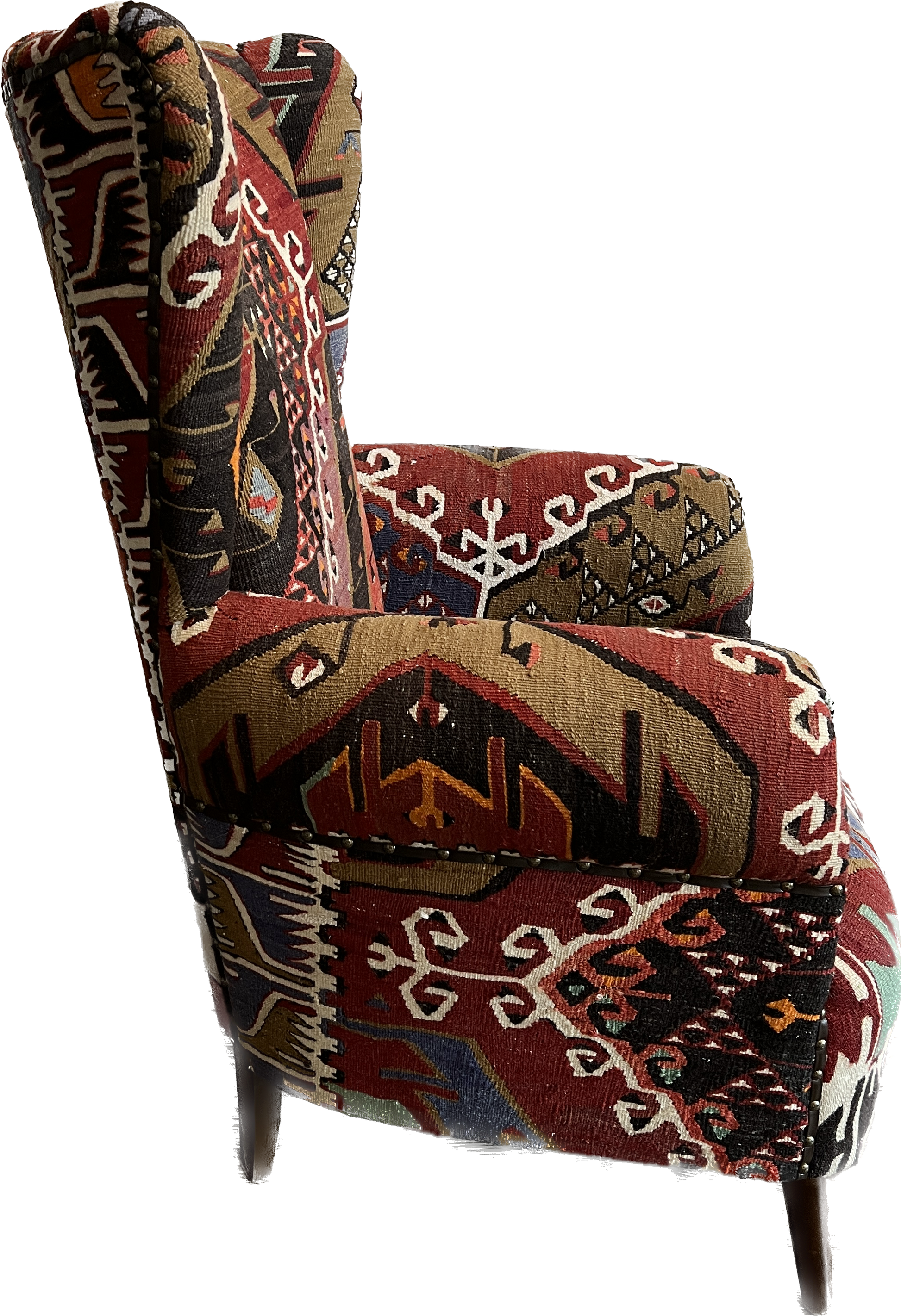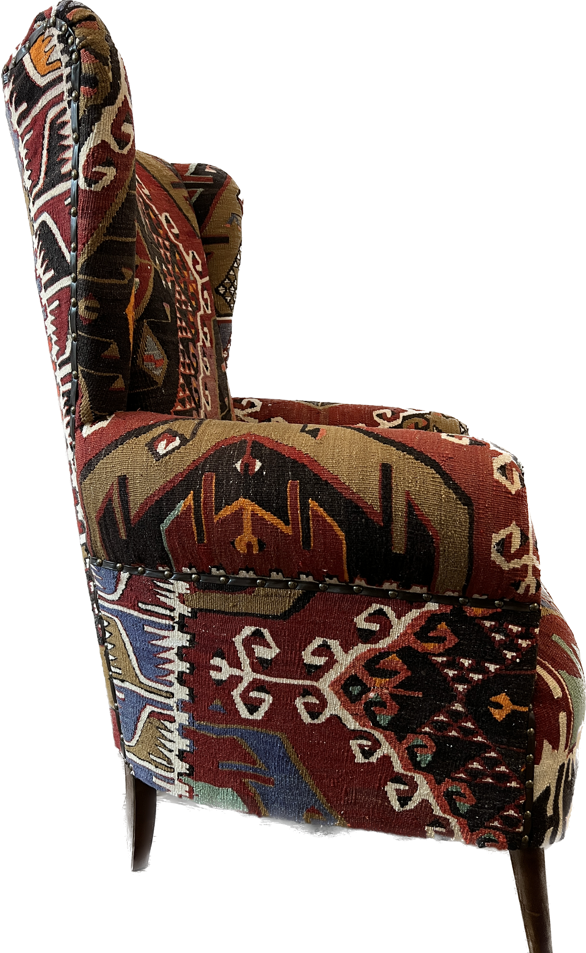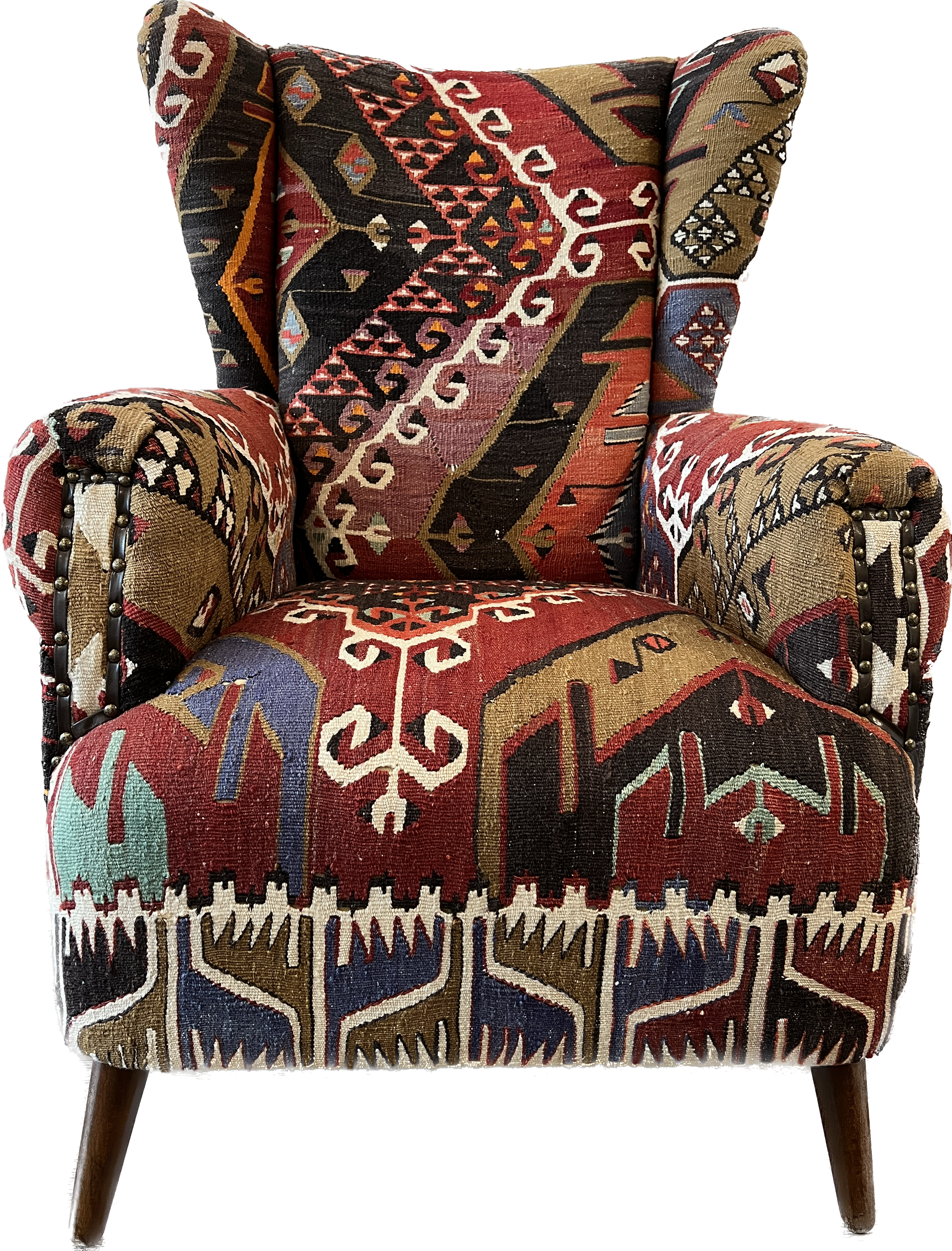 Made in Turkey, this armchair is crafted from fragments of tribal Elmadağ kilim, originally woven for flooring and seating in Central Anatolia. As a one-of-a-kind piece, it showcases the skilled craftsmanship of turning damaged kilim into unique upholstery and pillowcases. This antique armchair features hand-spun mountain wool and was intricately hand-woven in the early 20th century, making it a truly special addition to any space.