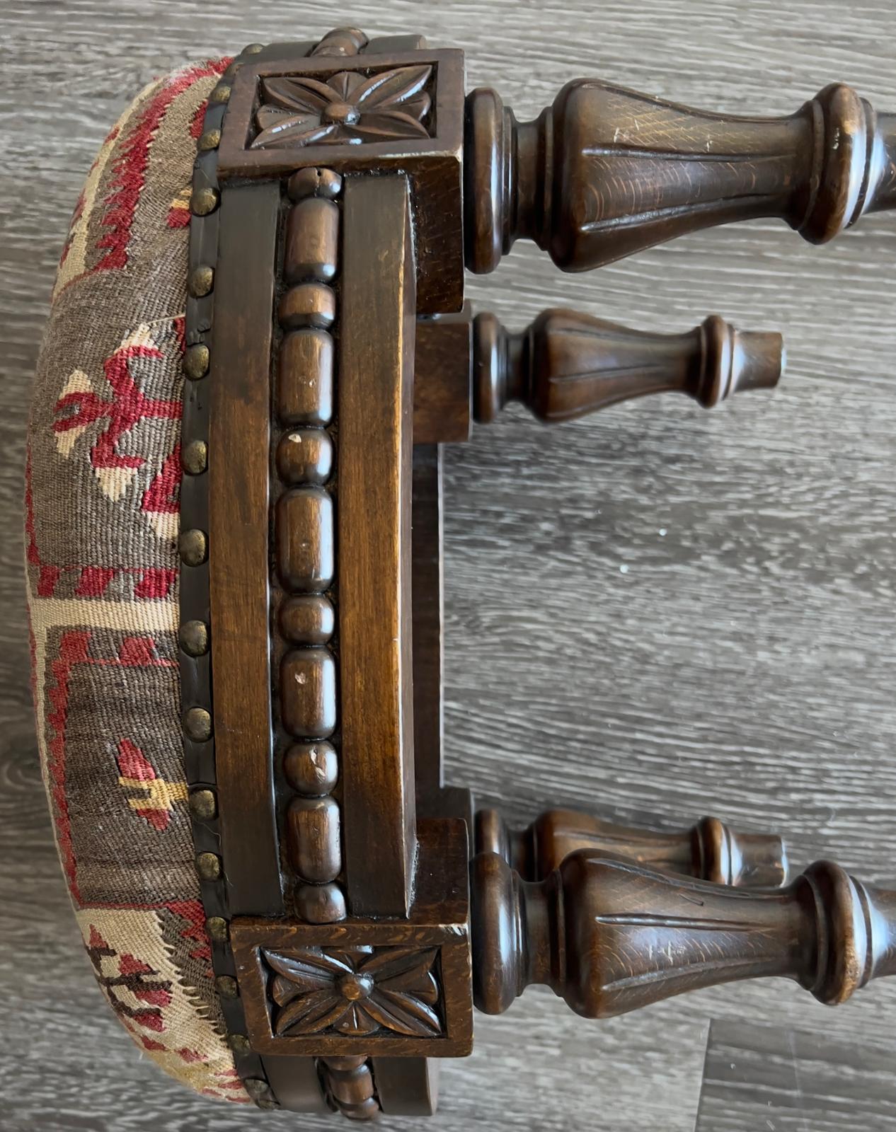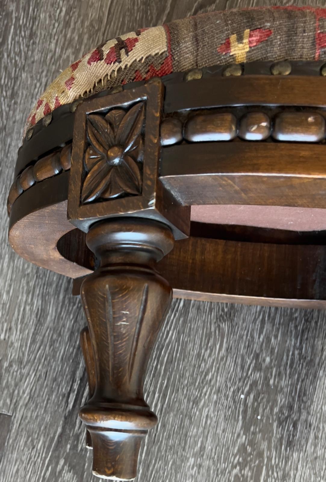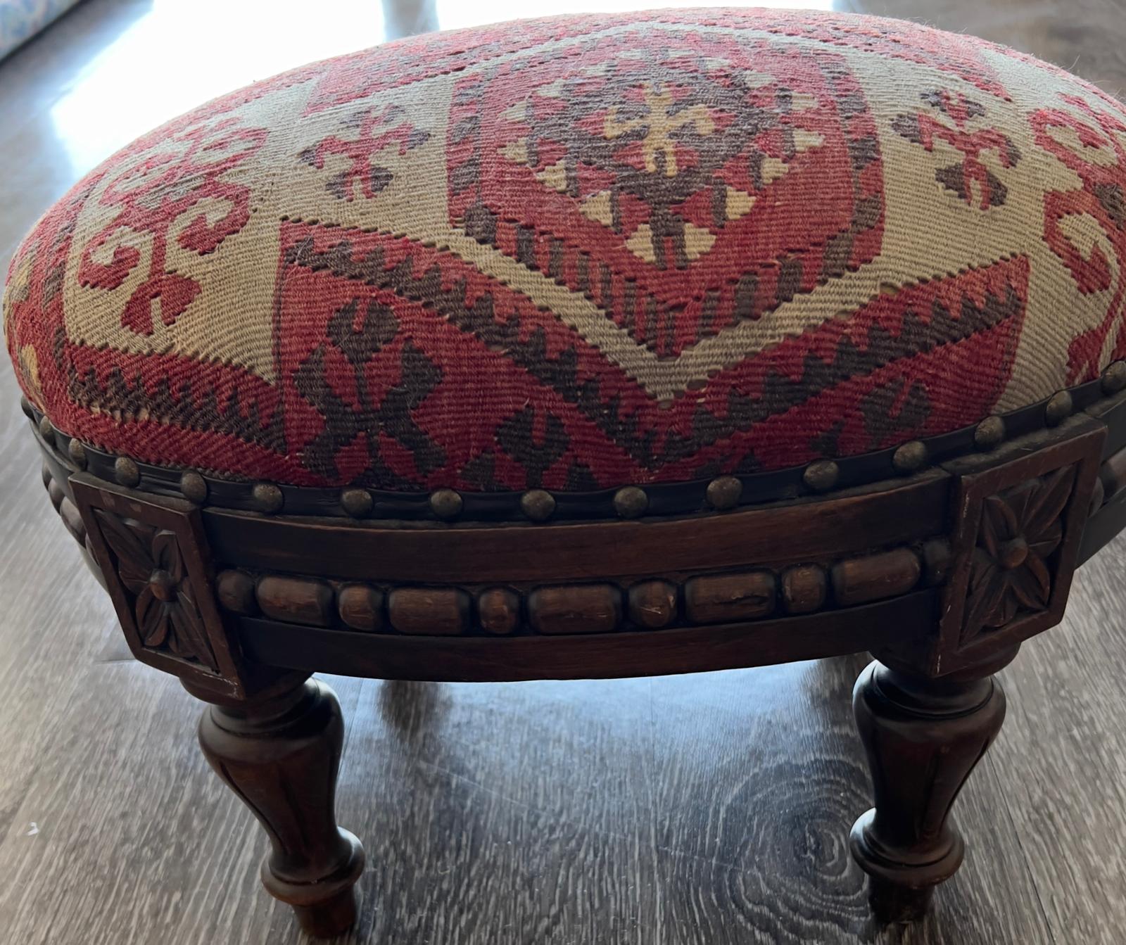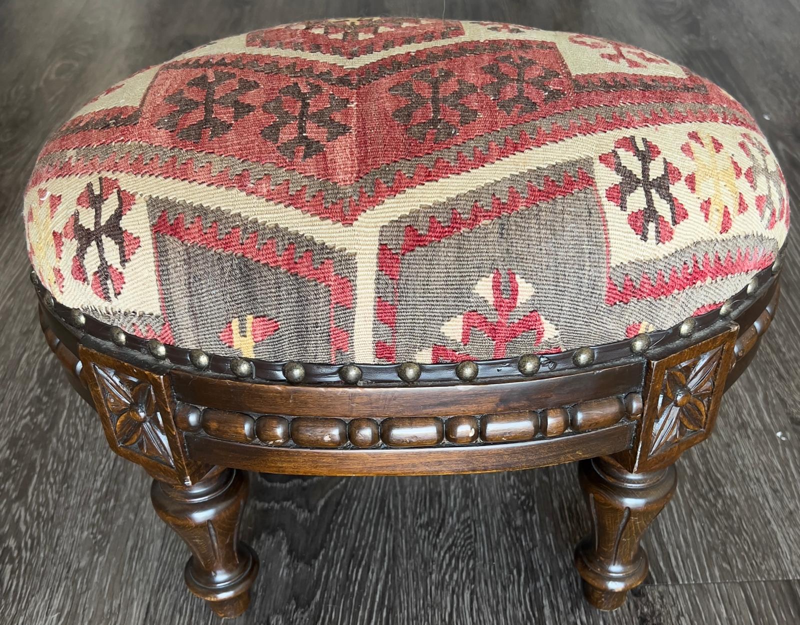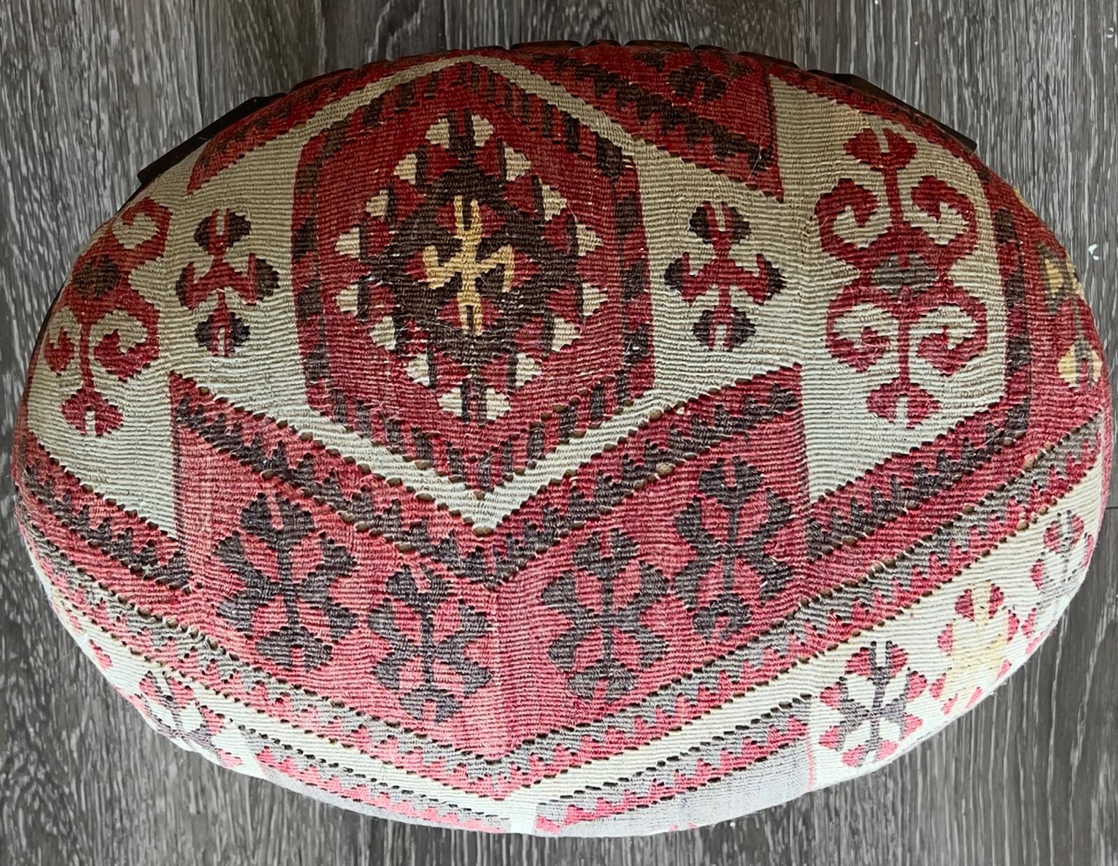 Experience the rich heritage of the late 1900s through this exquisitely crafted antique kilim stool. Handmade with meticulous care, it features soft mountain wool dyed using all-natural dyes, reflecting a deep commitment to traditional techniques. Each thread and pattern exemplifies expert craftsmanship passed down through generations. Though it bears signs of age and wear, these imperfections only enhance its authenticity and character, making it a compelling piece of history. This footstool stands as both a functional object and an elegant decorative element, perfect for adding cultural depth and timeless charm to any living space.