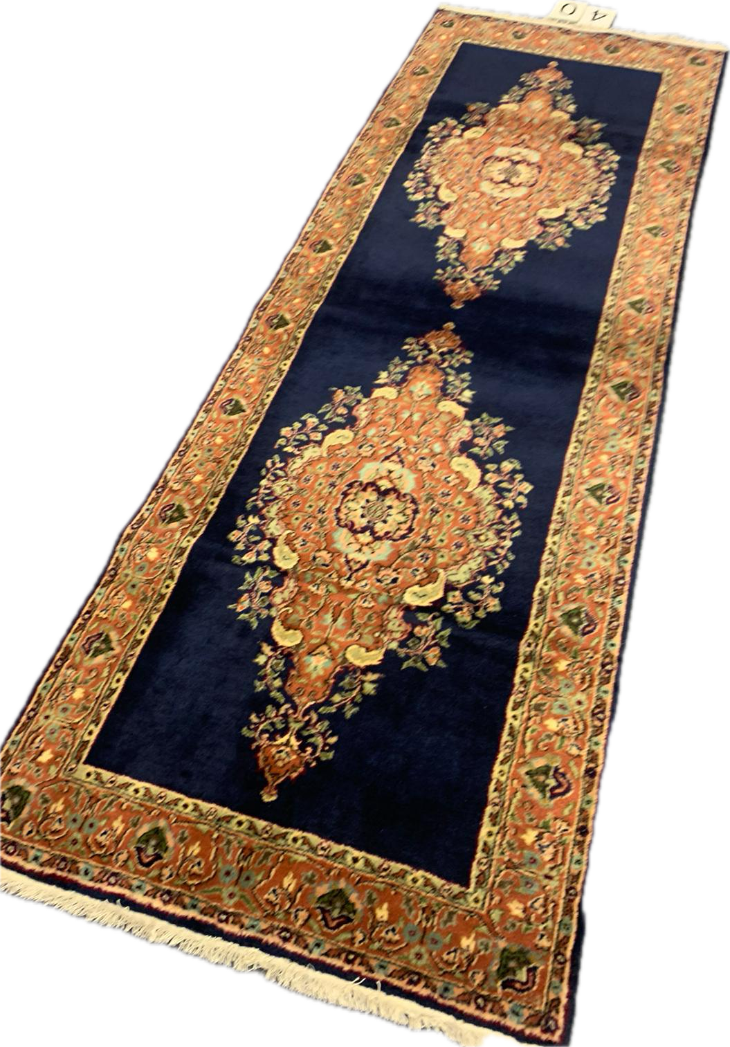 Hand-woven with hand-spun wool in the first half of the 20th century, this Antique Ladik runner features two striking medallions against a deep indigo blue field and caramel borders, making it truly unique. It was likely commissioned by a wealthy individual. Ladik was mostly known for the specially woven prayer rugs for early mosques across Turkey.