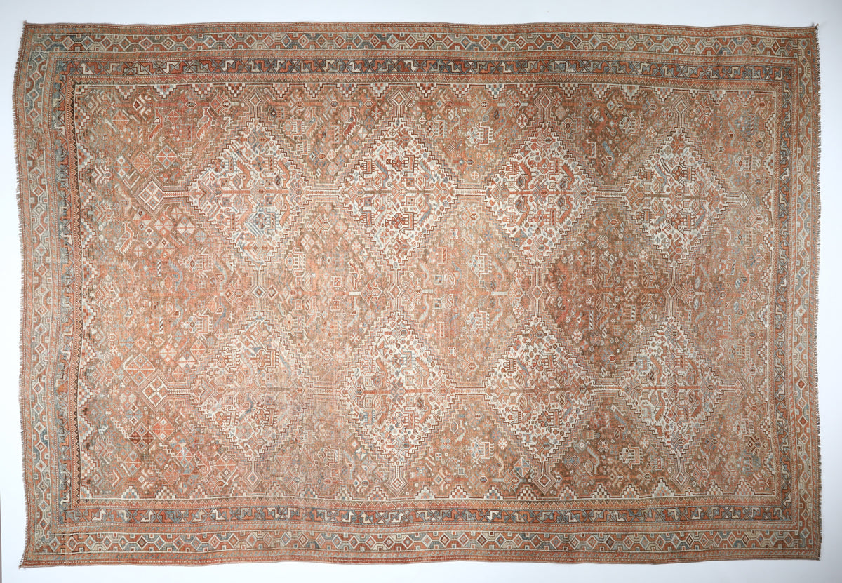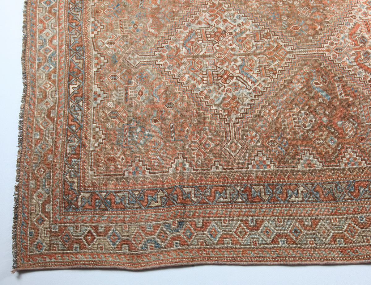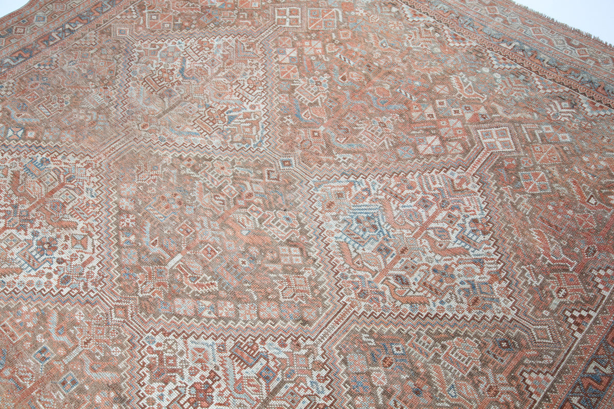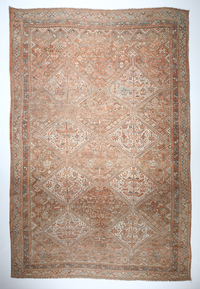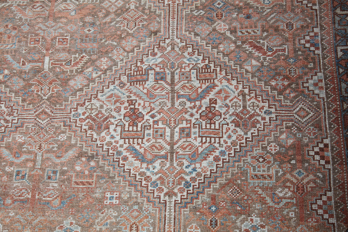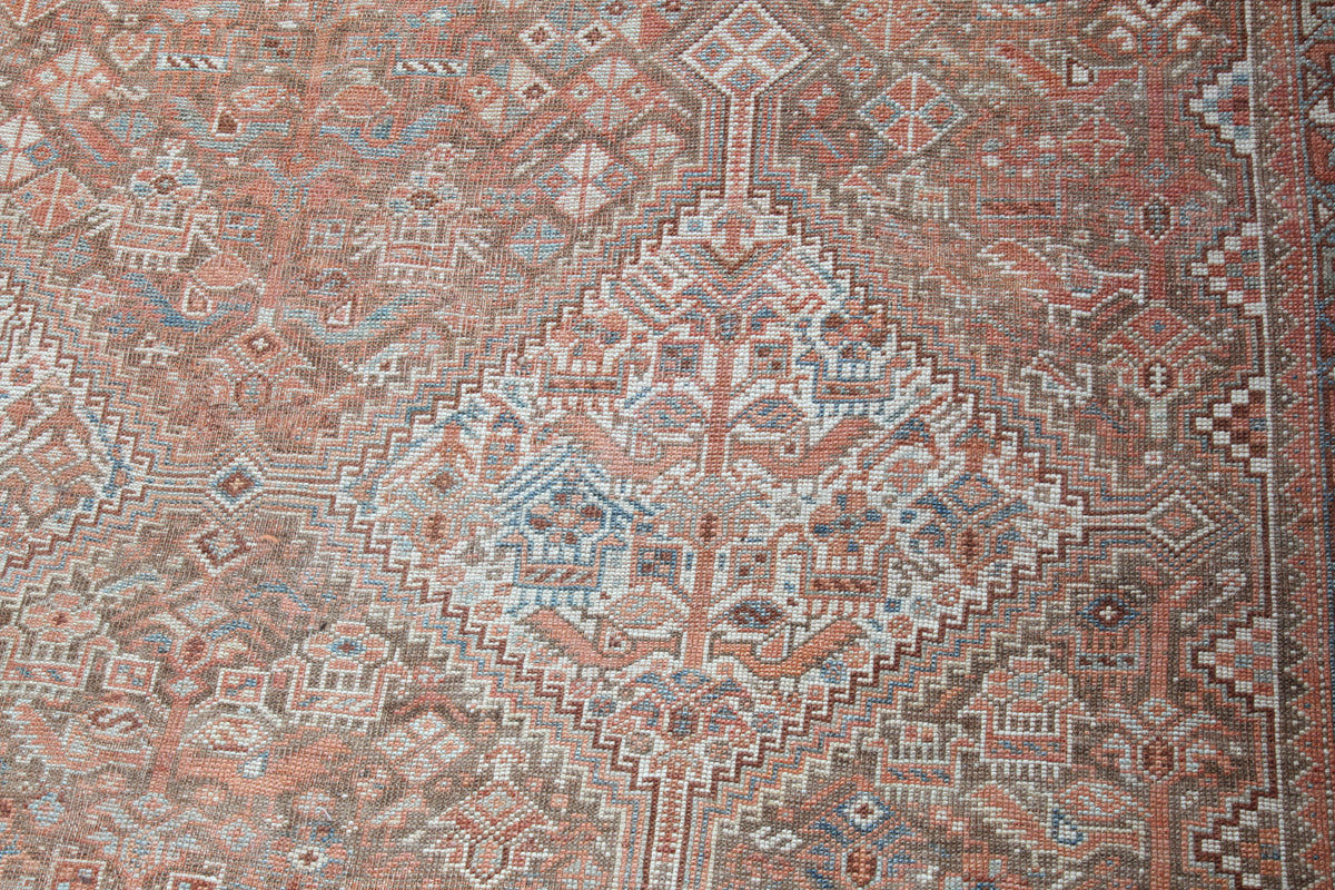 Originating from Shiraz, a city located in southern Iran, Shiraz carpets have a rich and ancient history that can be traced back to the 16th century. Woven by nomadic tribes in the region, these carpets are a reflection of their distinctive weaving techniques that have been passed down through generations. Influenced by the Safavid dynasty in Persia, Shiraz rugs often incorporate Turkish and Kurdish weaving styles and showcase designs from prominent tribes such as the Qashqai and Afshar. These carpets serve as a testament to the enduring legacy of nomadic craftsmanship, despite the passage of time and fluctuating socio-political landscapes. This carpet features a traditional folk-art design adorned with various animal motifs on a soft, muted background..