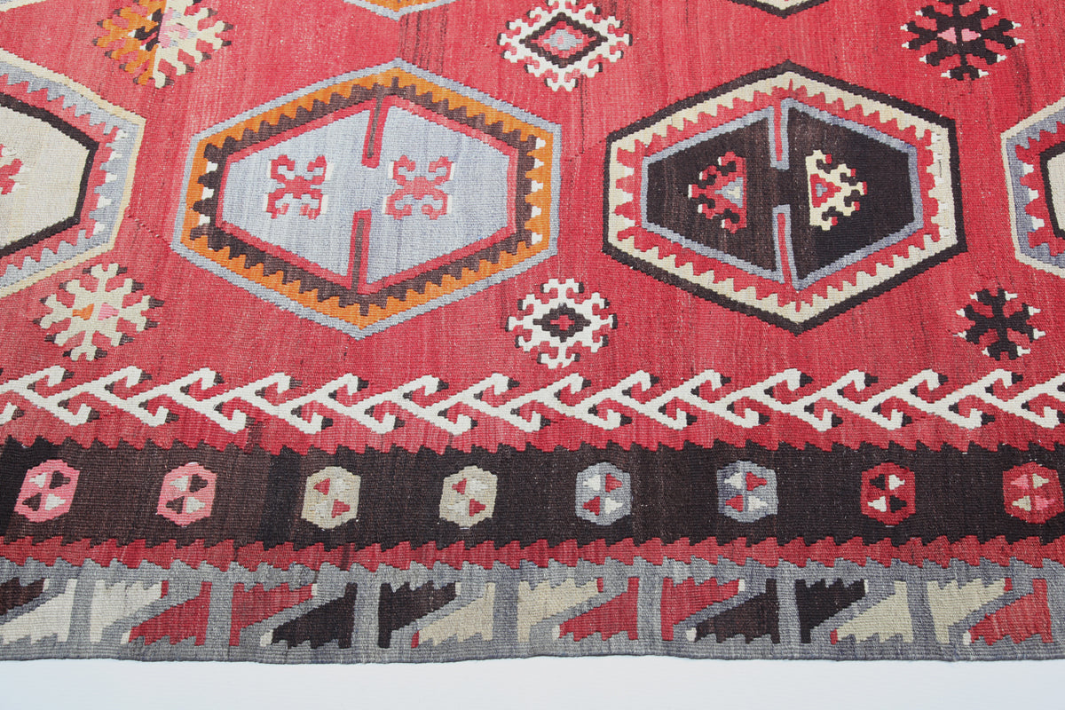 Sivas Sharkishla kilims are highly prized for their distinctive colors, typically featuring a unique madder root background, along with a soft texture, clear motif definition, and a rustic aesthetic that complements various decor styles. These kilims are exceptionally rare, as few have survived and they were never widely produced. Originating from Sivas, a region known for early Ottoman homes, these kilims were typically large—similar to Kumkapi and Ushak carpets—designed to suit the spacious interiors of these residences, unlike smaller village rugs.