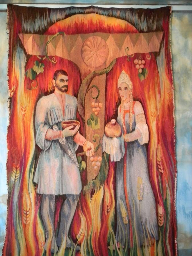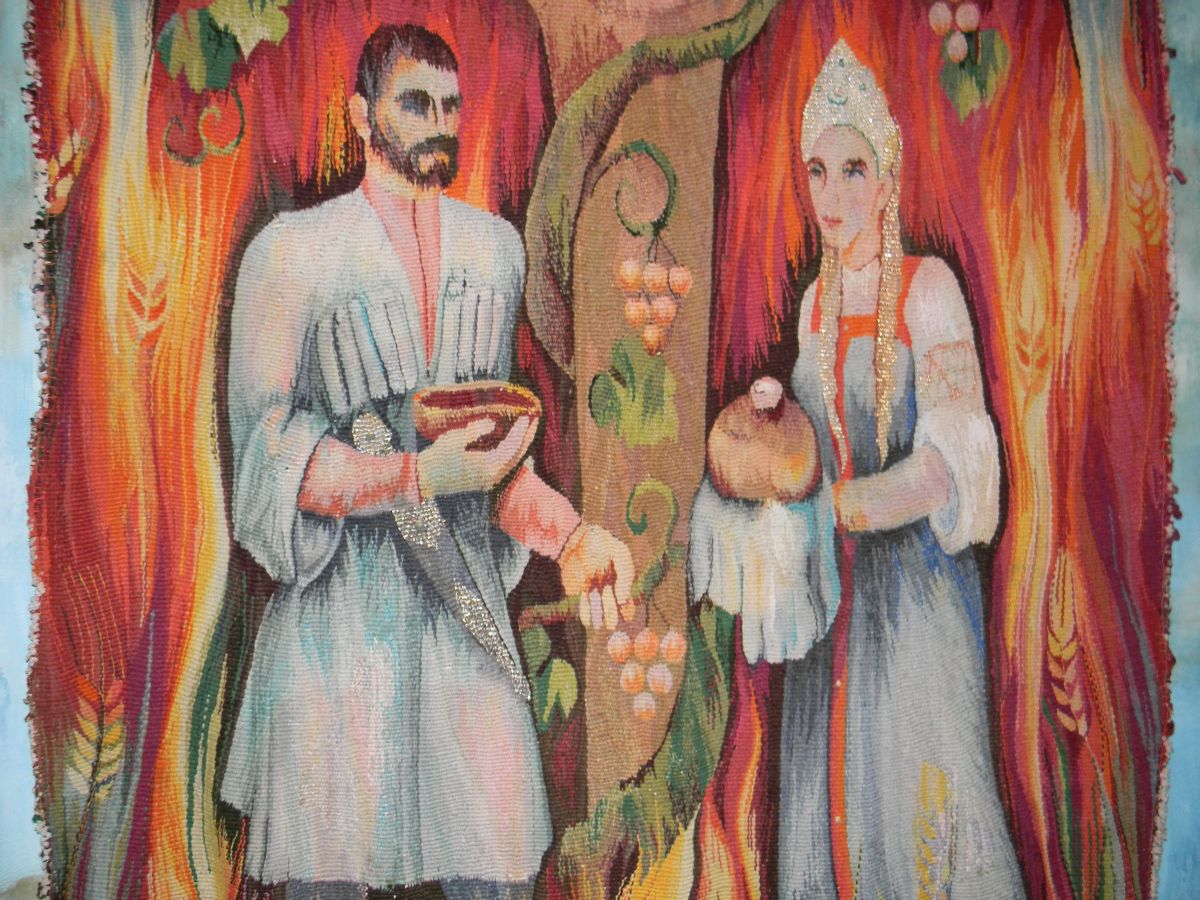 This tapestry was woven in the Tbilisi Academy of Arts in the Republic of Georgia during the rain of Lenin, circa early 20th century. It was woven to show the Bolshevik revolution within which due to collective farming there is peace and harmony. In the traditional welcoming ceremony of Russians, the lady is offering bread with salt to a Cossack. In the background, the grapevine is rising and all the different groups' tents are on top with the sun is rising on the top middle of the vine holder.
