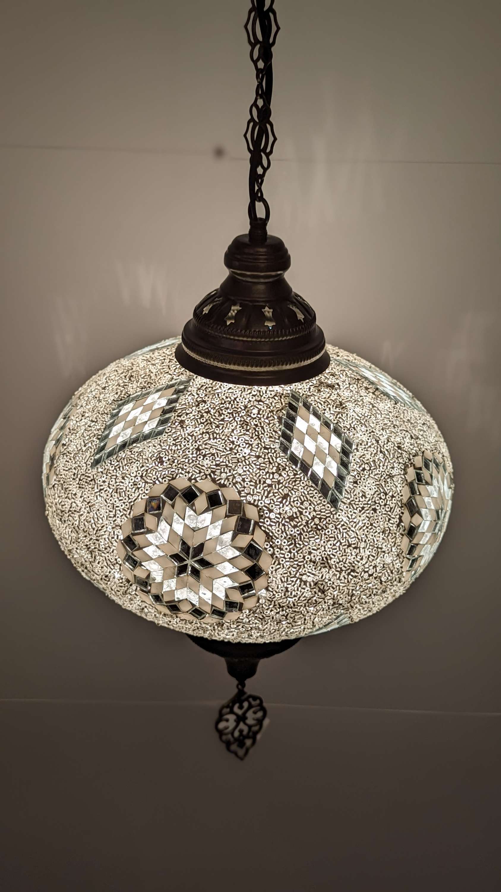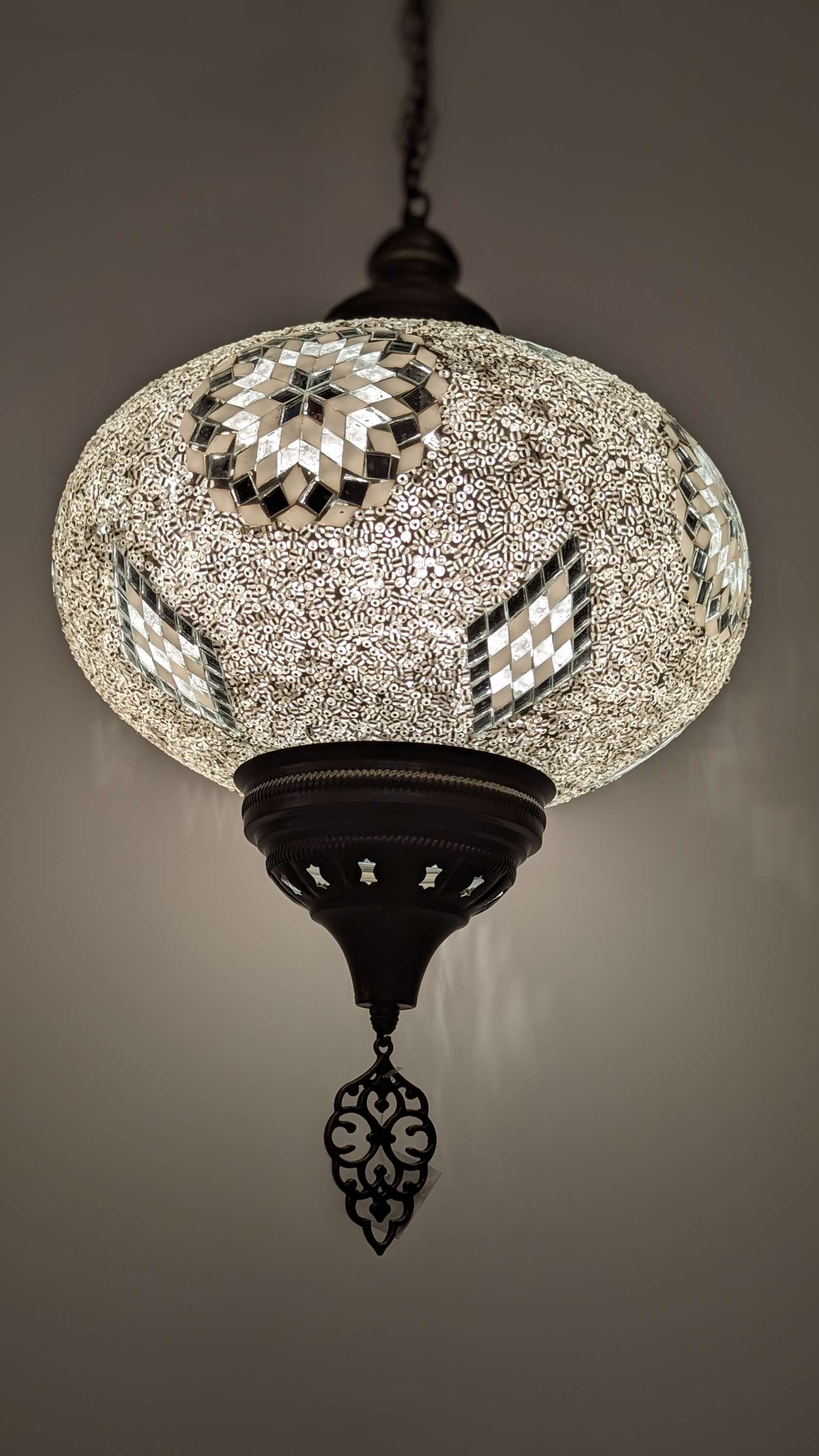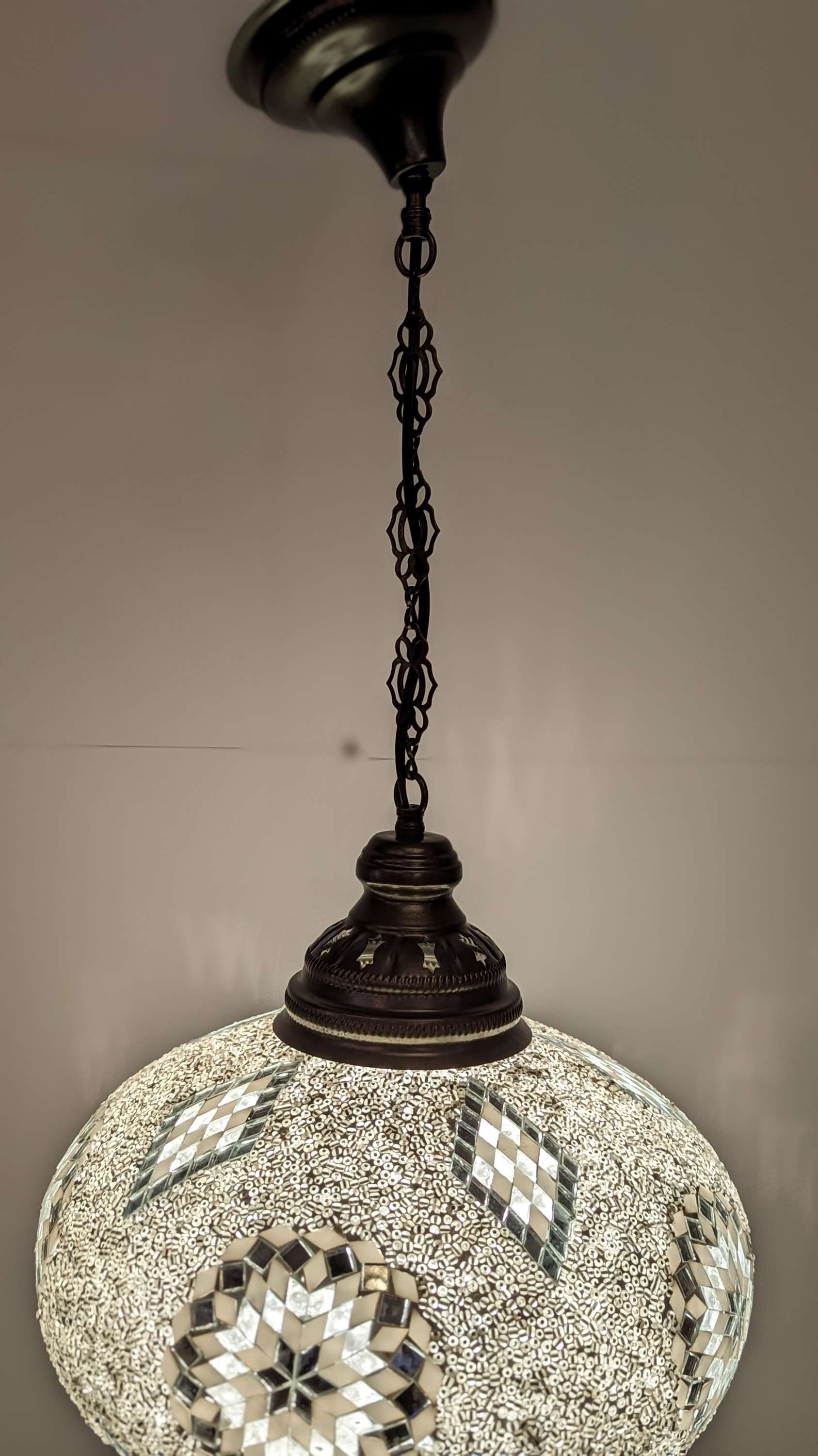 Our Turkish Hanging Lights feature a Bohemian glass core overlaid with hand cut glass and beads to form various mosaic designs. This process is entirely handmade which makes each piece unique. Even if one light features the same design and colors of another, they are never an exact reproduction of each other. Each metal frame is individually wheeled.