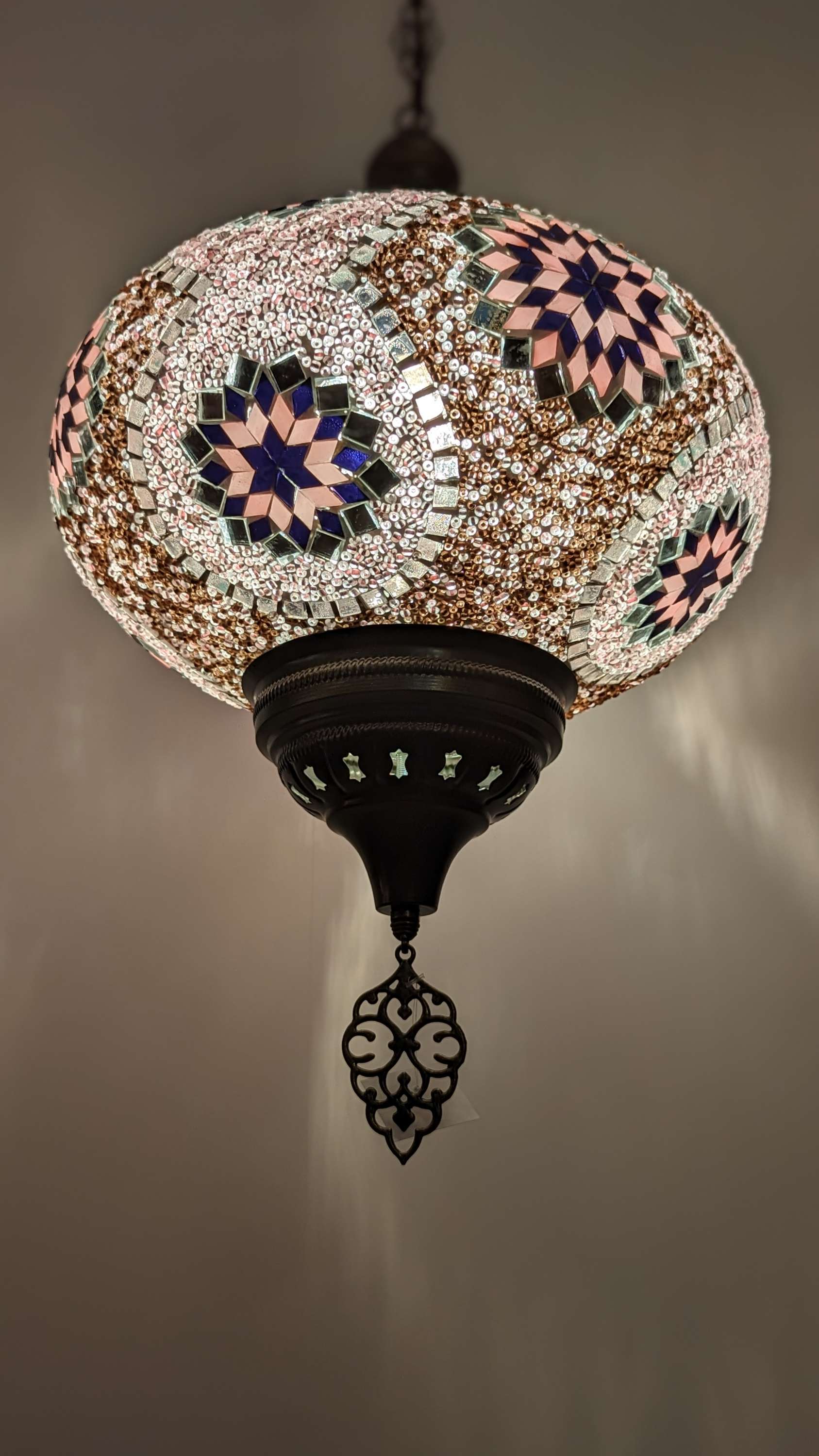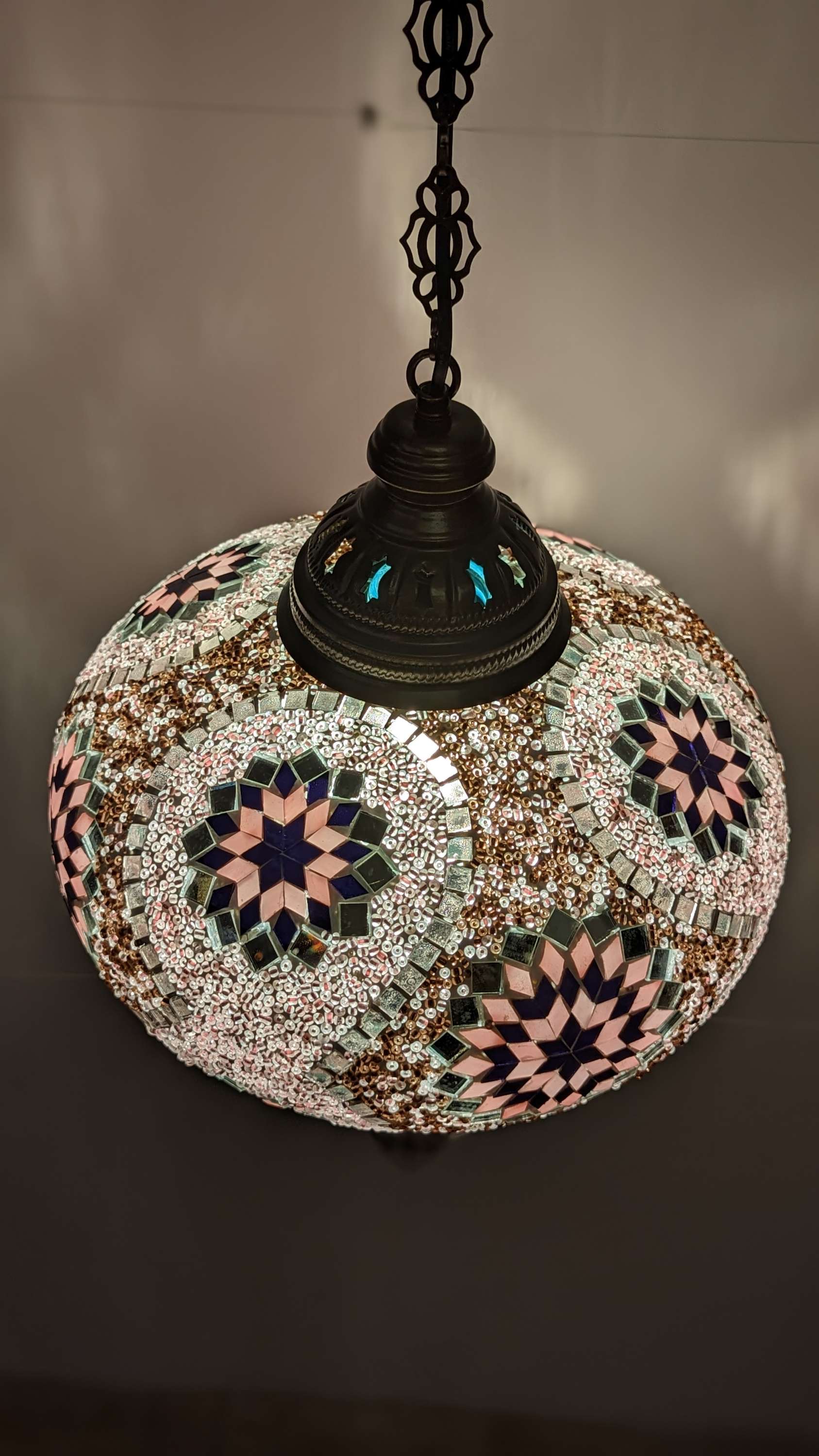 Our Turkish Hanging Lights feature a Bohemian glass core overlaid with hand cut glass and beads to form various mosaic designs. This process is entirely handmade which makes each piece unique. Even if one light features the same design and colors of another, they are never an exact reproduction of each other. Each metal frame is individually wheeled.
