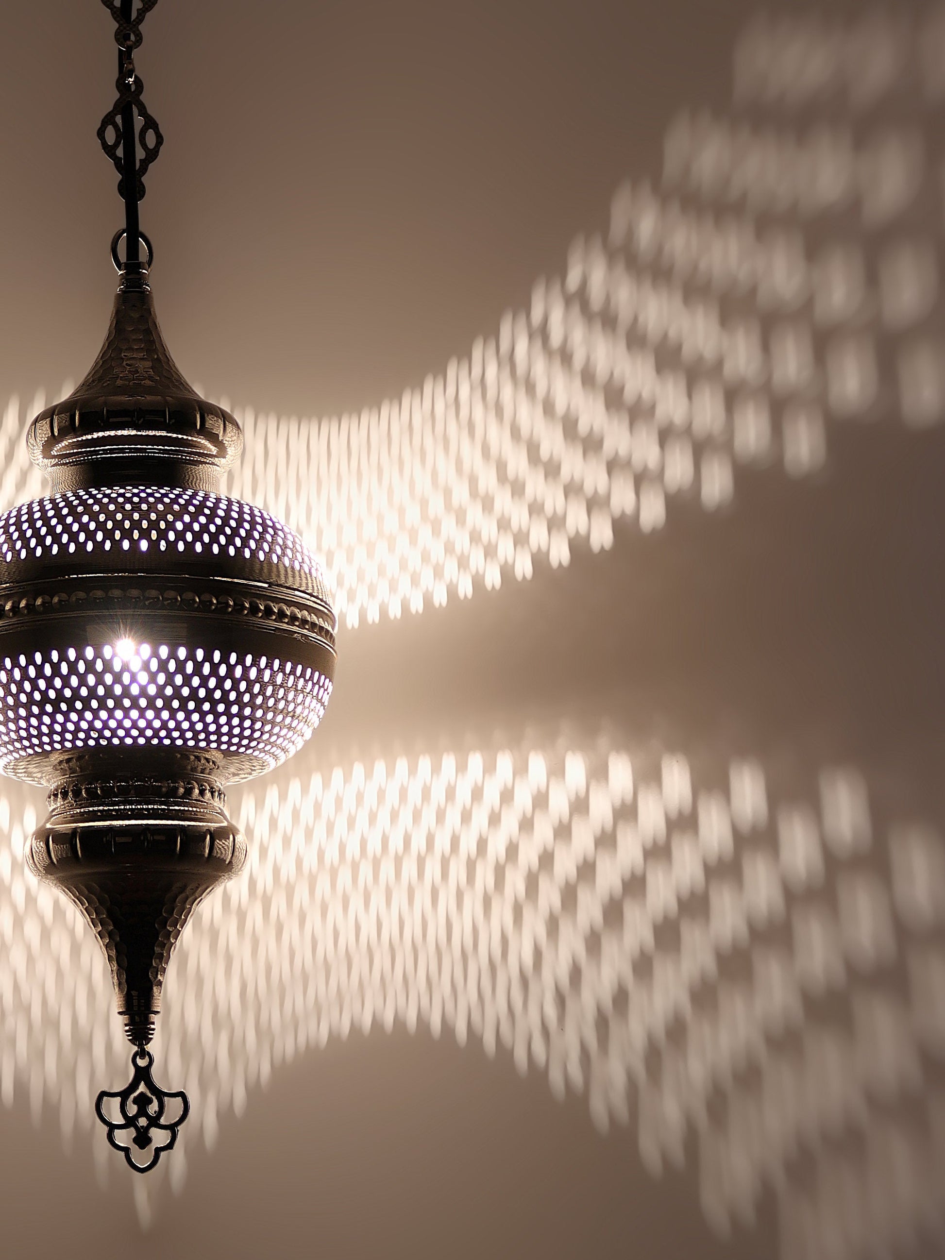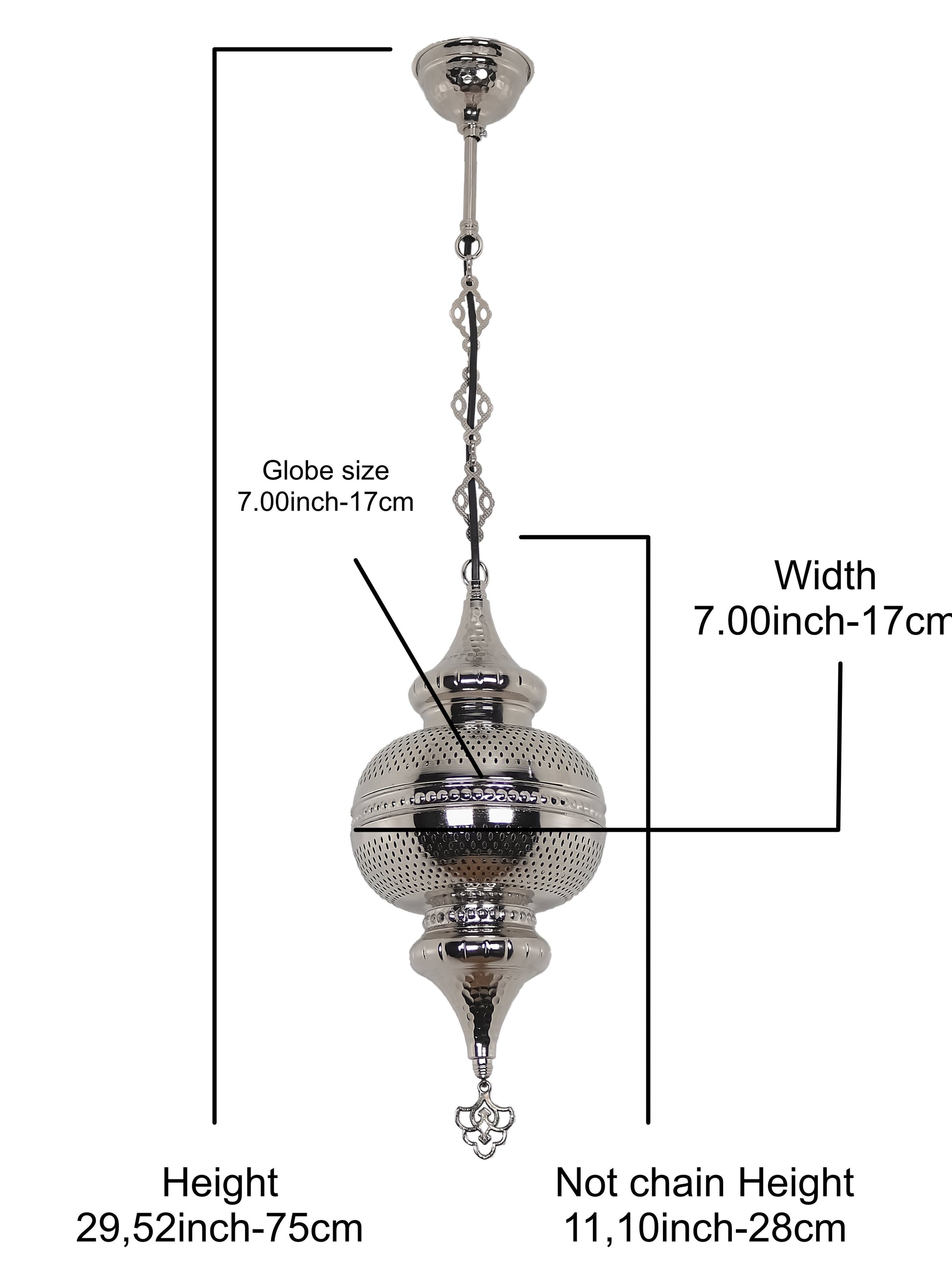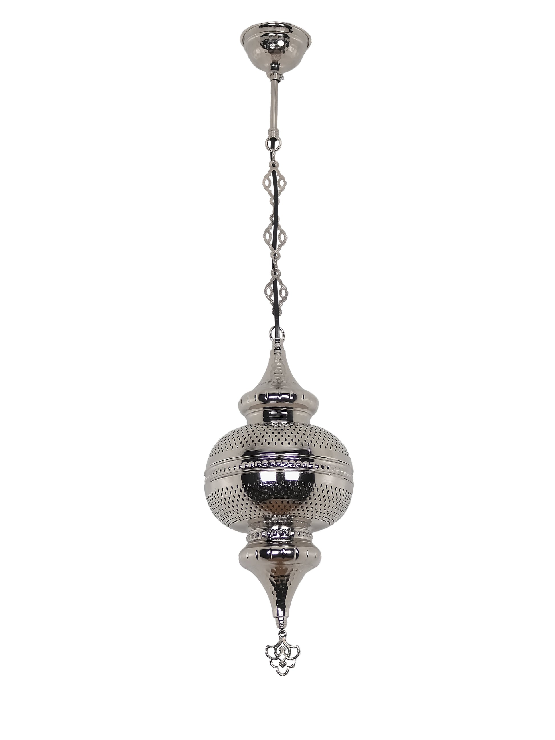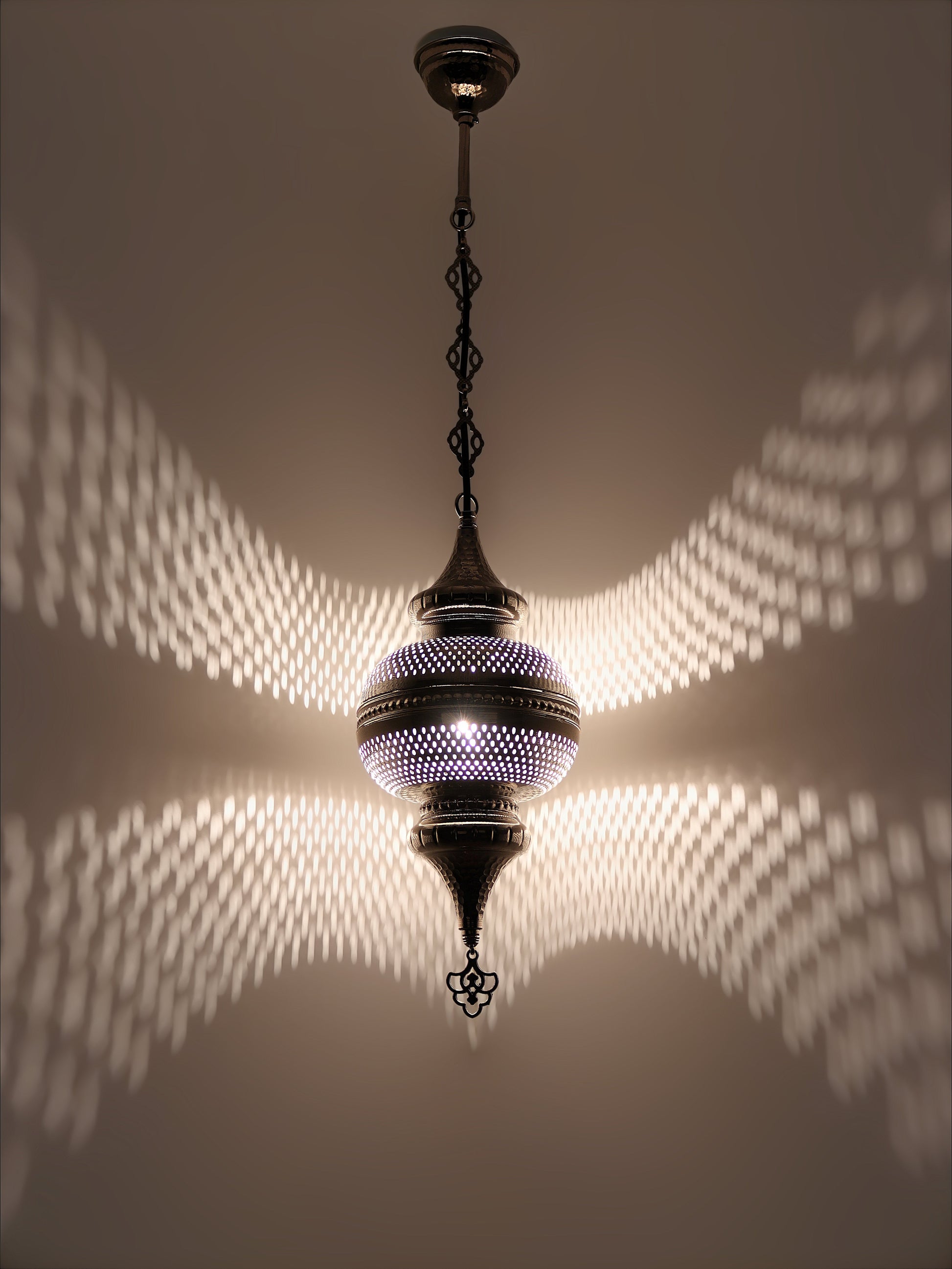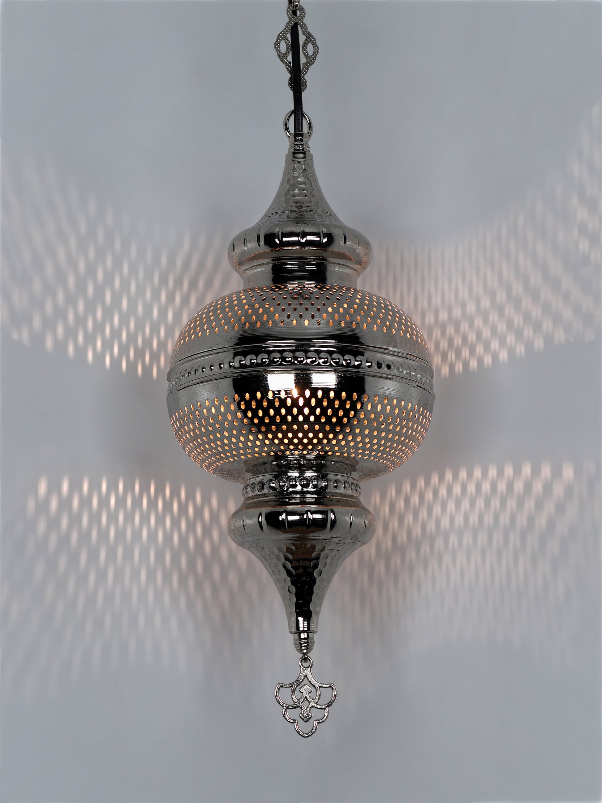 This Moroccan brass-finished hanging pendant light showcases intricate hand-pierced metalwork inspired by traditional Islamic art and geometric patterns. When illuminated, it casts stunning, delicate shadows that transform any space into an inviting sanctuary. Expertly crafted and assembled in Turkey, this lamp blends authentic artisanal techniques with quality electrical wiring to ensure safety and durability. Ideal for enhancing the ambiance of living rooms, reading nooks, or meditation areas, it provides a soft, warm glow that promotes relaxation and tranquility. This lamp not only serves as functional lighting but also as a captivating piece of cultural décor.
