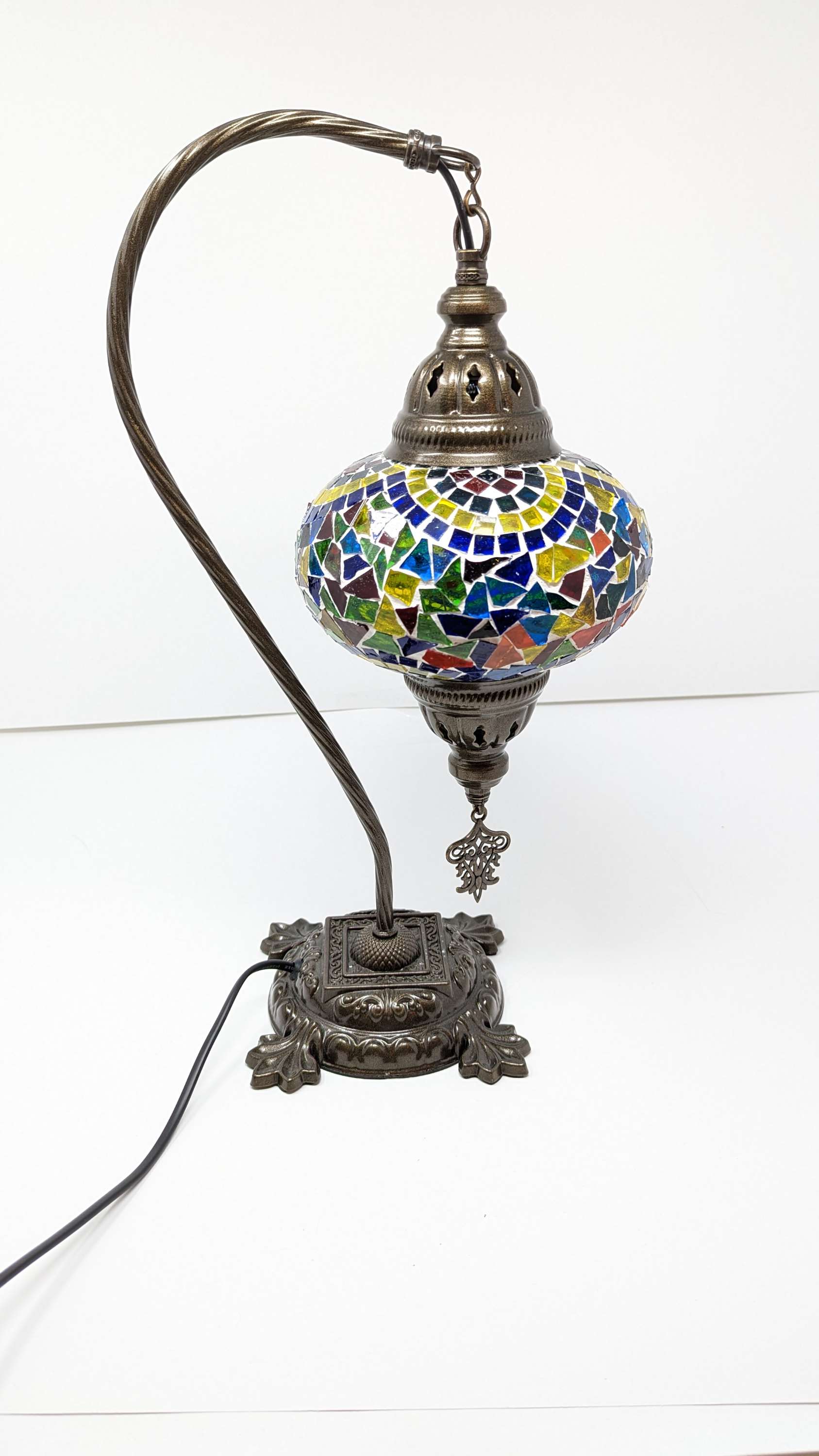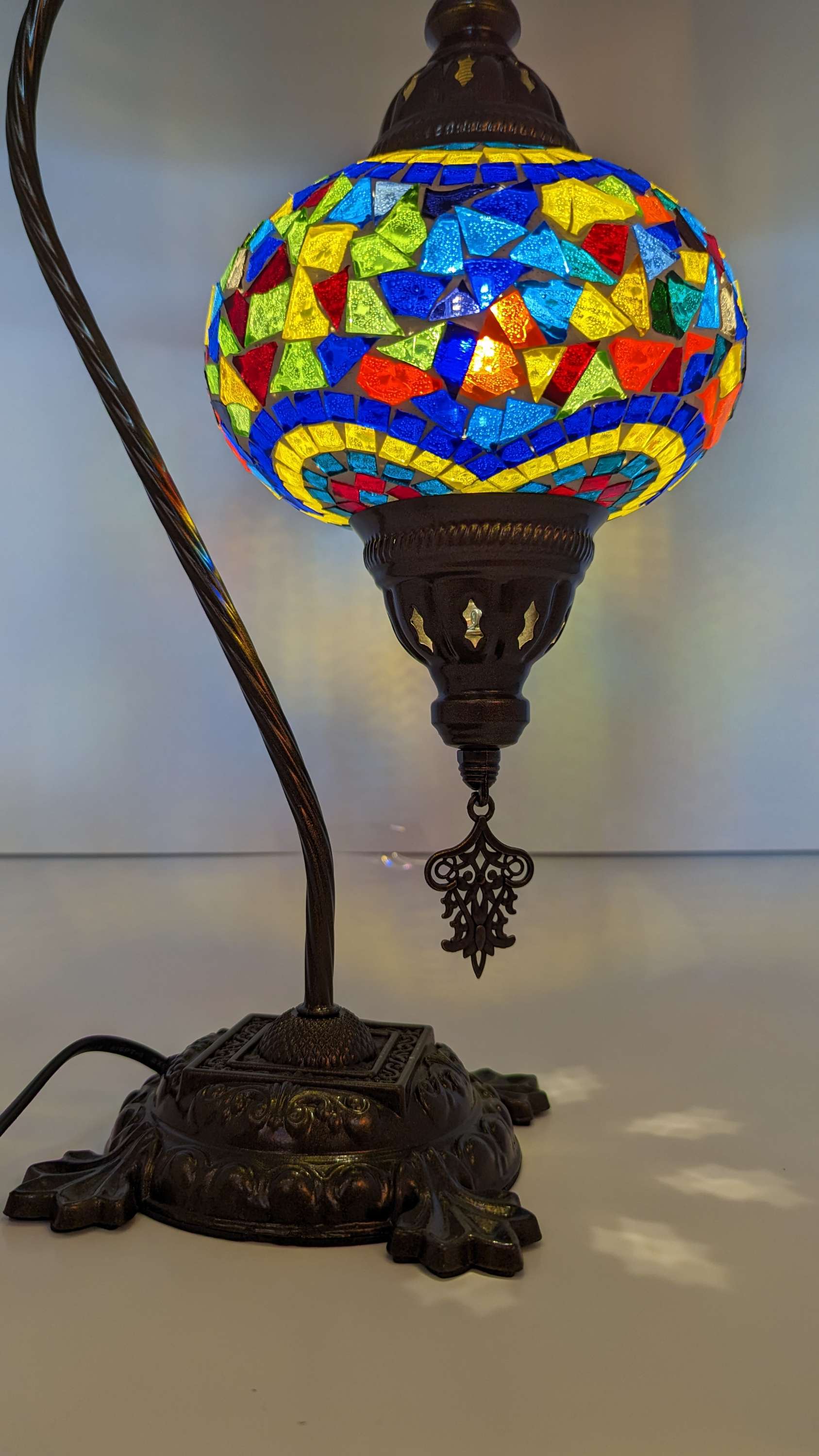 Our Turkish Mosaic Glass Table Lamps feature exquisite Bohemian glass globes decorated with meticulously hand-cut glass pieces and beads, creating detailed mosaic designs that reflect traditional craftsmanship. Each lamp is carefully handmade, ensuring every piece is unique, with no two lamps being exactly alike—even when sharing similar patterns and colors. The metal frames are individually crafted and shaped with precision, especially on larger models, enhancing durability and aesthetic appeal. Our lamps are made in Turkey only after an order is placed, guaranteeing quality and authenticity. The glass globes used are significantly heavier and more robust than standard market offerings, designed to provide lasting beauty instead of delicate fragility. In the unlikely event your lamp is damaged during shipping, please notify us immediately so we can arrange a replacement. Despite recent increases in material costs by 15% to 25%, we remain committed to offering these artisan creations at accessible prices without compromising on quality.