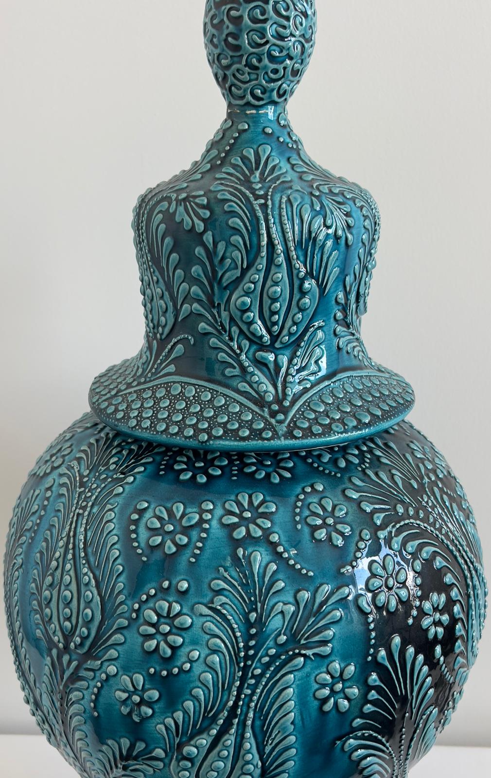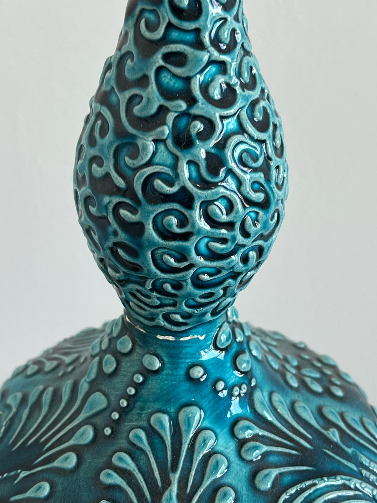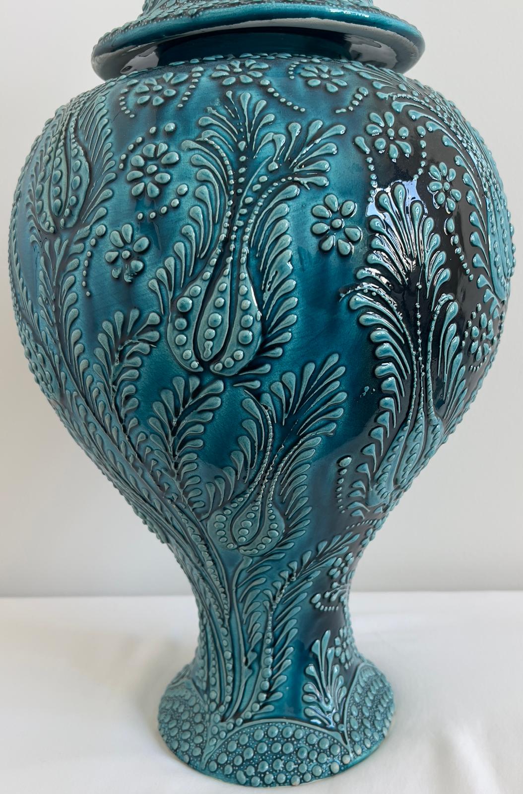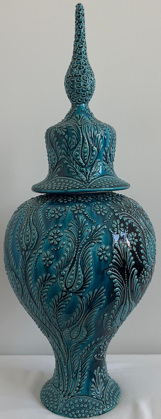 King's Jar was expertly handcrafted in Kütahya, Turkey. It features a turquoise glaze and is fired at a high temperature for approximately 18 hours, followed by a slow cooling process to ensure durability and prevent damage. However, while transporting, the pointy tip was broken. I have restored the section, which you could see in the pictures. Each piece is unique.