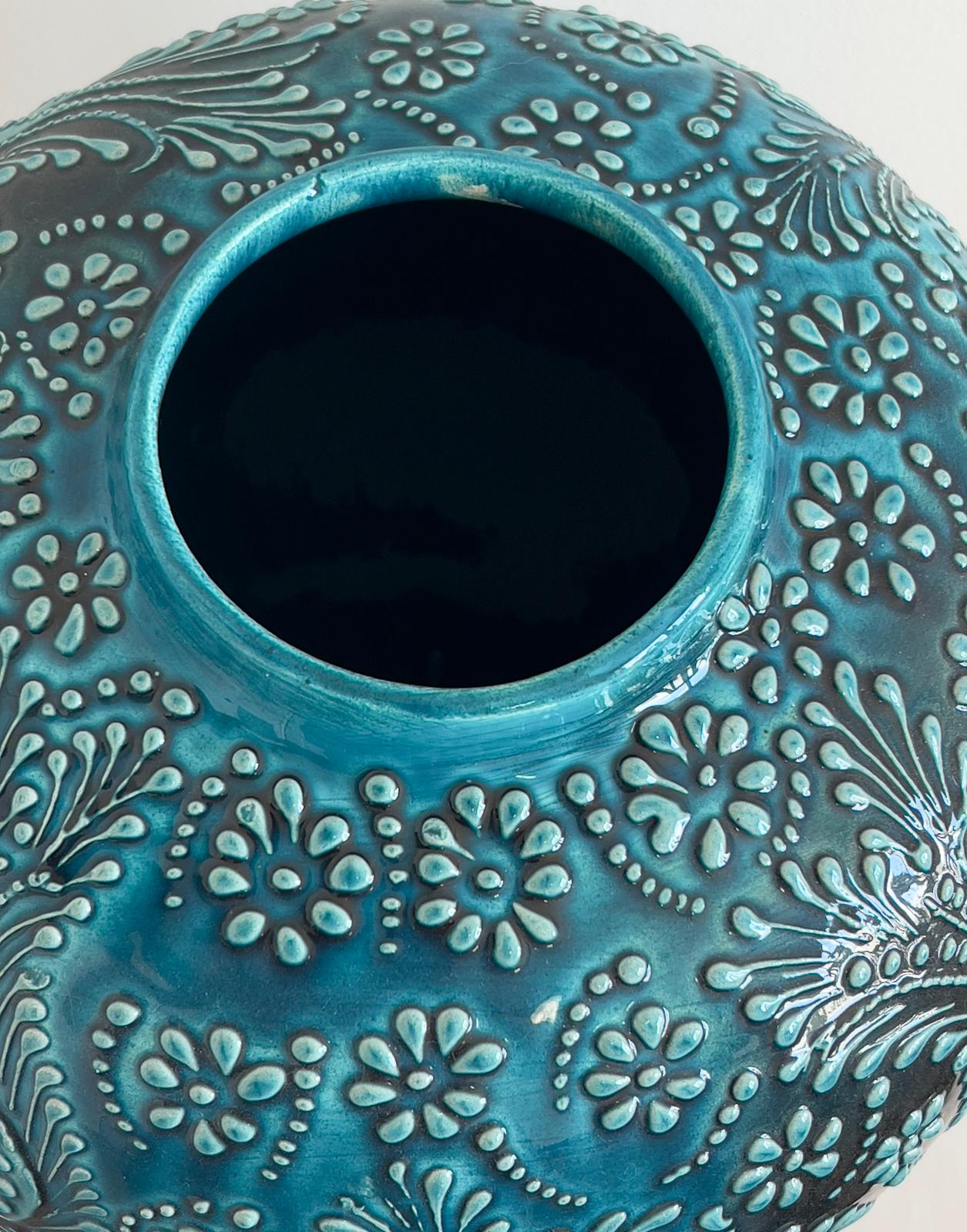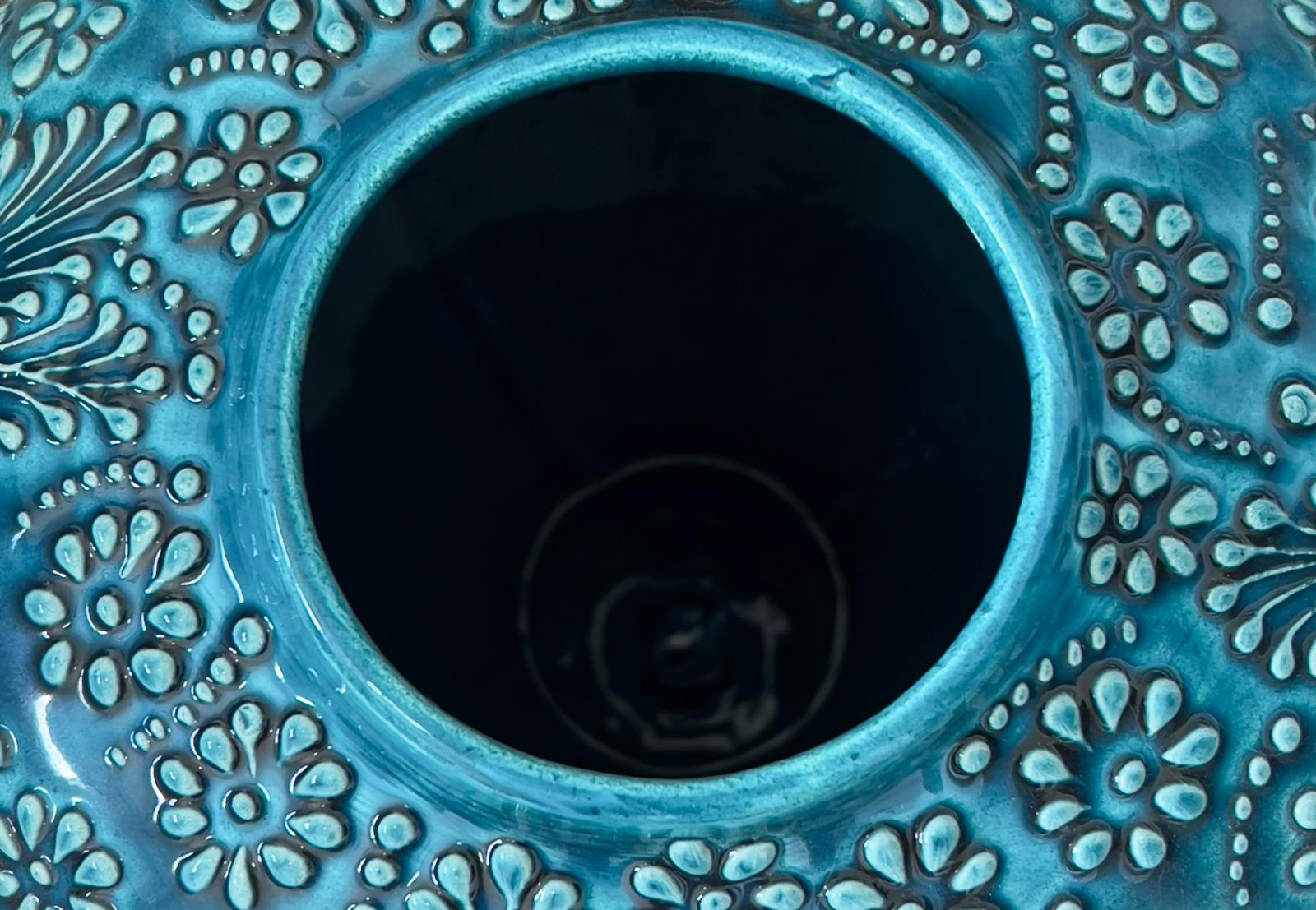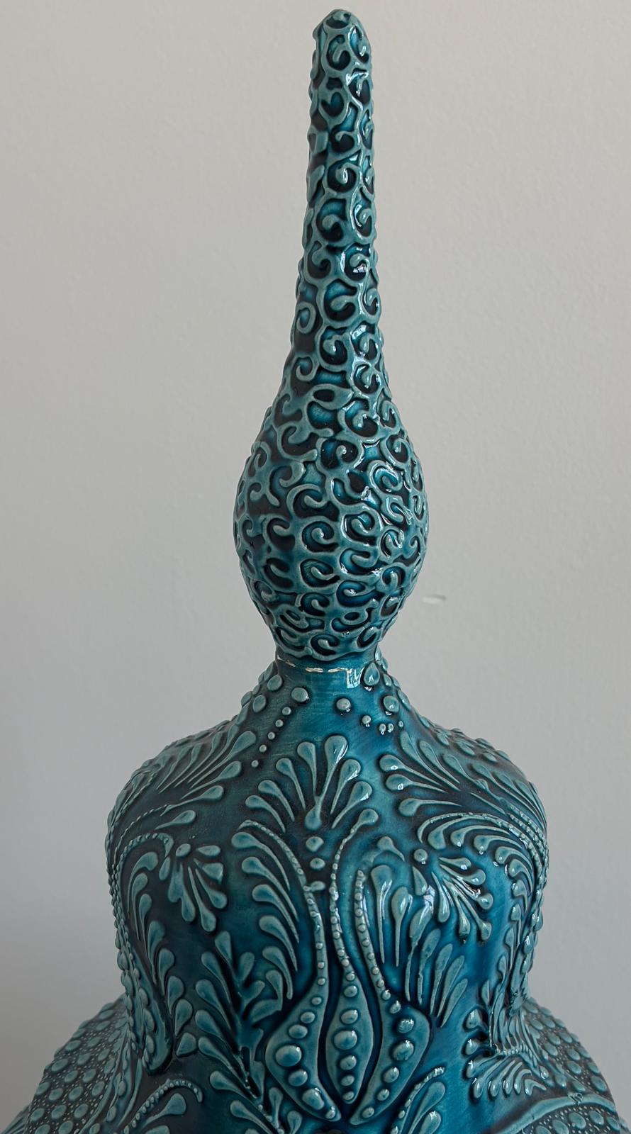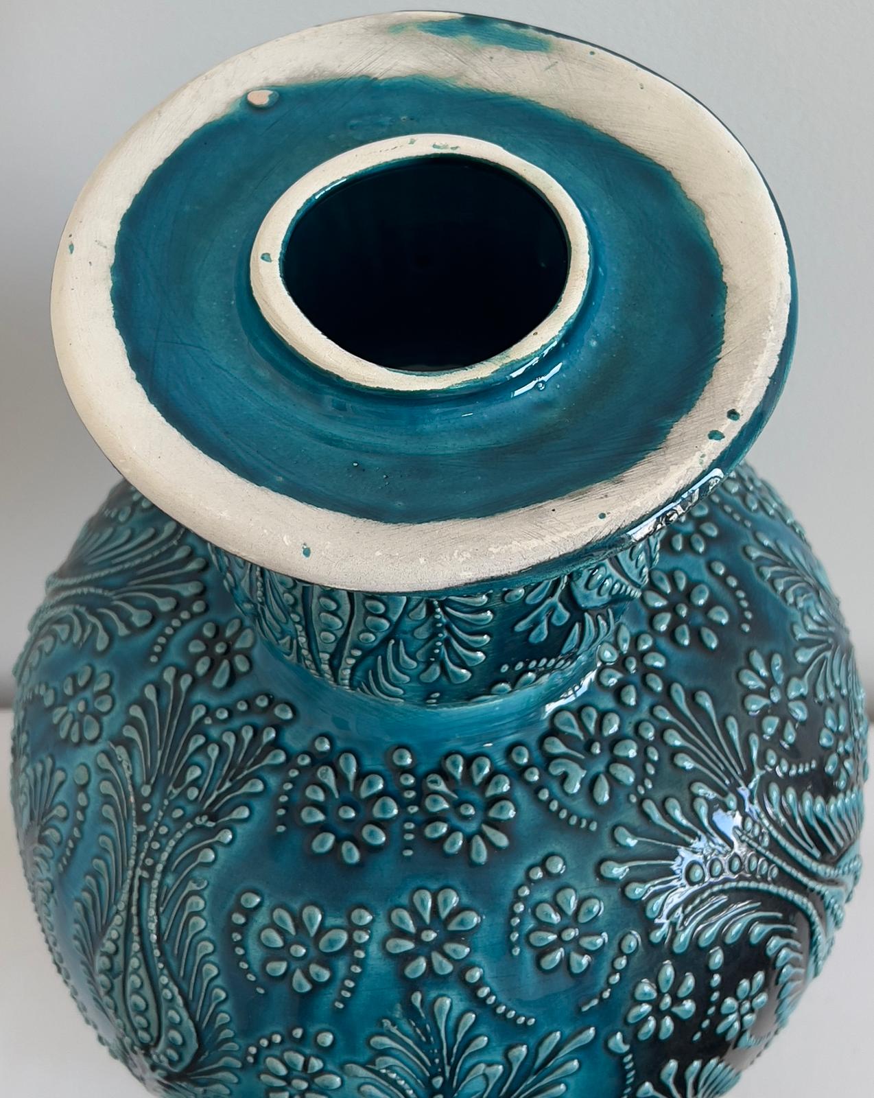 King's Jar was expertly handcrafted in Kütahya, Turkey. It features a turquoise glaze and is fired at a high temperature for approximately 18 hours, followed by a slow cooling process to ensure durability and prevent damage. However, while transporting, the pointy tip was broken. I have restored the section, which you could see in the pictures. Each piece is unique.