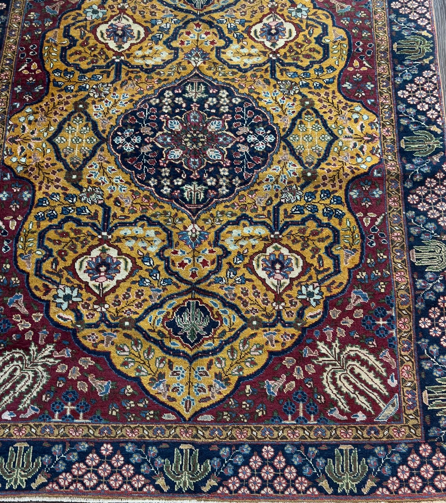 This Tabriz rug is unique and distinctive from others of its kind. The patterns and colors of this particular rug are exceptionally uncommon. The border and corners of the main field are adorned with weeping willows, known to symbolize endurance, resilience, and emotional strength. These trees have the ability to withstand hardship and represent survival and rebirth. This antique Mesopotamian Tabriz rug boasts several nature-inspired symbols. With its origins dating back to the early 20th century, the rug's edges have been expertly bound. The balance of madder root, saffron, and indigo dyes is flawless.