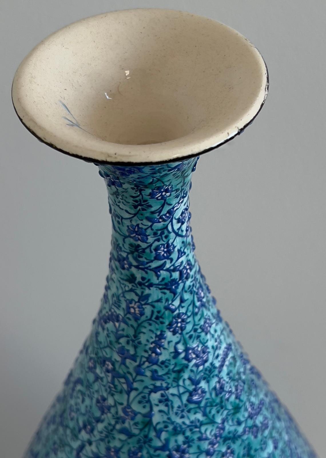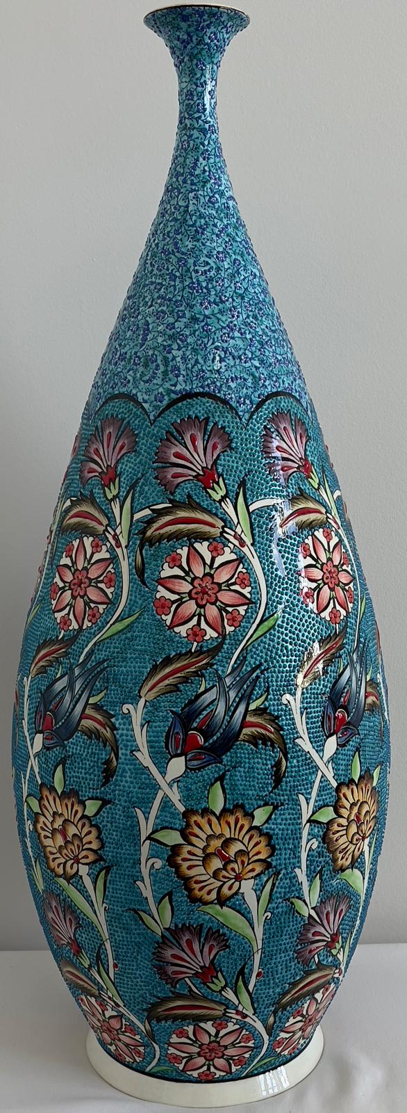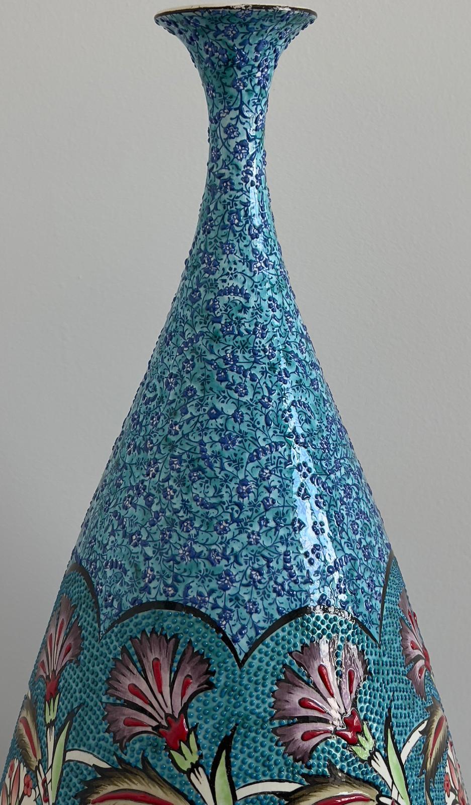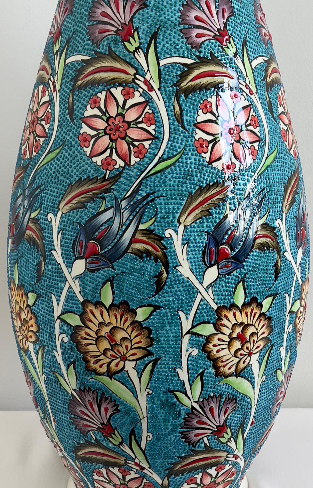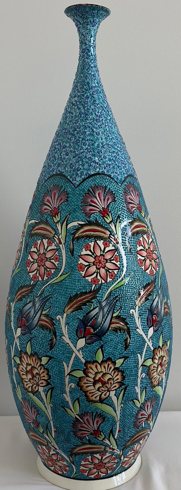 This bulbous vase is expertly handcrafted in Kütahya, Turkey. It features a turquoise glaze and is fired at a high temperature for approximately 18 hours, followed by a slow cooling process to ensure durability and prevent damage. Each piece is unique.