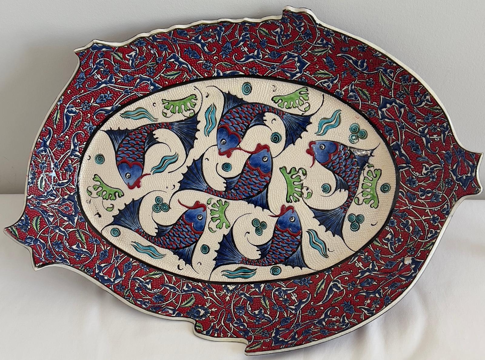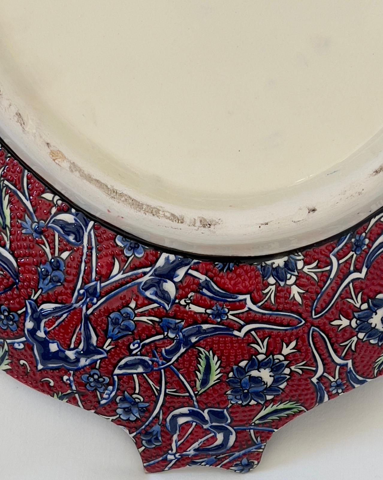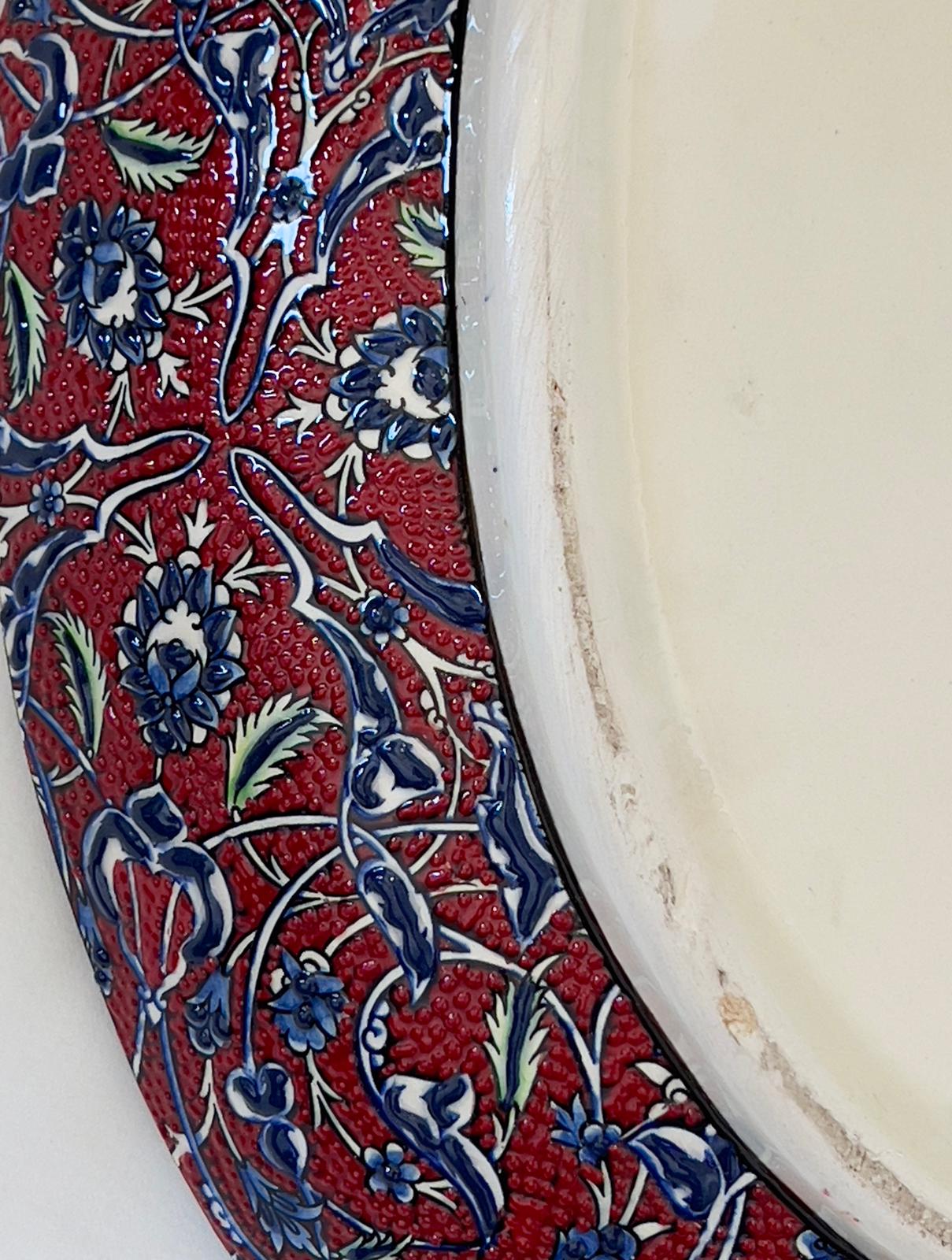 This Kütahya serving platter from Turkiye is handcrafted, glazed, and fired at high temperatures for about 18 hours, then slowly cooled to enhance durability and reduce the risk of damage. It features a subtle color flow beneath the glaze, making each piece one of a kind.