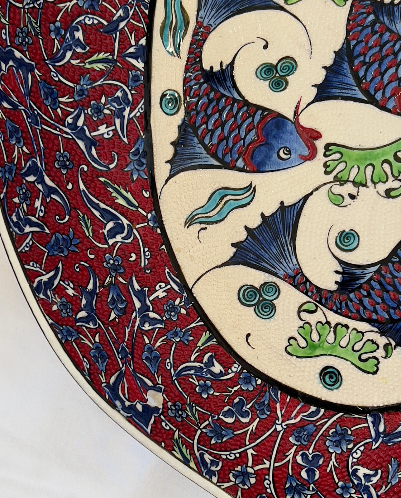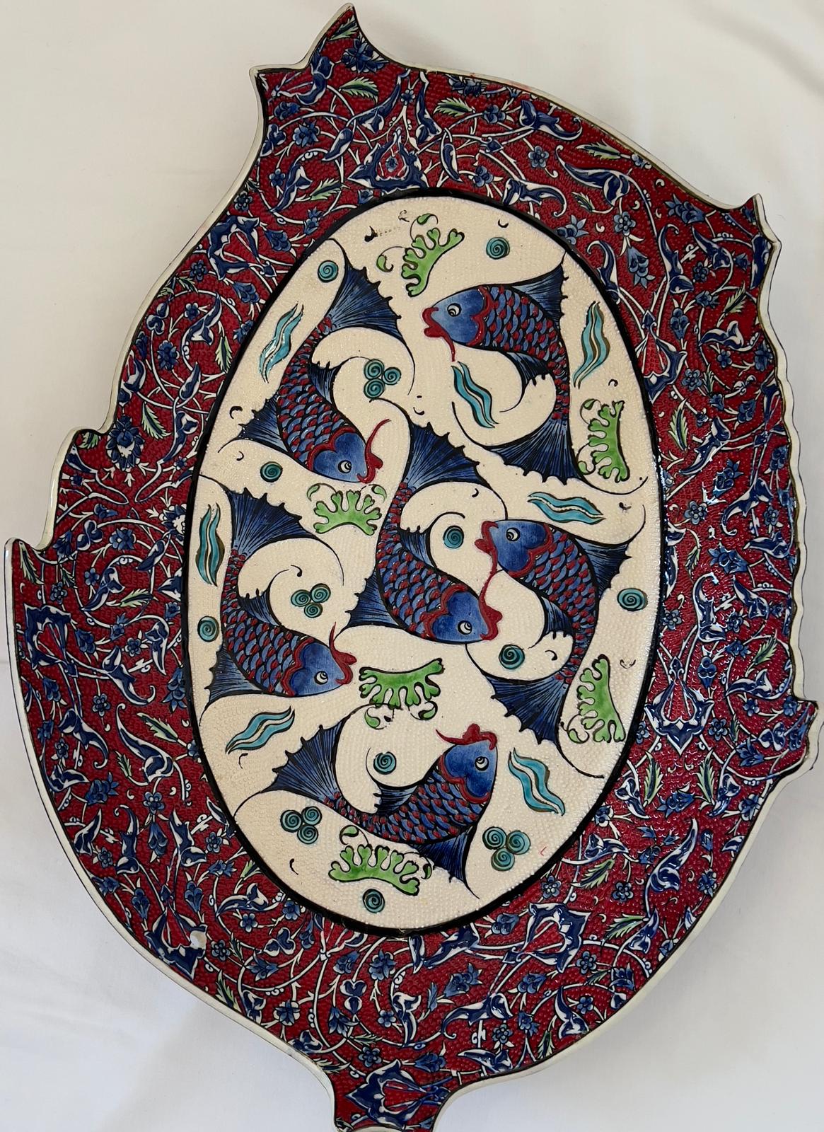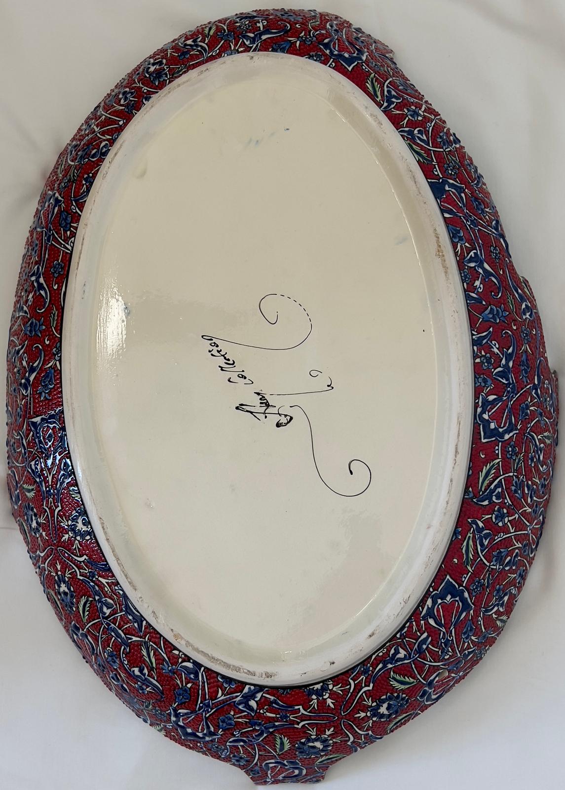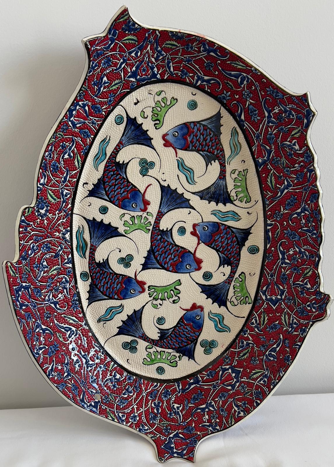 This Kütahya serving platter from Turkiye is handcrafted, glazed, and fired at high temperatures for about 18 hours, then slowly cooled to enhance durability and reduce the risk of damage. It features a subtle color flow beneath the glaze, making each piece one of a kind.