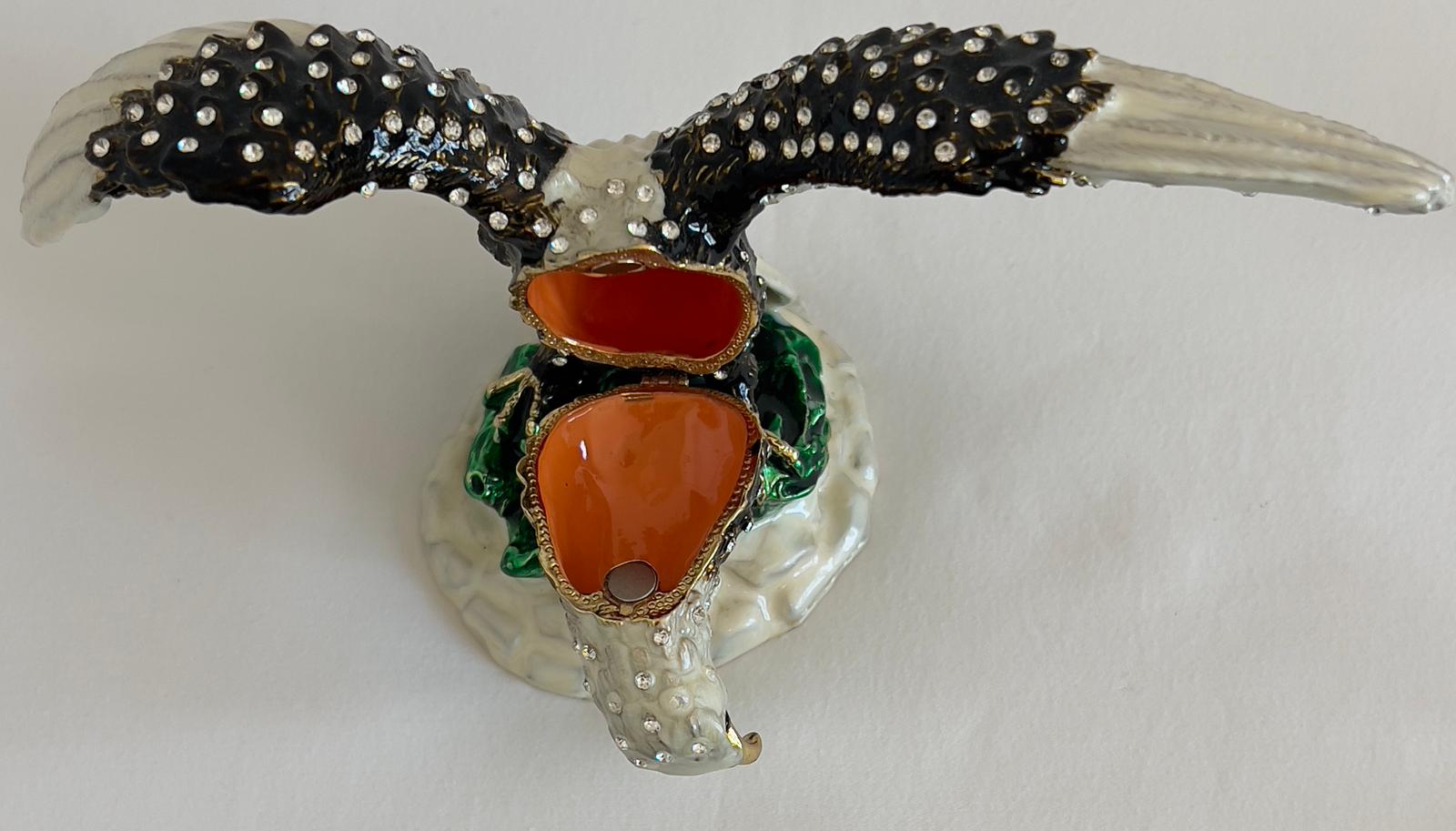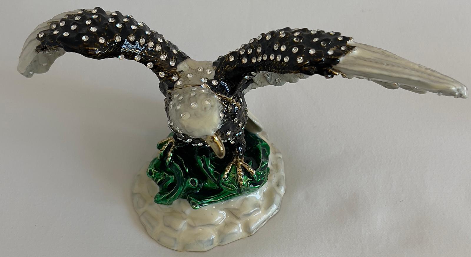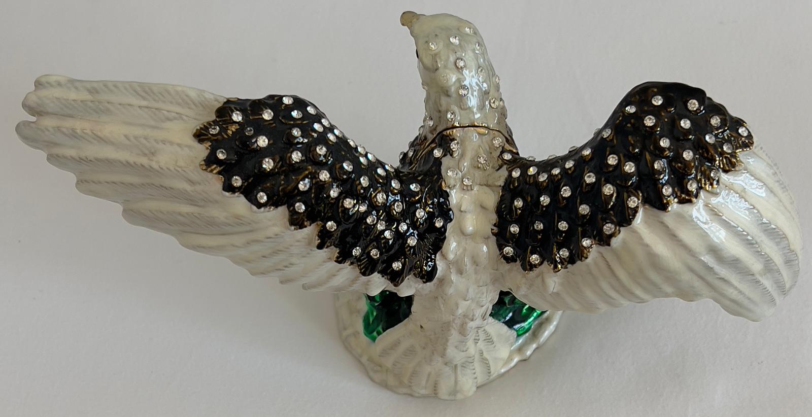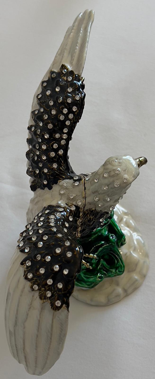 This exquisite jewelry box, crafted from bronze, features a striking eagle design embellished with Swarovski style stones. Perfect for safely storing your treasured rings, earrings, or other small keepsakes, it combines durability with refined elegance. Its compact size allows for versatile placement on a dresser or bedside table, while the detailed craftsmanship adds a distinguished touch to your décor. Ideal for collectors or those seeking a unique trinket box, this piece offers both practicality and a sophisticated statement of style.