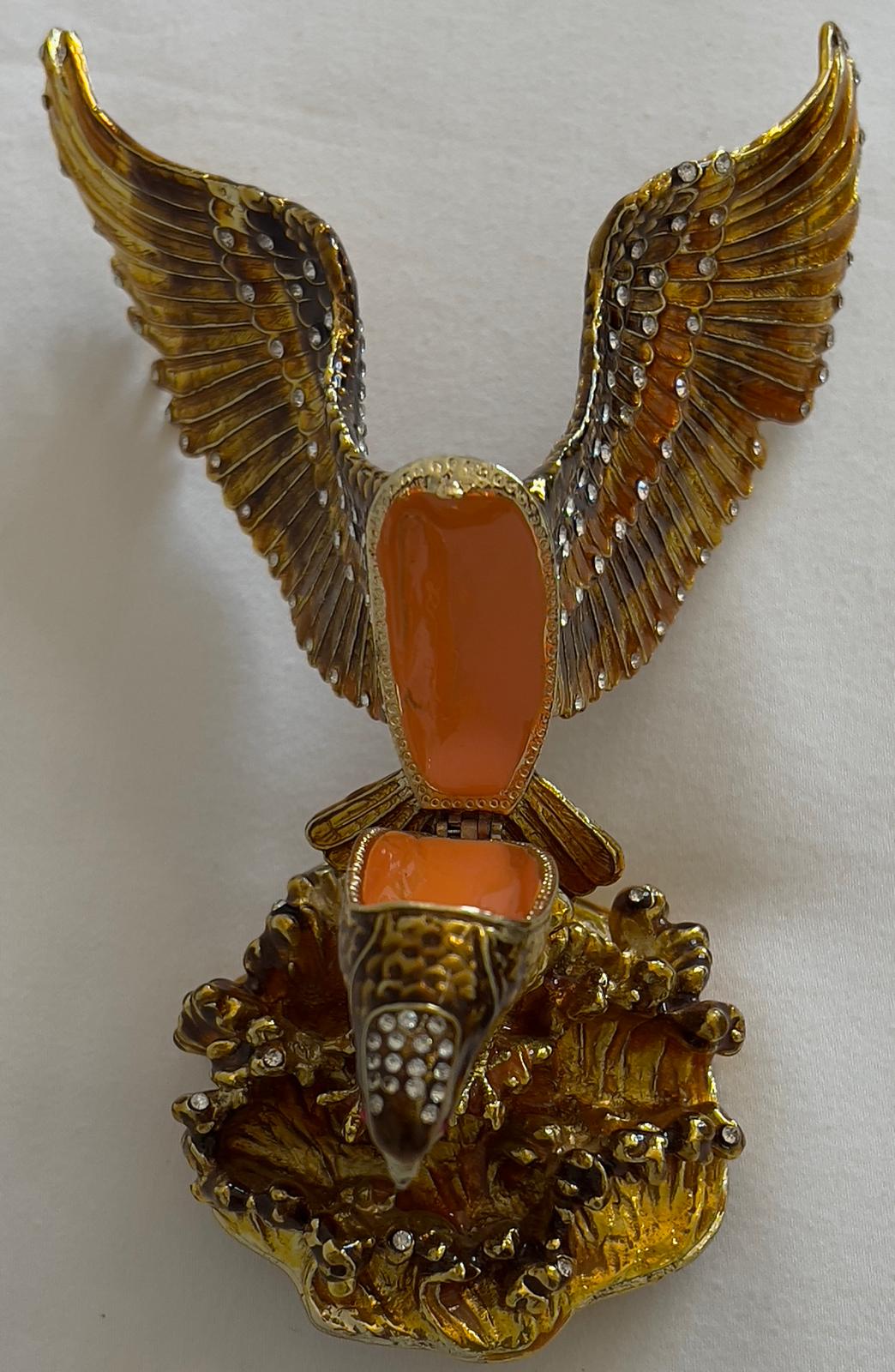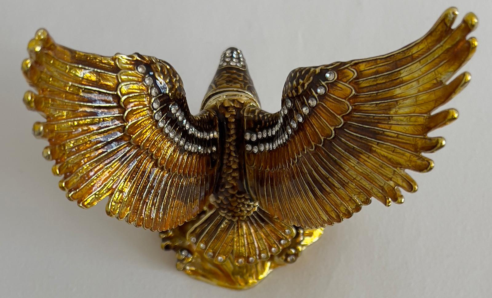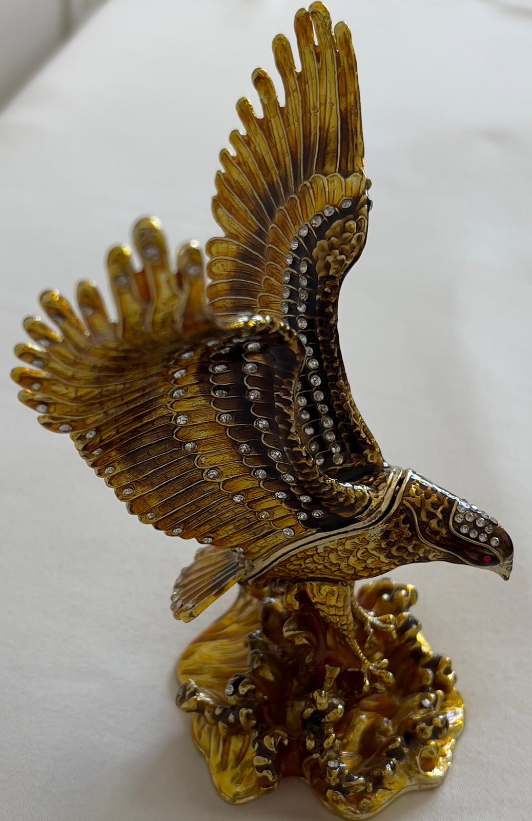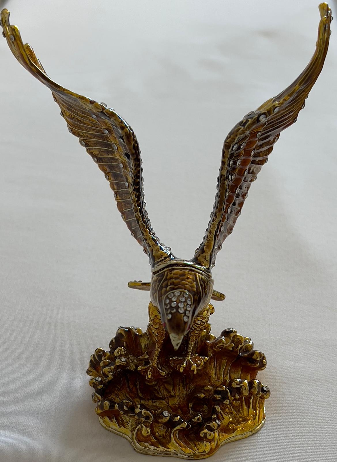 This finely crafted bronze jewelry box showcases a stunning golden eagle motif adorned with Swarovski-style crystals. Designed to securely hold rings, earrings, and small valuables, it blends sturdy construction with elegant detail. Its compact dimensions make it suitable for any dresser or nightstand, while the intricate design enhances your interior decor. An excellent choice for collectors or anyone in need of a distinctive trinket container, this piece delivers both functional use and a refined aesthetic presence.
