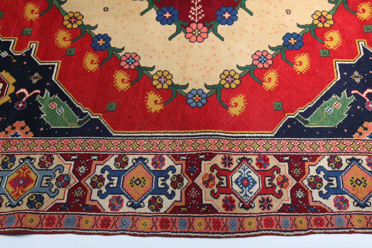 Since the 11th century, the city of Pergamum, now Bergama, Turkey, has been renowned for its traditional carpet weaving techniques. These carpets are characterized by vibrant hues, geometric patterns, and a lustrous texture achieved through traditional color choices. Thanks to the resurgence of madder root as a natural dye in the late 1970s, hand-knotted rugs have seen a revival in the use of vegetable dyes. This particular carpet is a prime example of this process.