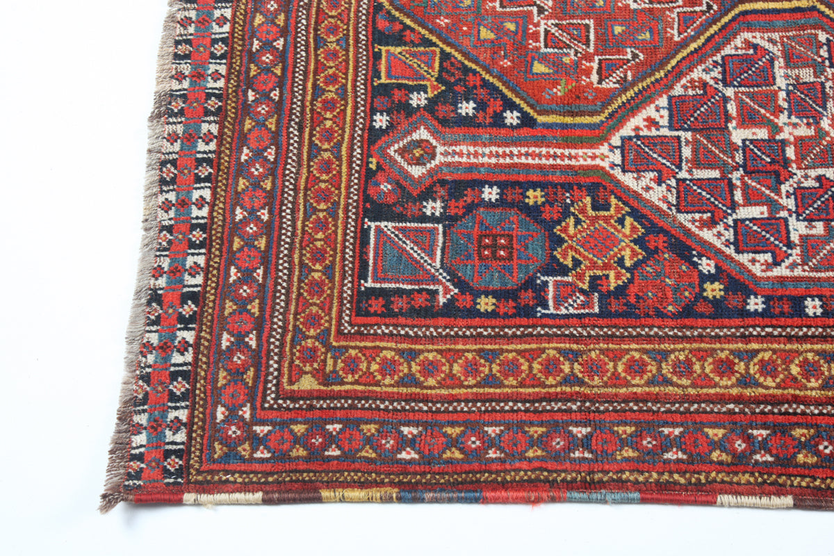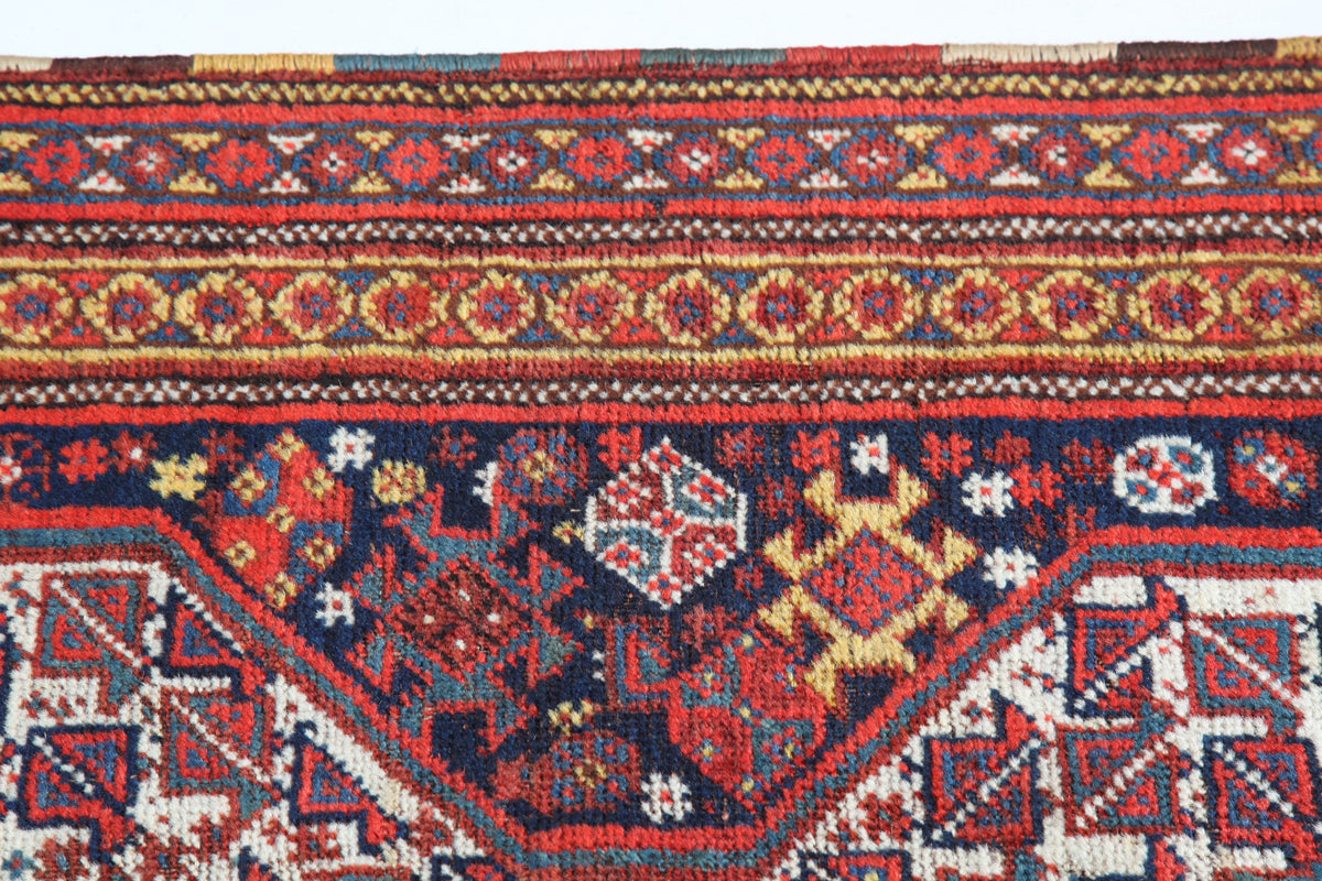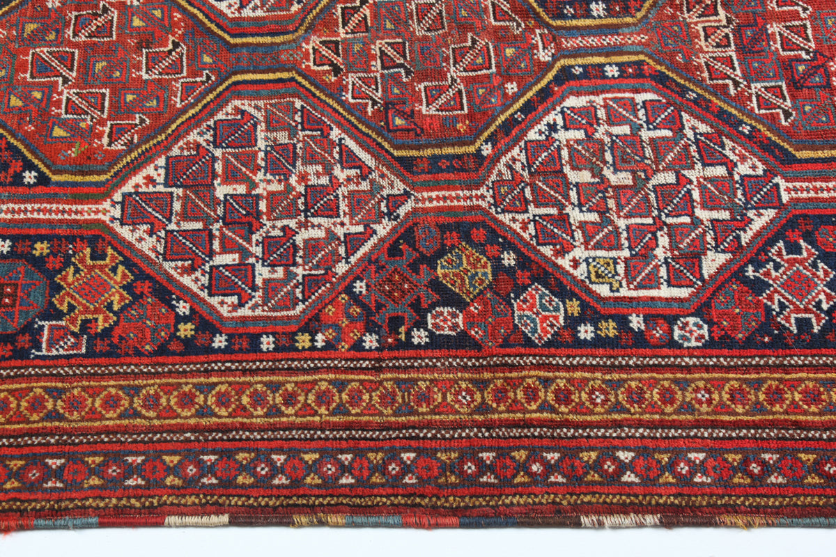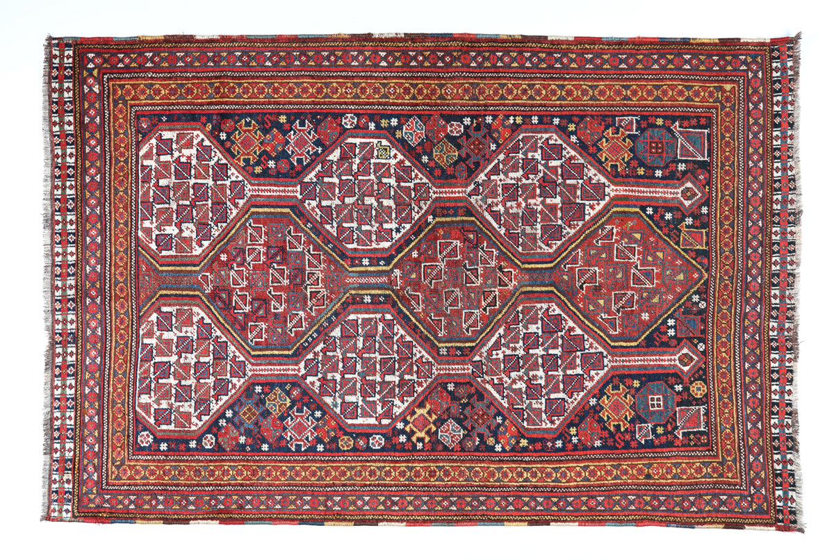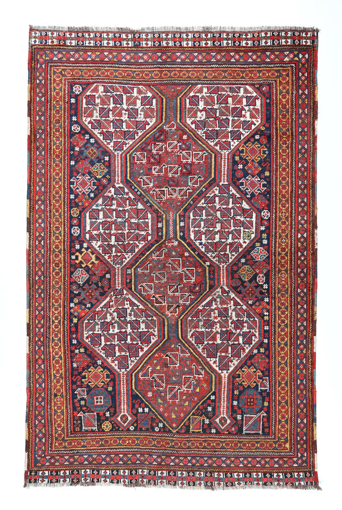 Hailing from Shiraz, a city in southern Iran, Shiraz rugs have a long and storied history dating back to the 16th century. This carpet woven by nomadic tribes in the region, who passed down their unique weaving techniques through generations. Influenced by the Safavid dynasty in Persia, Shiraz rugs often feature Turkish and Kurdish weaving styles and incorporate designs from prominent tribes such as the Qashqai and Afshar. These carpets serve as a testament to the enduring legacy of nomadic artistry in the face of time and changing socio-political landscapes. This is an illustration of a classic, dual-columned, highly distinct Shiraz.