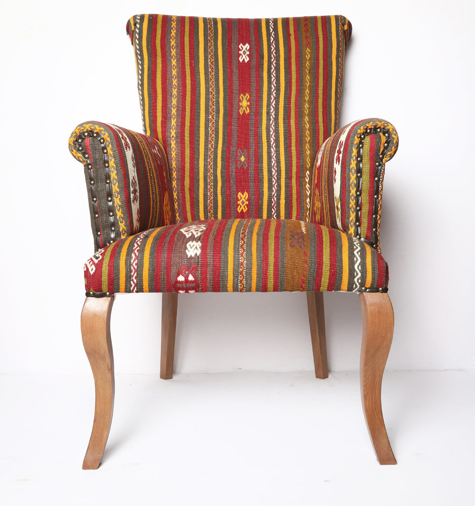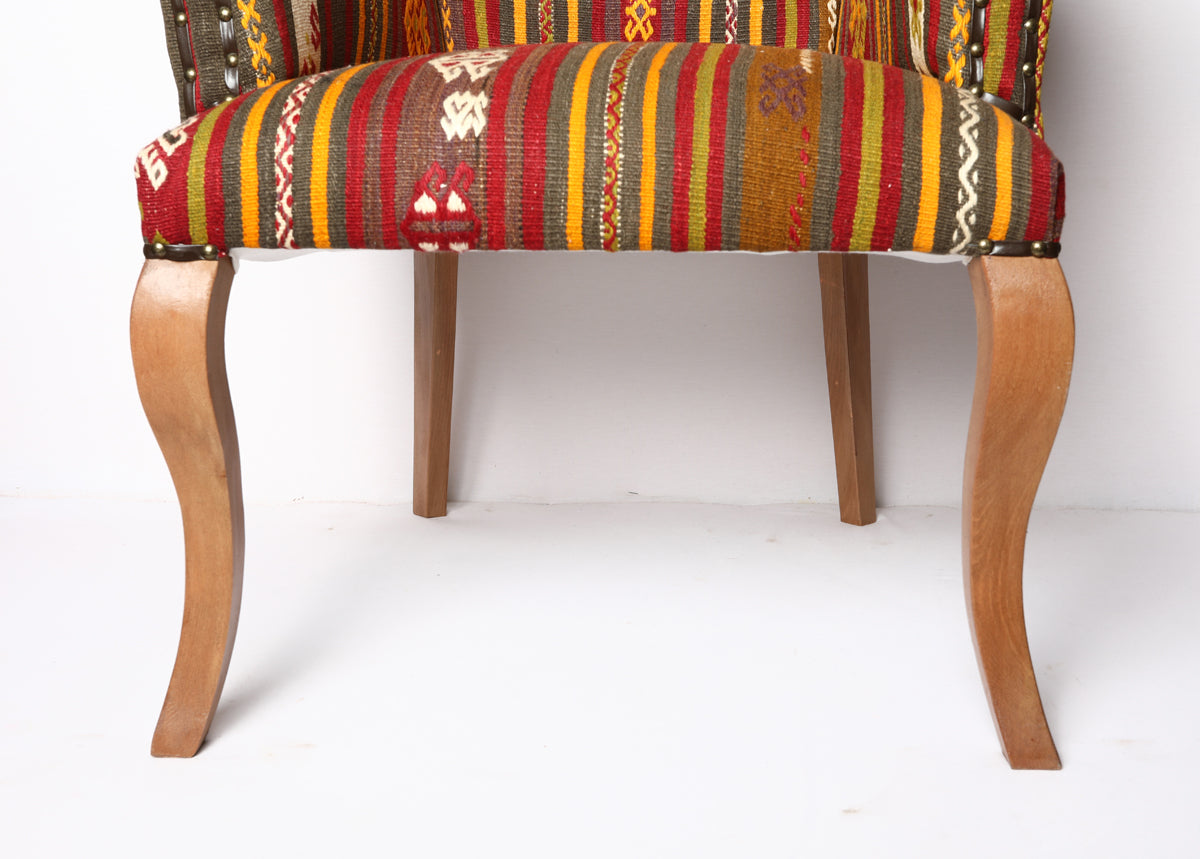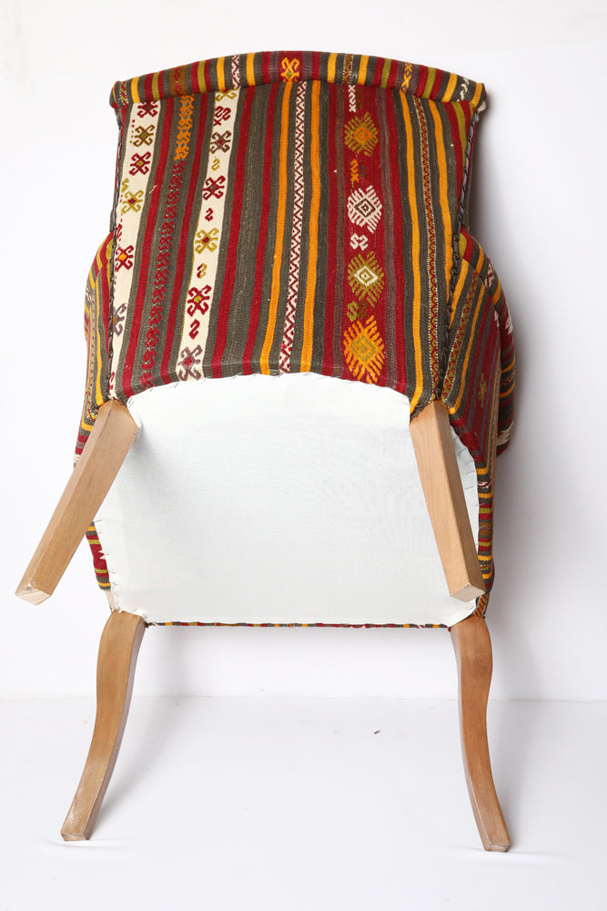 This armchair features an upholstered Balikkesir antique kilim with Jijim weaving of a ram horn, symbolizing power, on top of the woven kilim, all crafted in Turkey. The kilims and carpets were originally intended to cover floors or divans (raised bench for sleeping or sitting), but over time, they may sustain damage and be repurposed as pillow cases or used to upholster furniture, as is the case here. Made of 100% hand-spun mountain wool and hand-woven in the early 20th century.