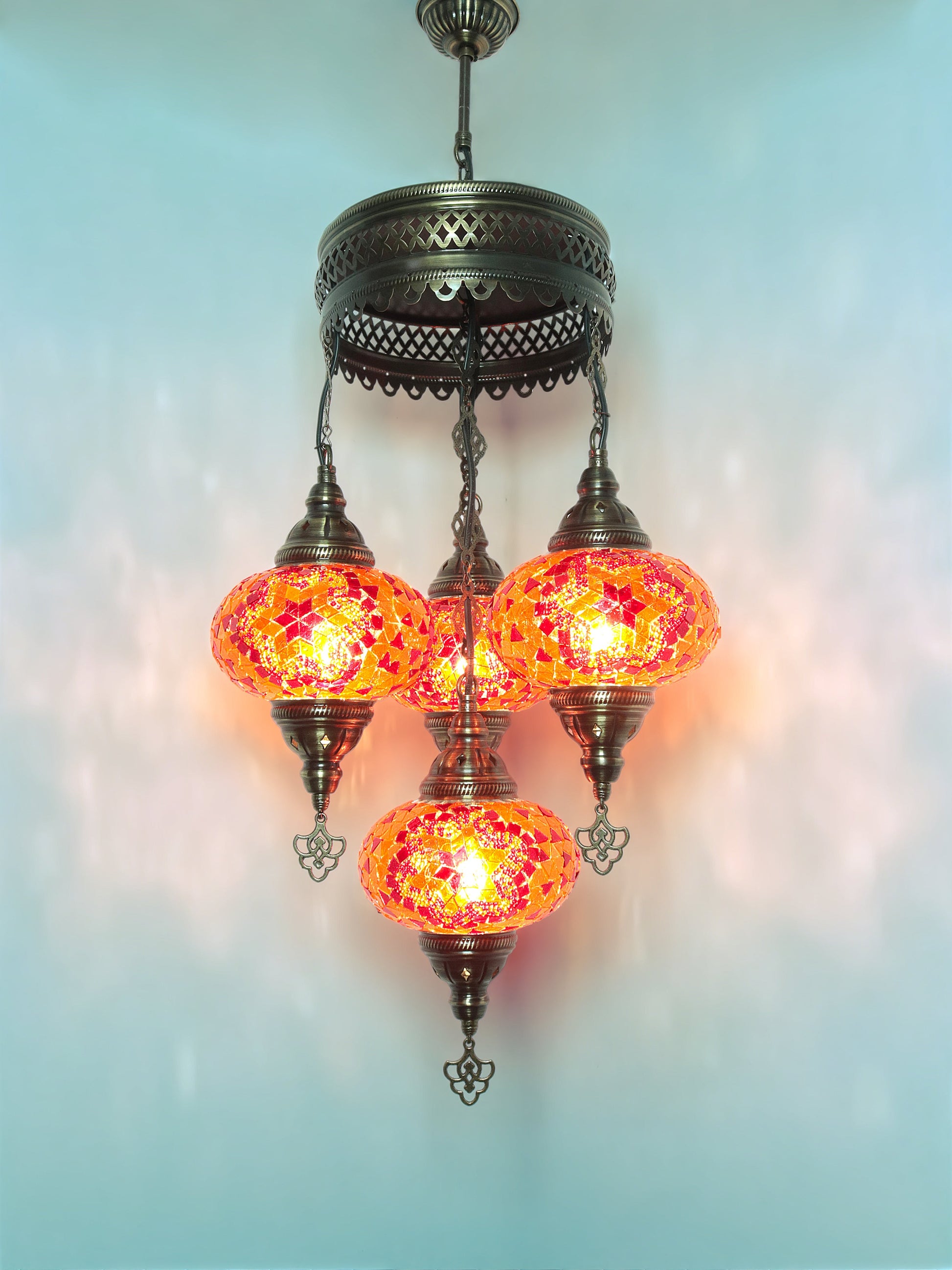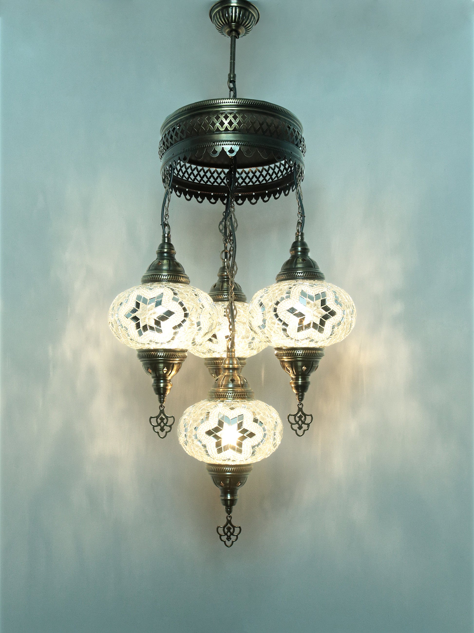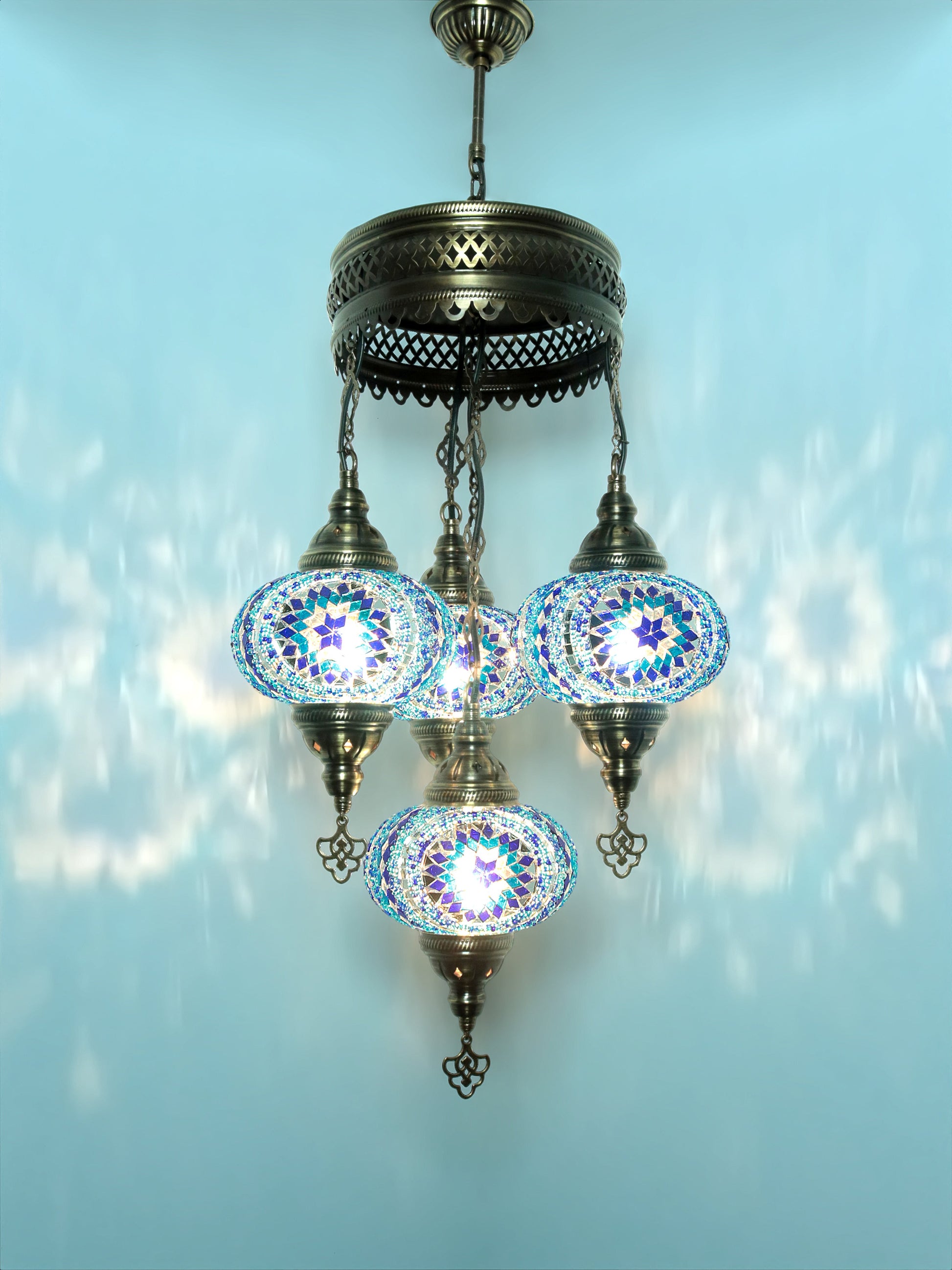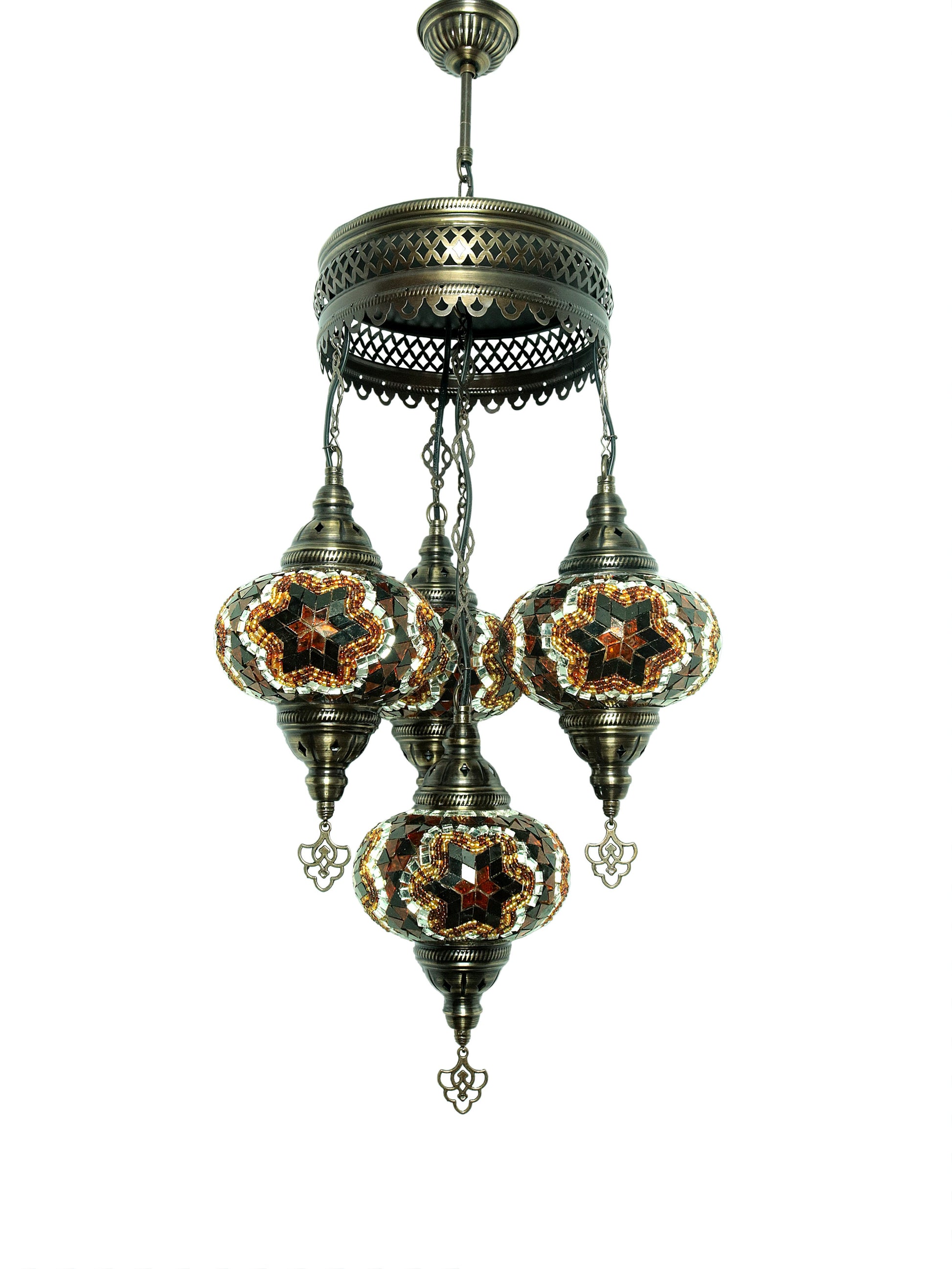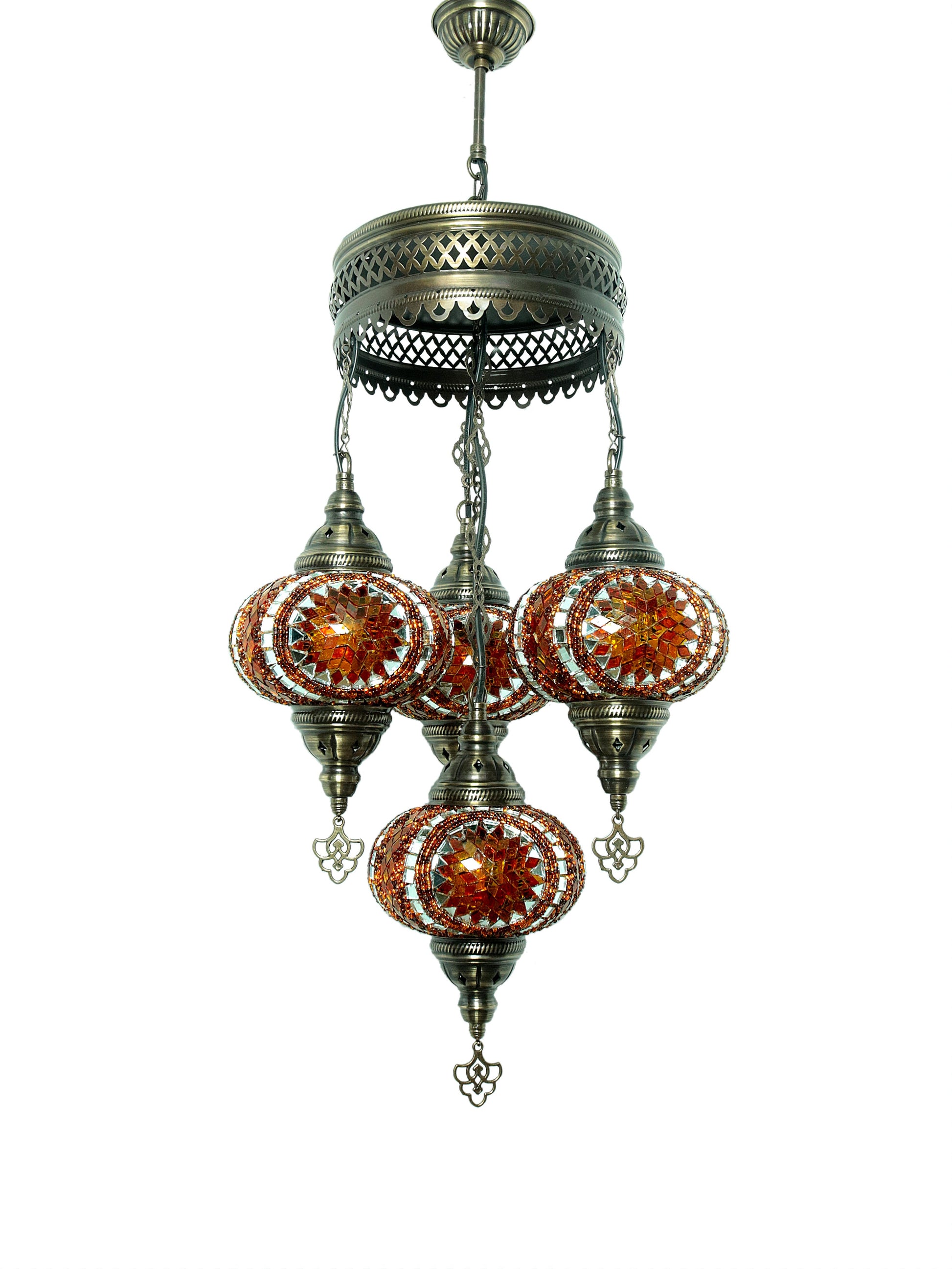 Our Turkish Mosaic Glass Chandeliers feature a Bohemian glass core overlaid with hand cut glass and beads to form various mosaic designs. This process is entirely handmade which makes each piece unique. Even if one lamp features the same design and colors of another, they are never an exact reproduction of each other. Each metal frame is individually wheeled. Metal finish color is antique brass.