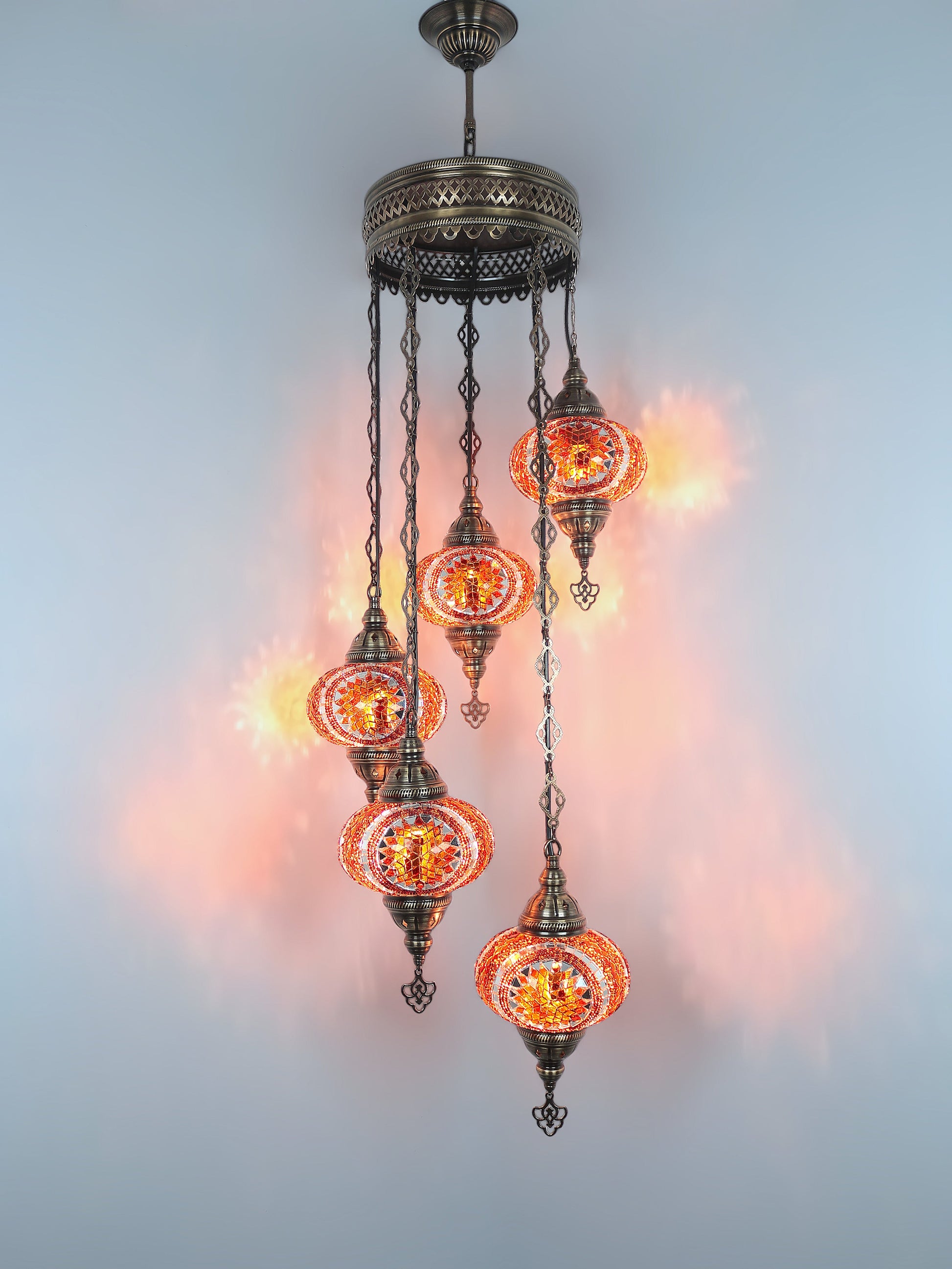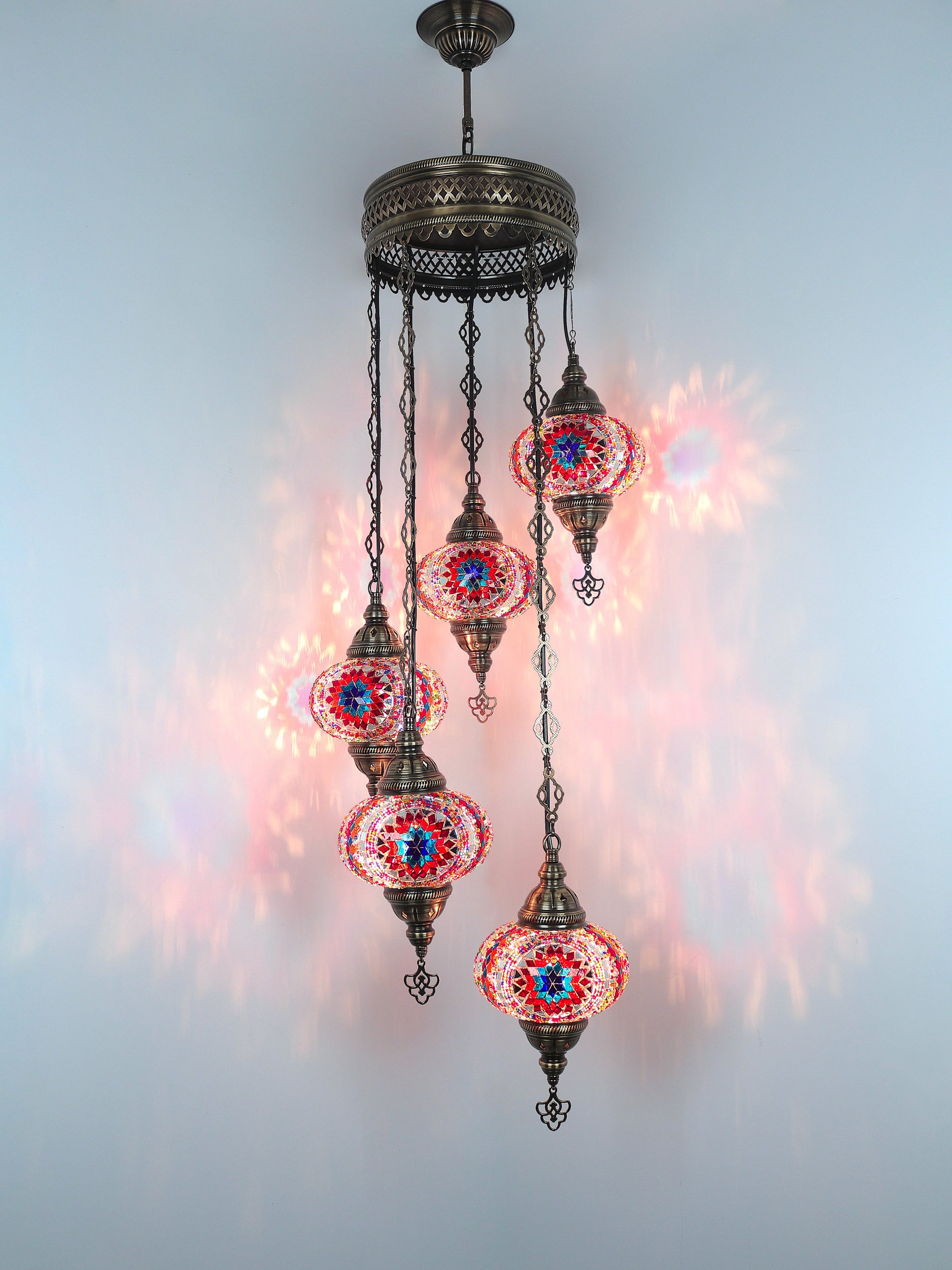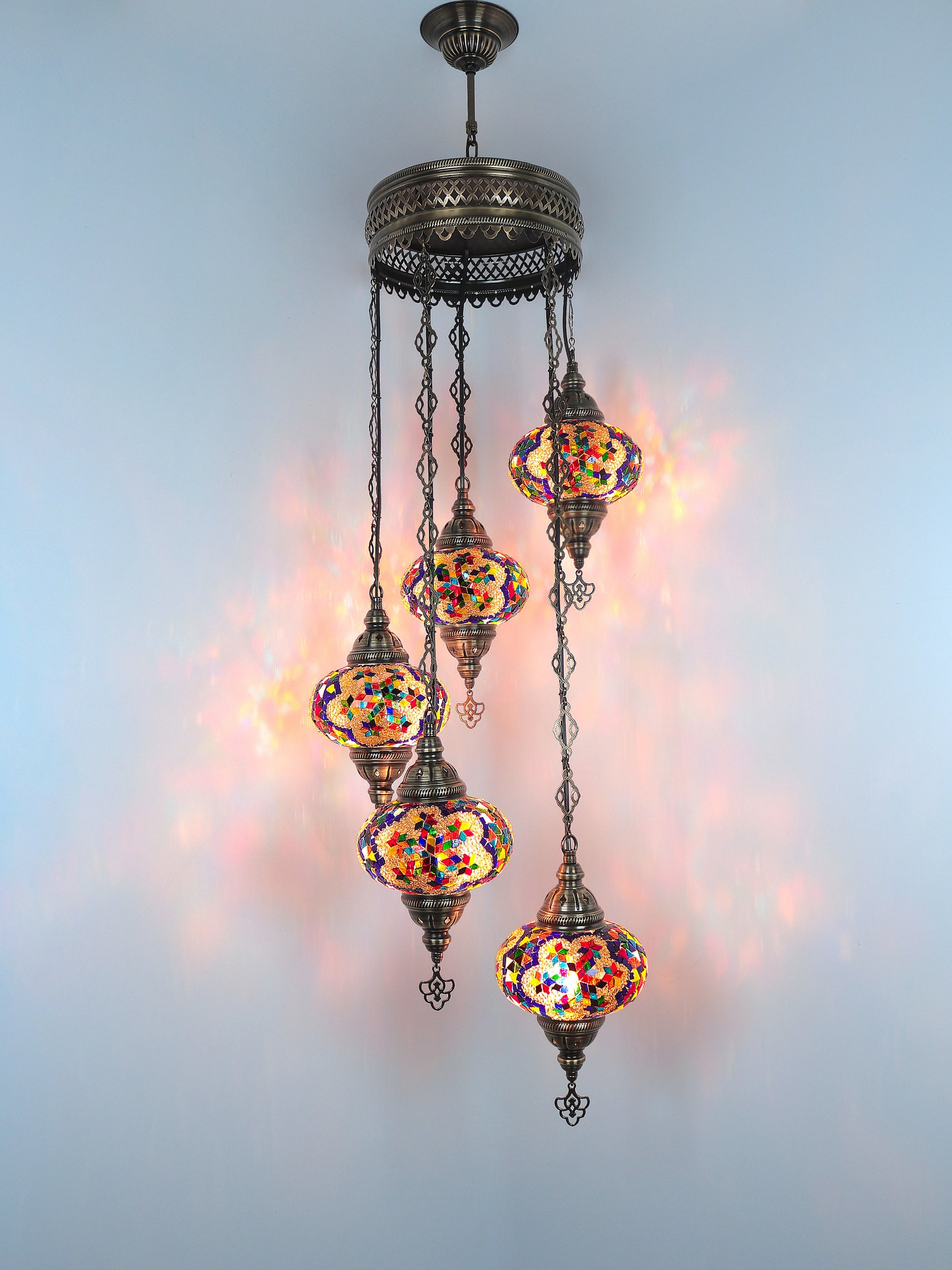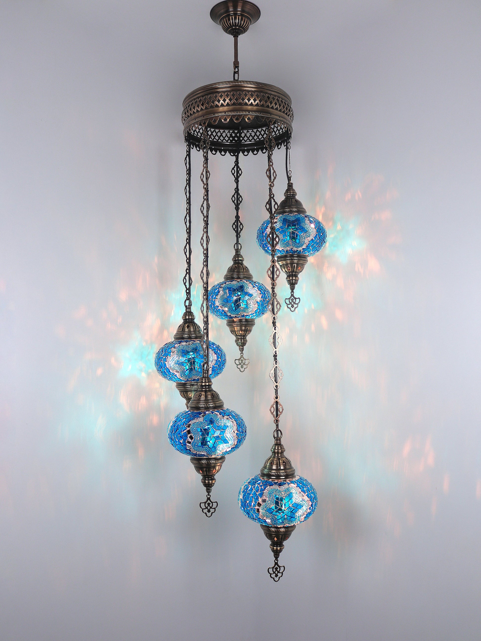 Our Turkish Mosaic Glass Chandeliers feature a Bohemian glass core overlaid with hand cut glass and beads to form various mosaic designs. This process is entirely handmade which makes each piece unique. Even if one lamp features the same design and colors of another, they are never an exact reproduction of each other. Each metal frame is individually wheeled. Metal finish color is antique brass.