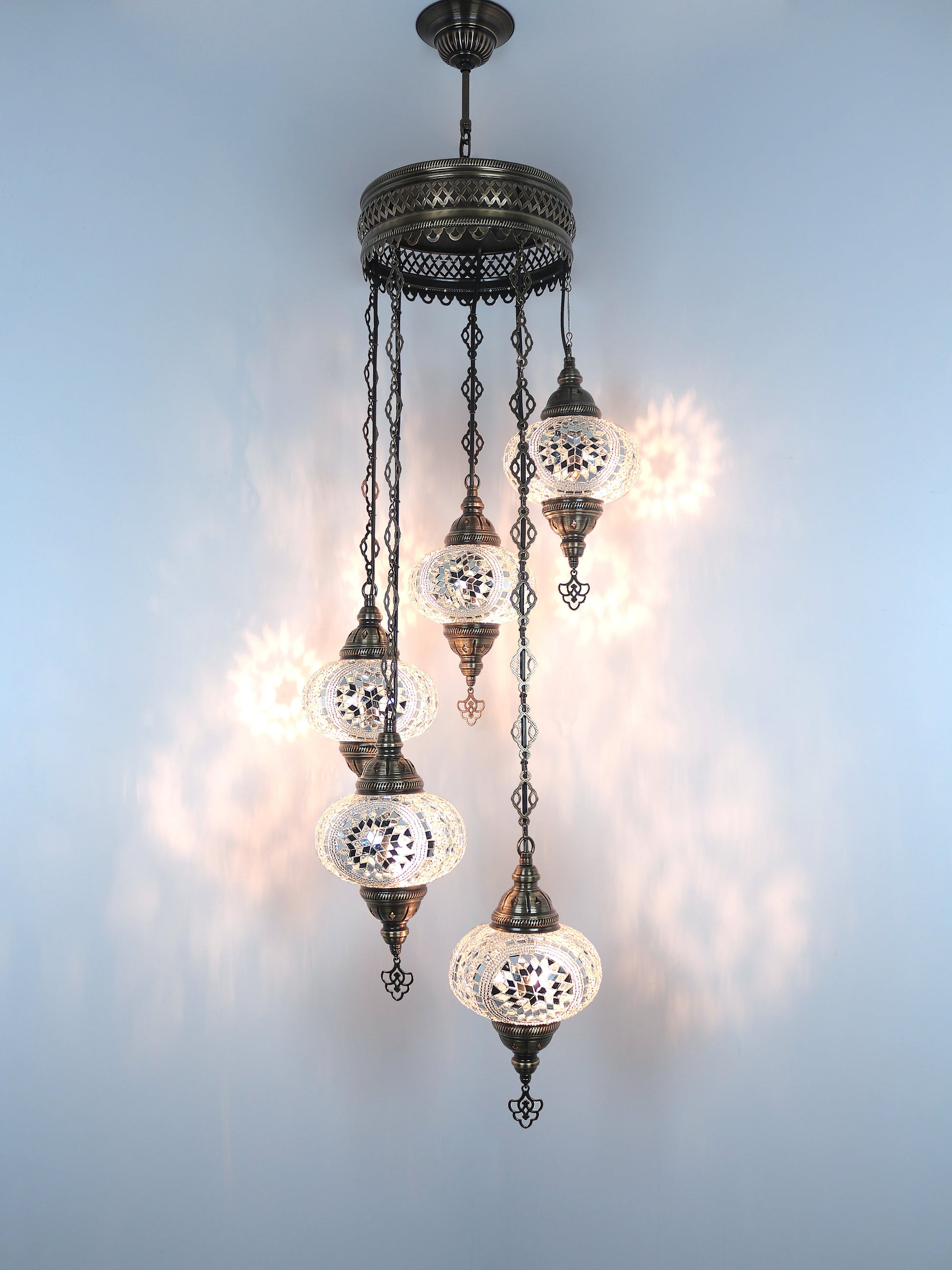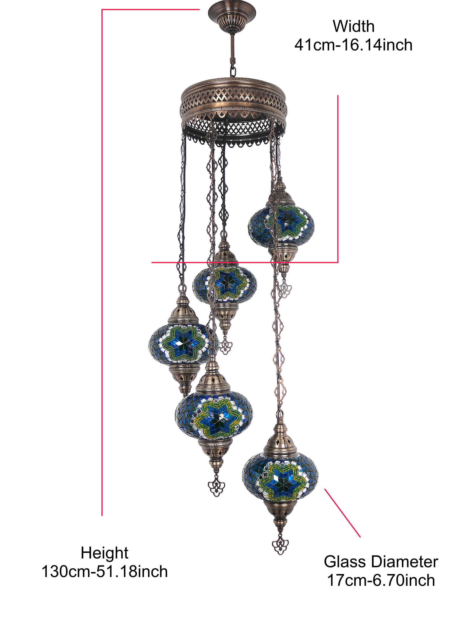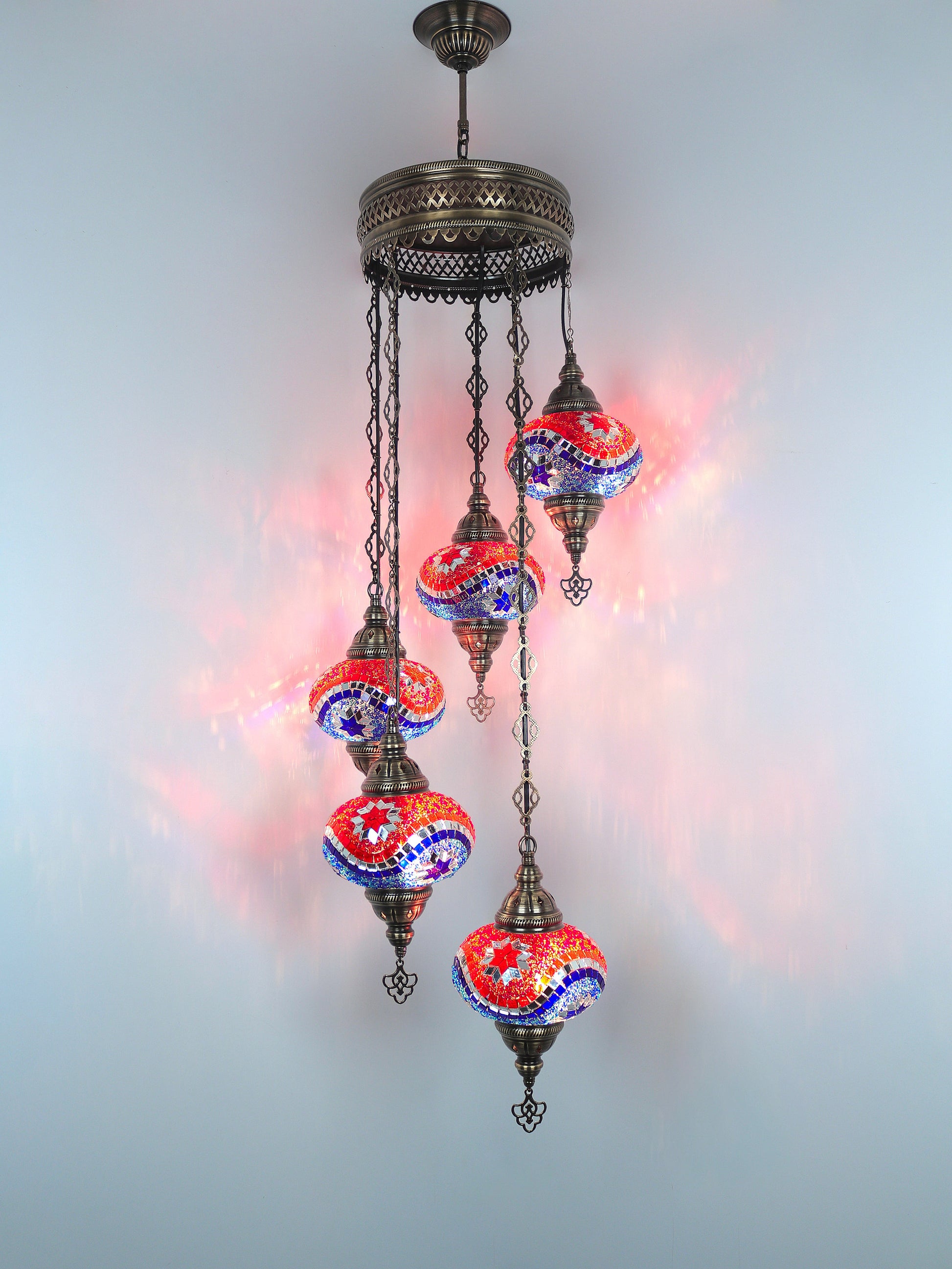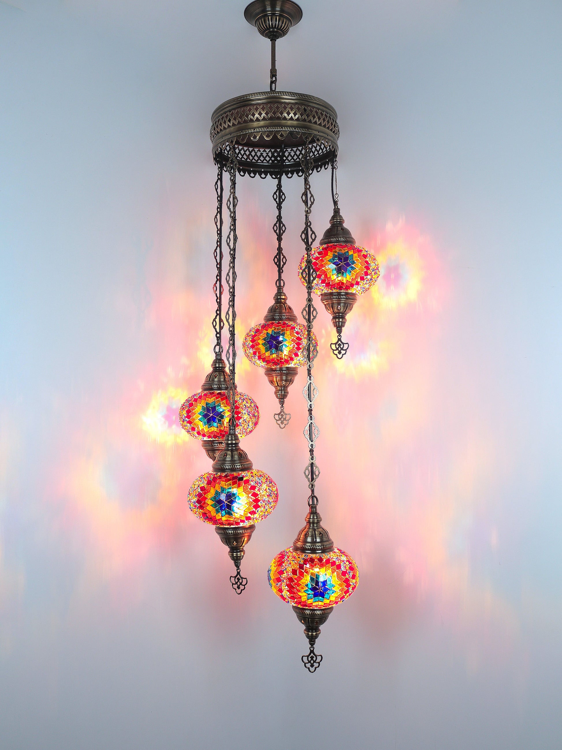 Our Turkish Mosaic Glass Chandeliers feature a Bohemian glass core overlaid with hand cut glass and beads to form various mosaic designs. This process is entirely handmade which makes each piece unique. Even if one lamp features the same design and colors of another, they are never an exact reproduction of each other. Each metal frame is individually wheeled. Metal finish color is antique brass.