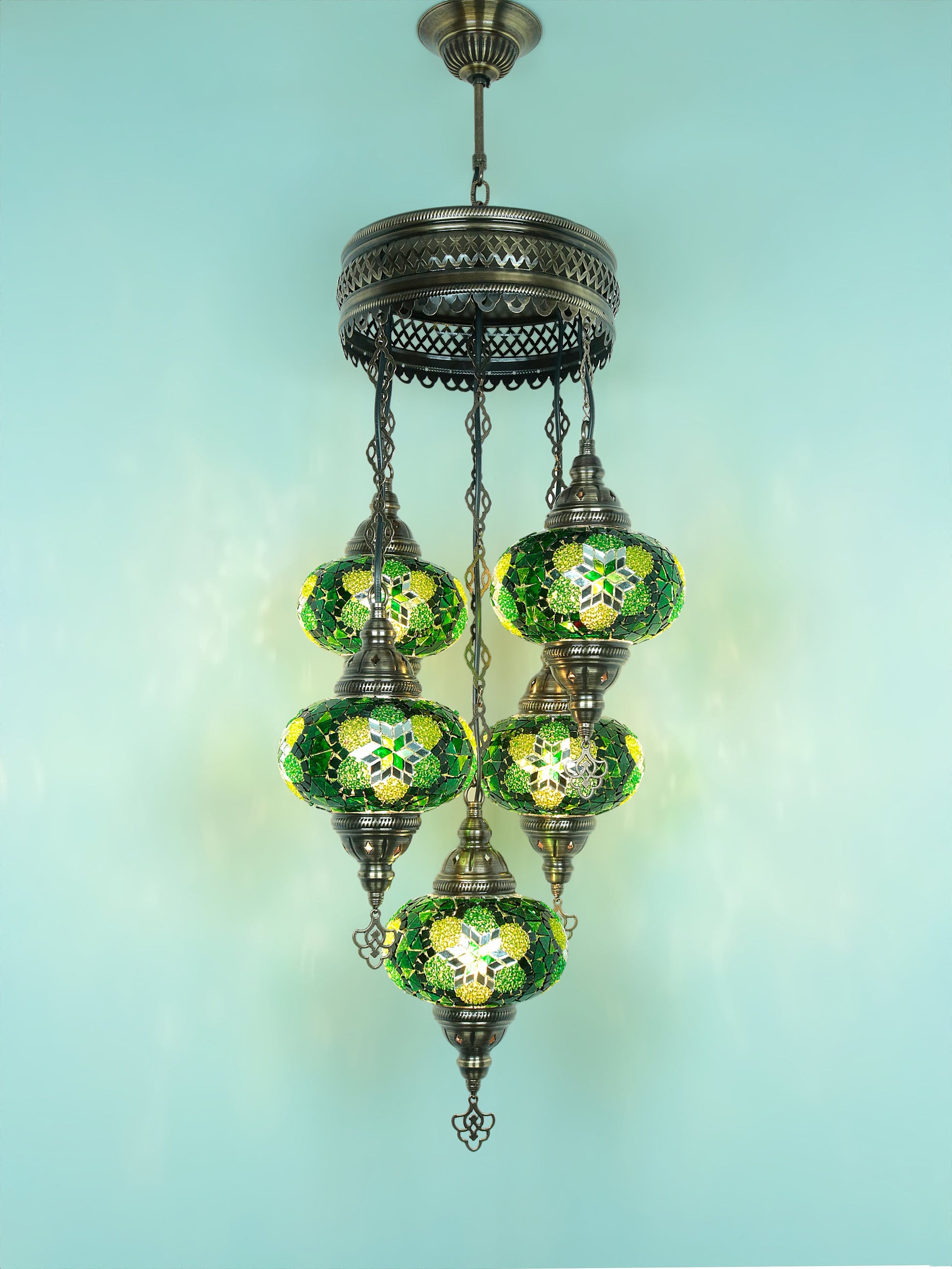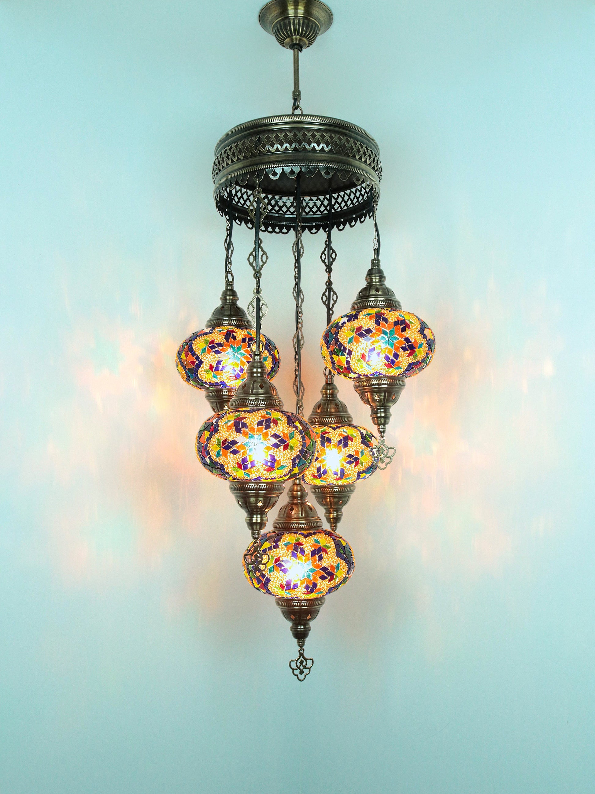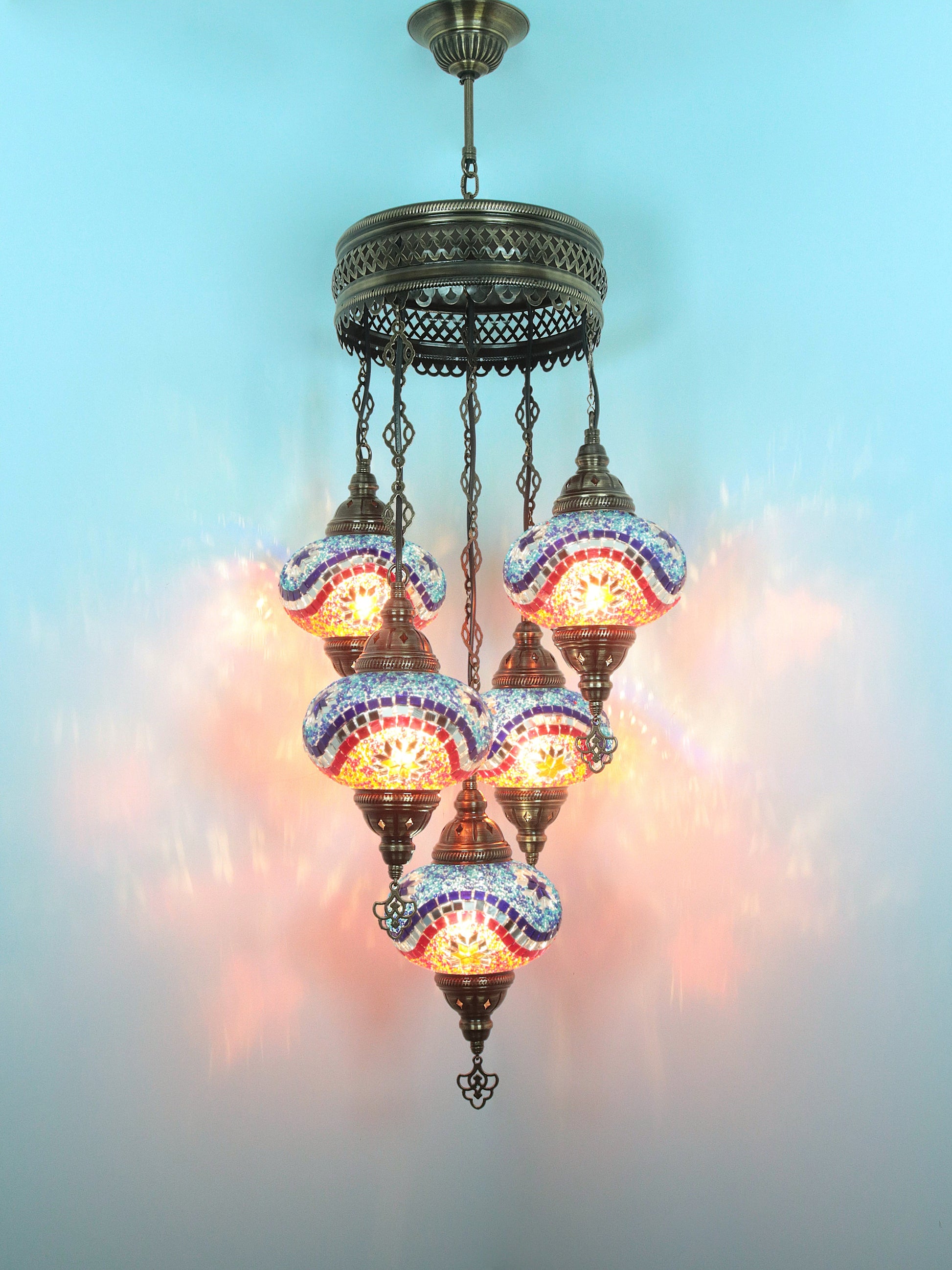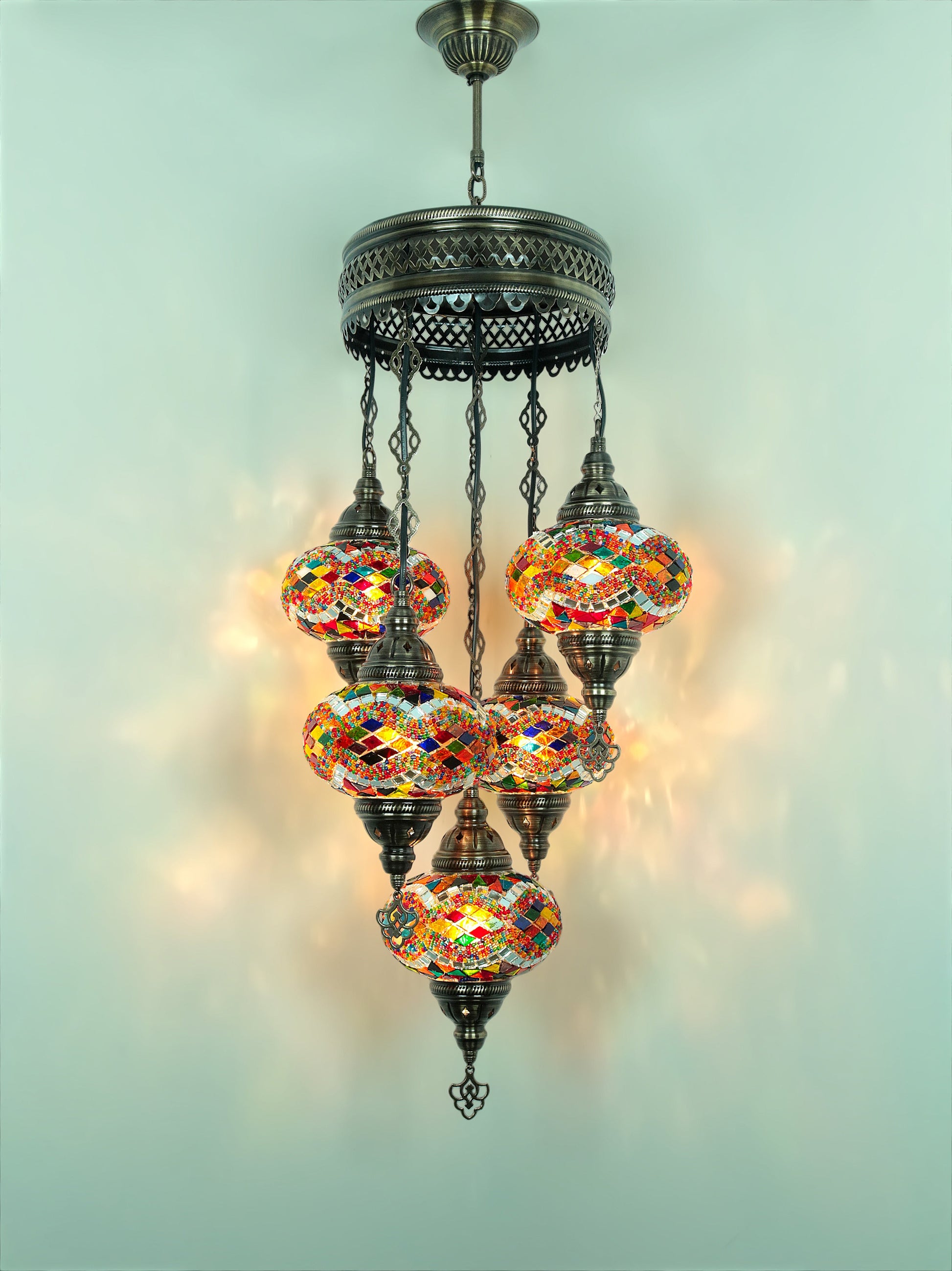 Our Turkish Mosaic Glass Chandeliers feature a Bohemian glass core overlaid with hand cut glass and beads to form various mosaic designs. This process is entirely handmade which makes each piece unique. Even if one lamp features the same design and colors of another, they are never an exact reproduction of each other. Each metal frame is individually wheeled. Metal finish color is antique brass.