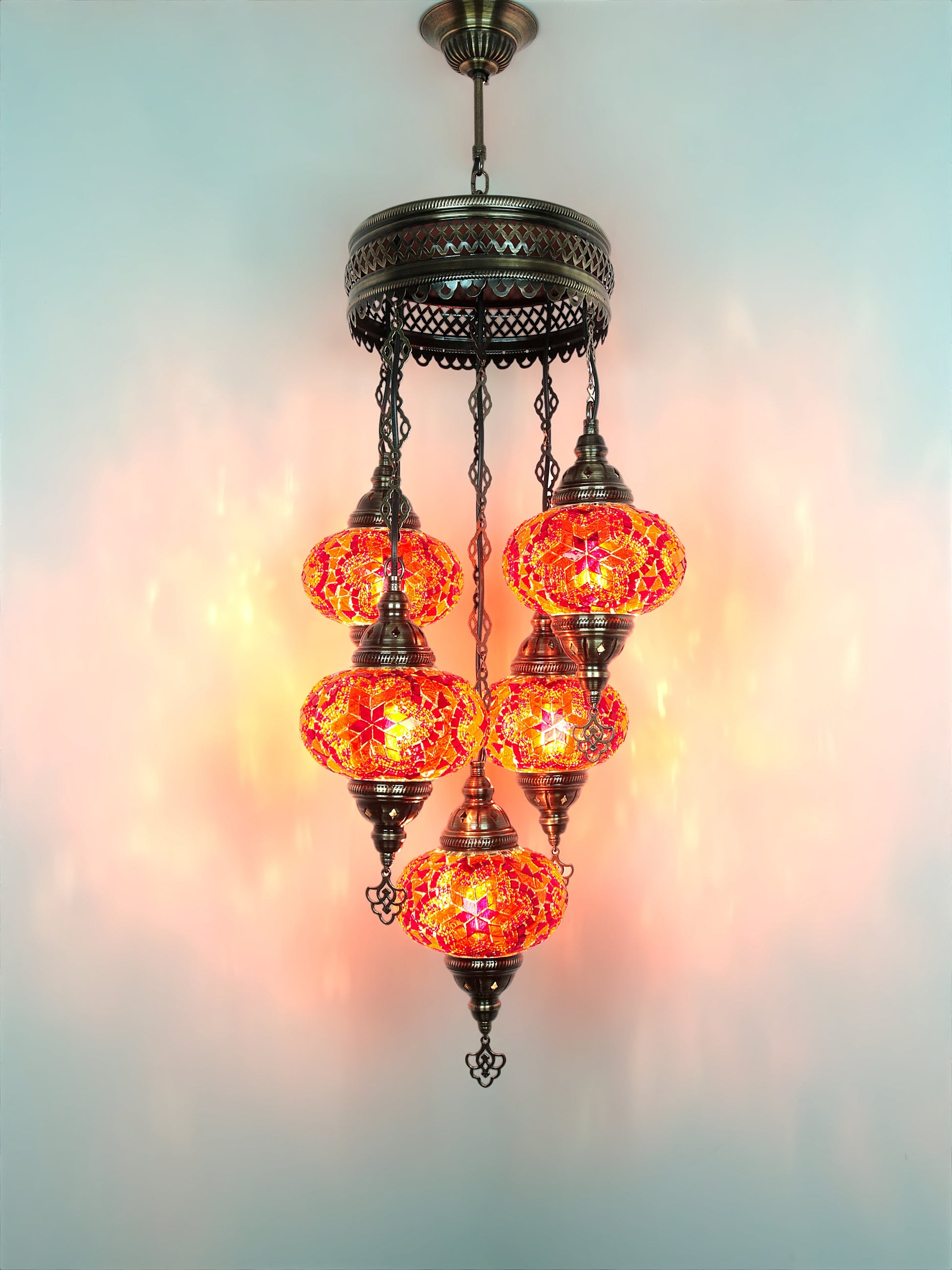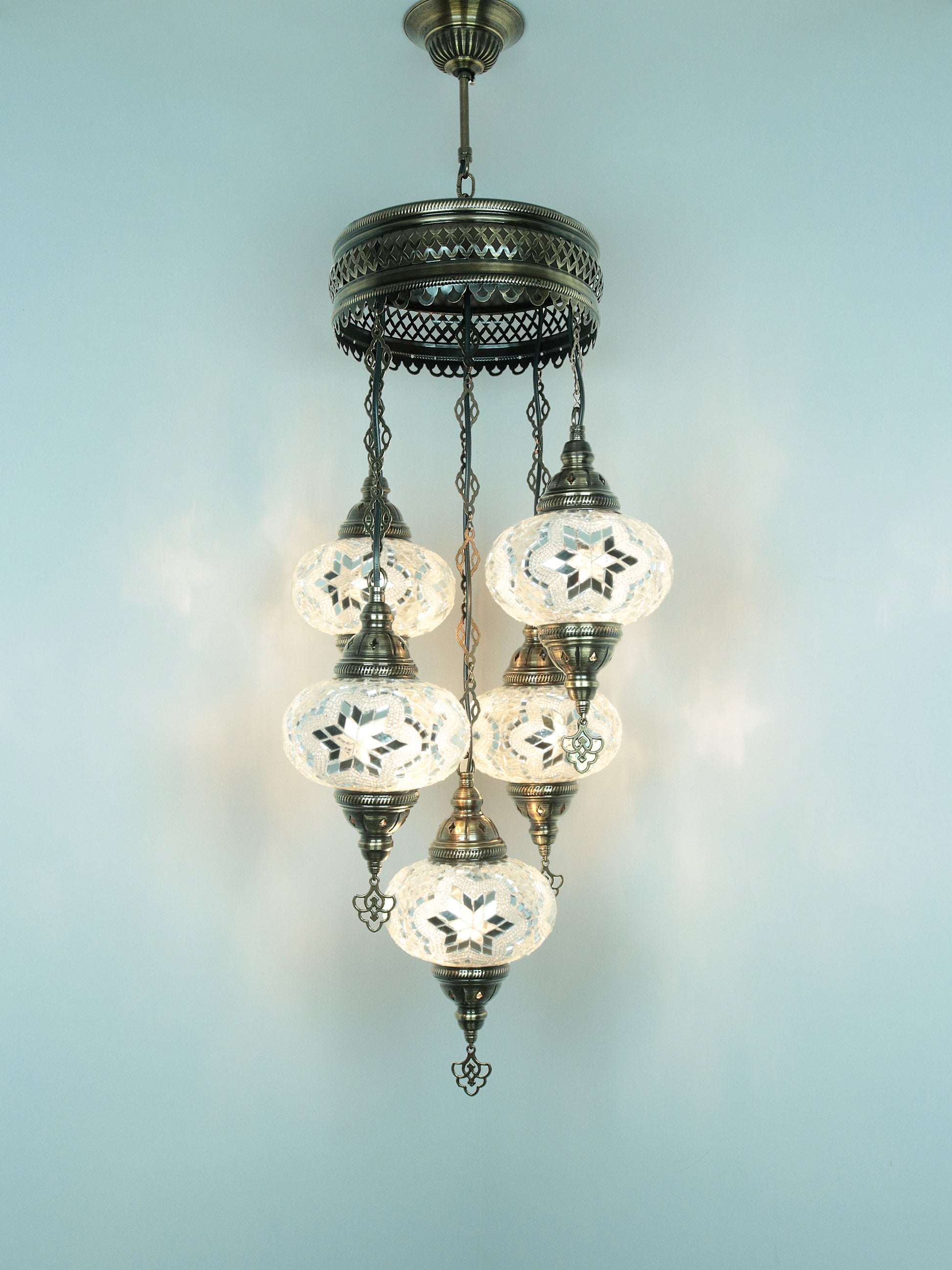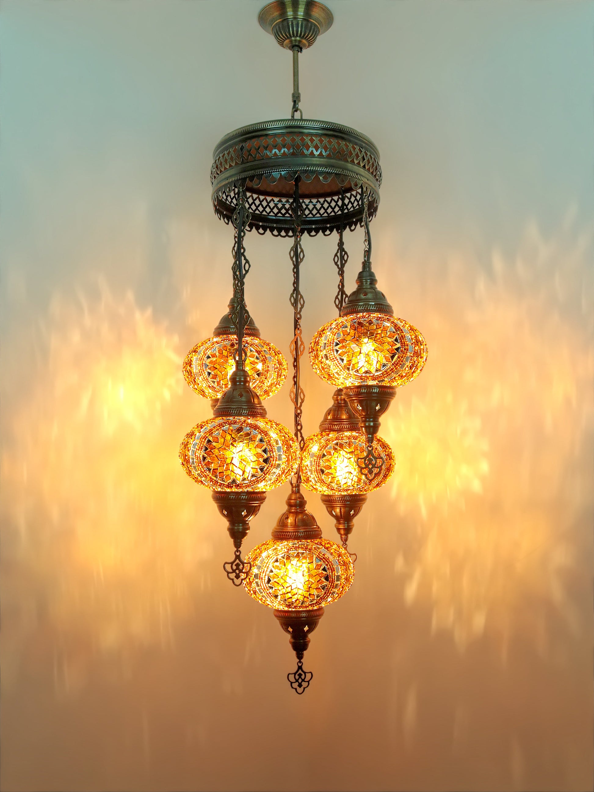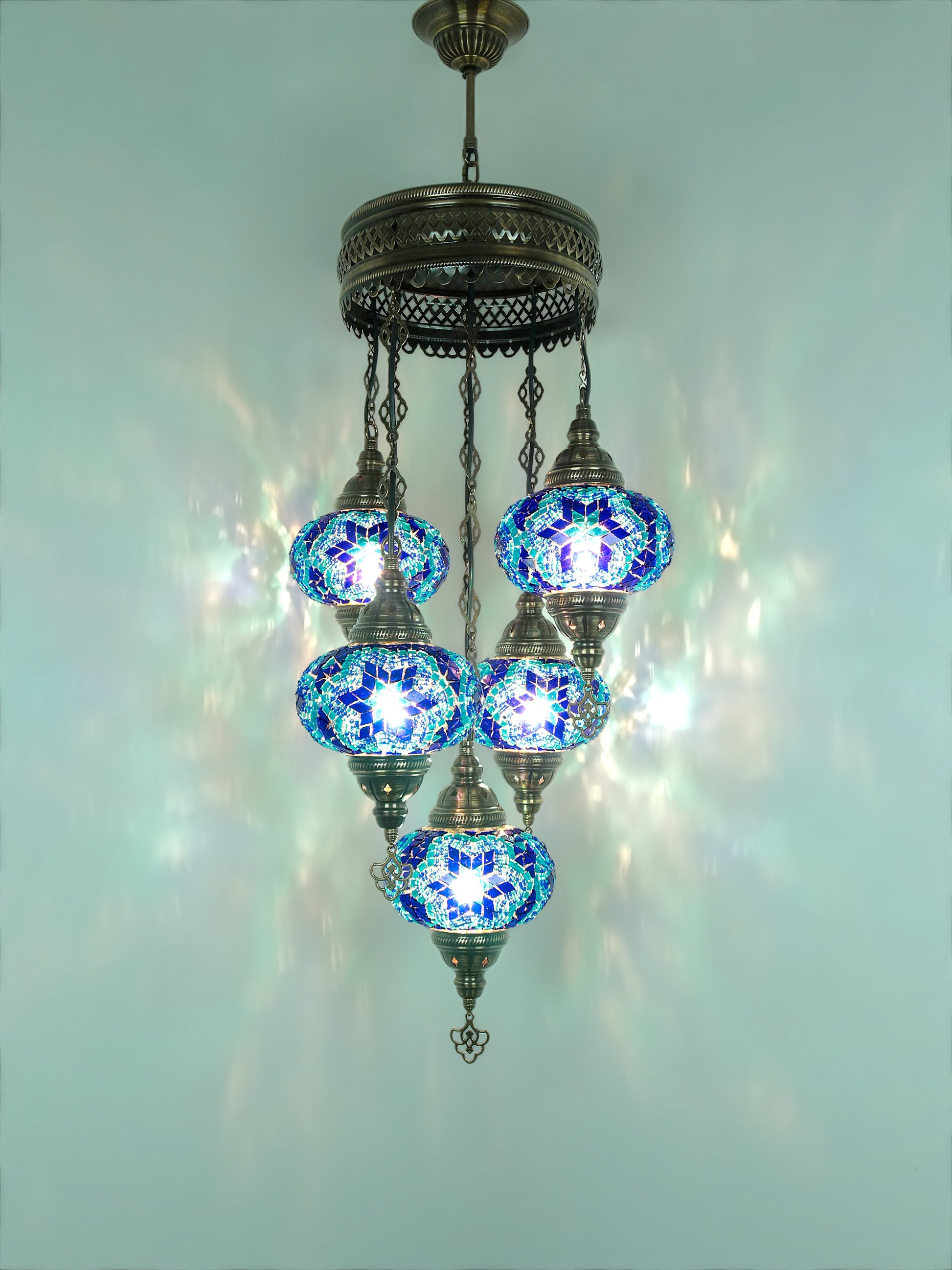 Our Turkish Mosaic Glass Chandeliers feature a Bohemian glass core overlaid with hand cut glass and beads to form various mosaic designs. This process is entirely handmade which makes each piece unique. Even if one lamp features the same design and colors of another, they are never an exact reproduction of each other. Each metal frame is individually wheeled. Metal finish color is antique brass.