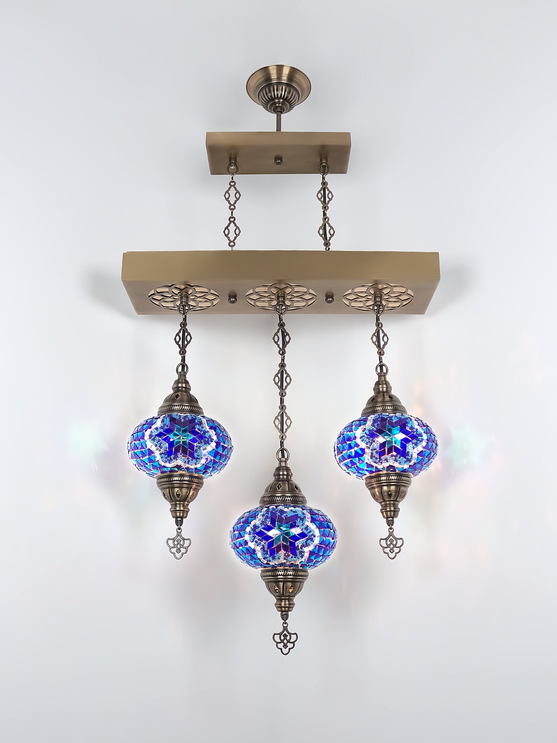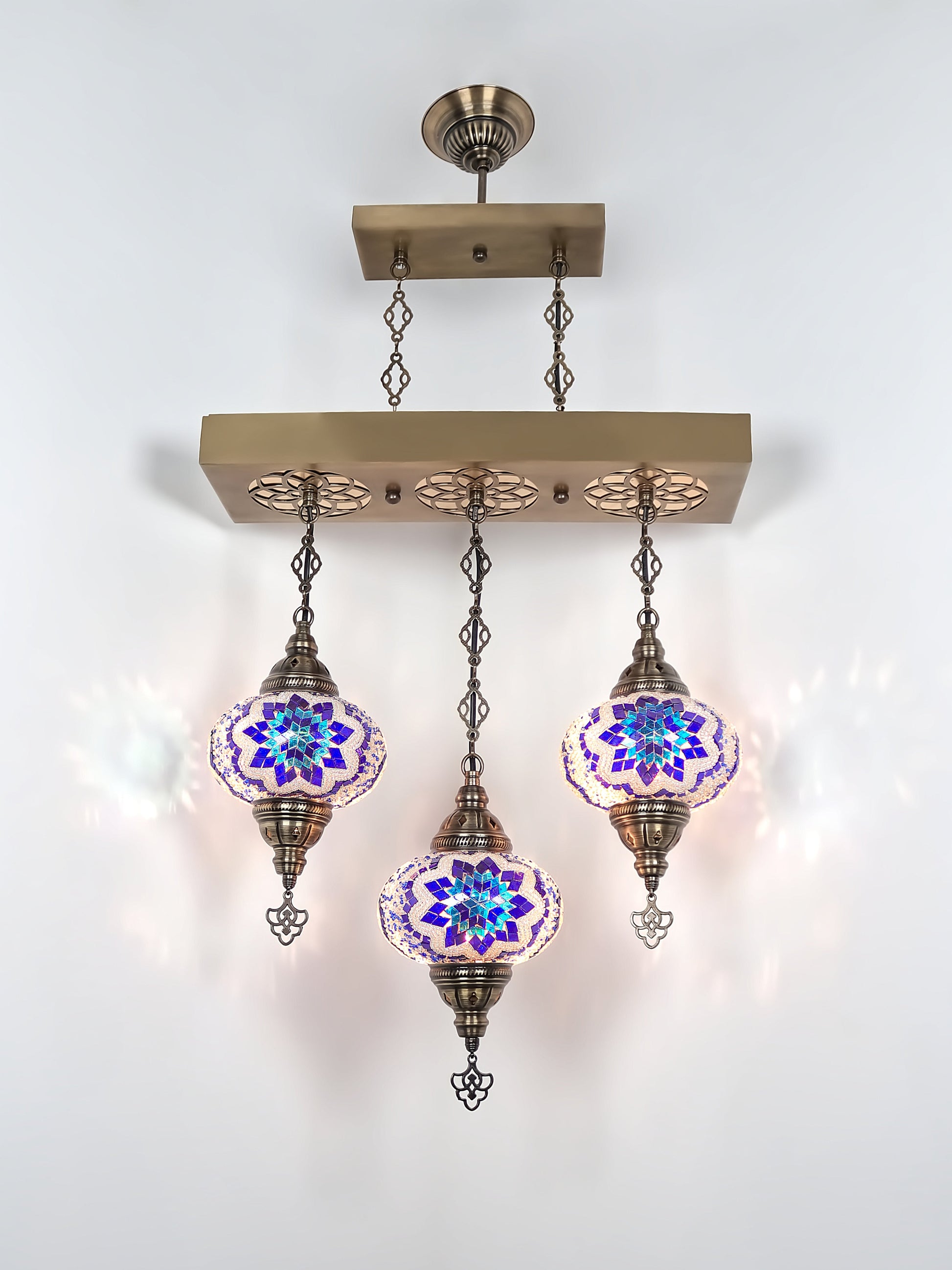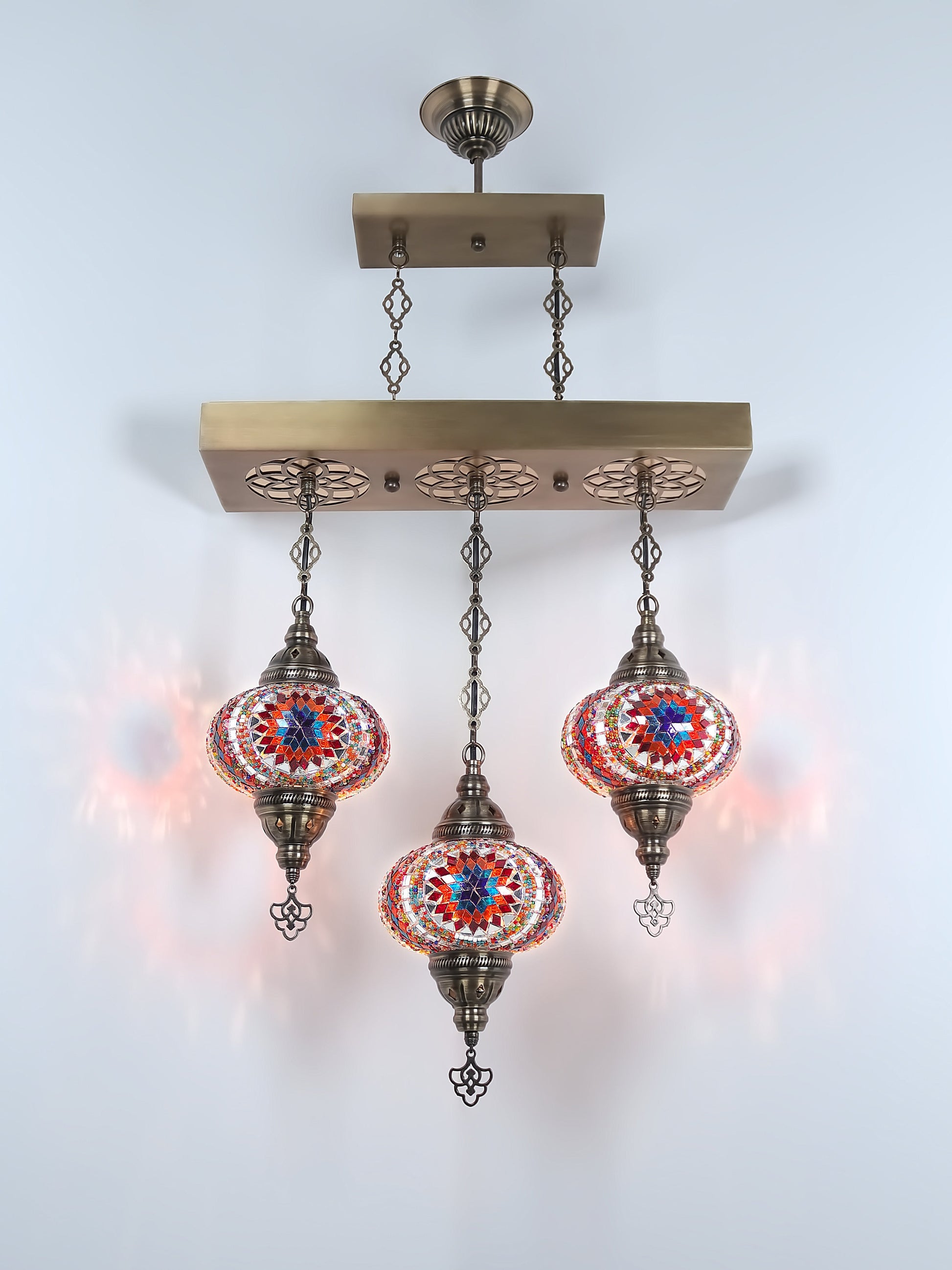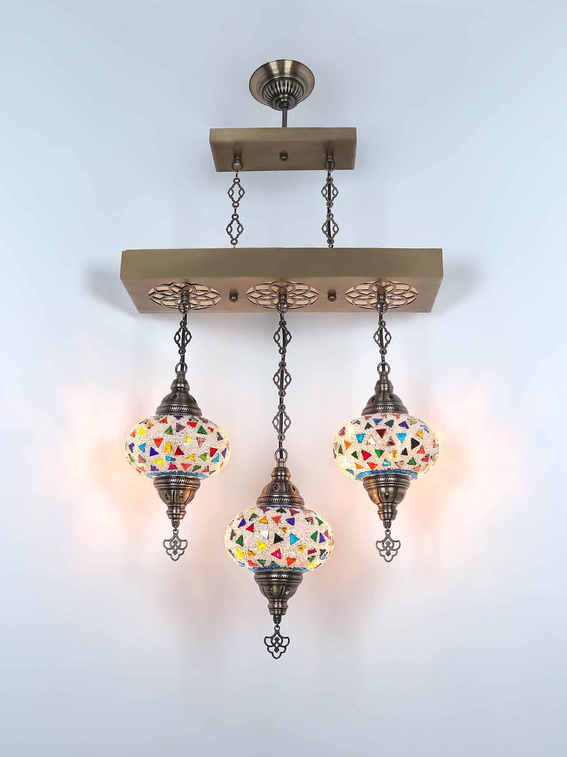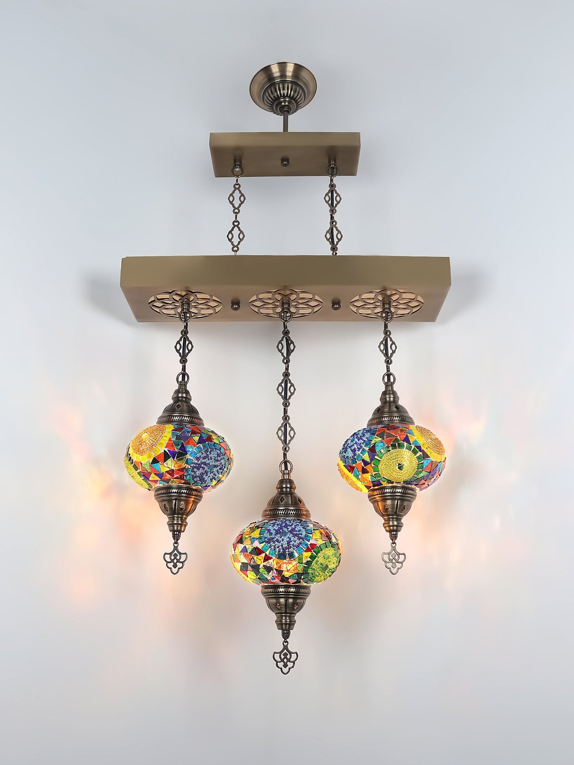 Our Turkish Mosaic Glass Chandeliers feature a Bohemian glass core overlaid with hand cut glass and beads to form various mosaic designs. This process is entirely handmade which makes each piece unique. Even if one lamp features the same design and colors of another, they are never an exact reproduction of each other. Each metal frame is individually wheeled. Metal finish color is antique brass.