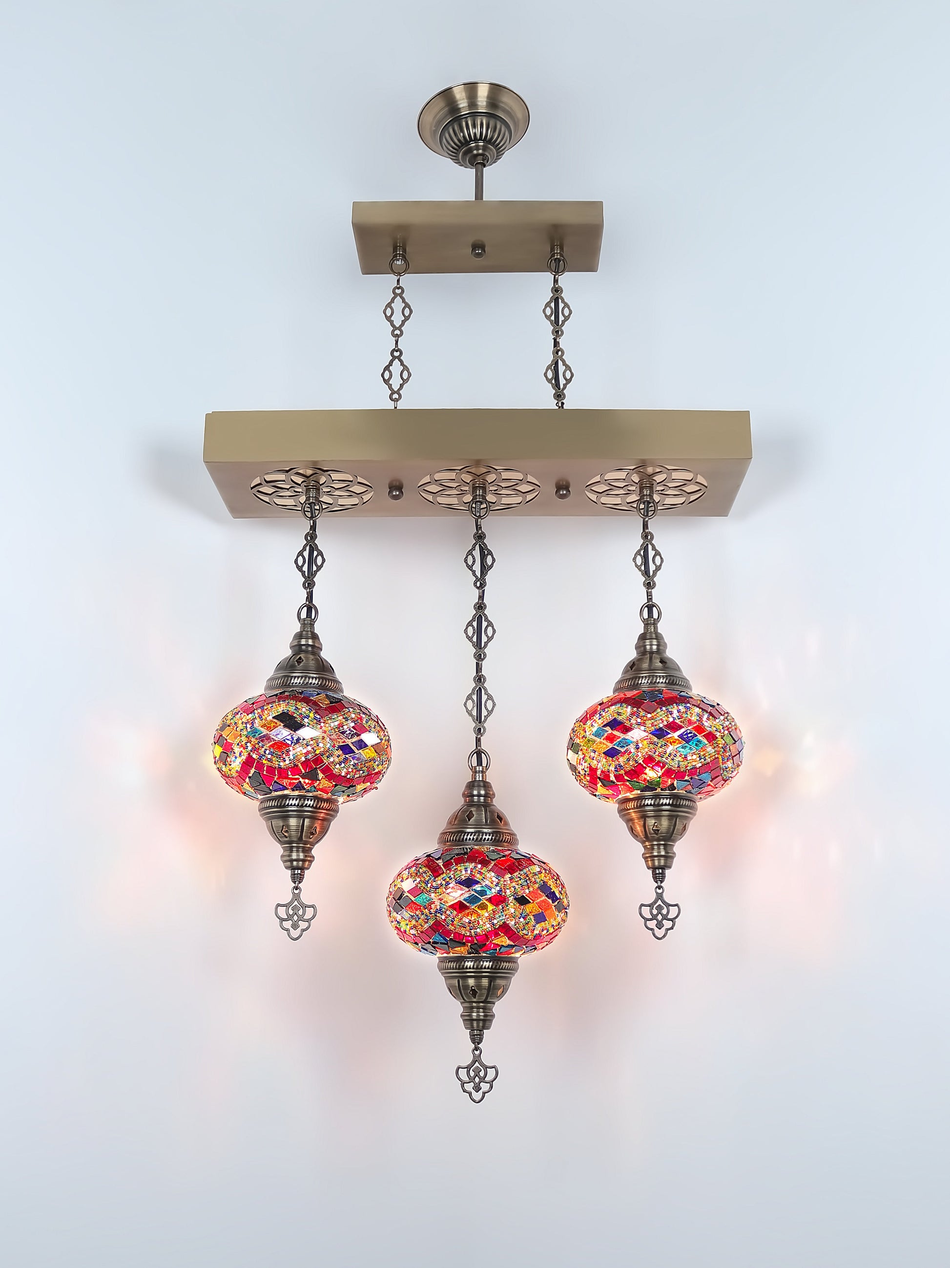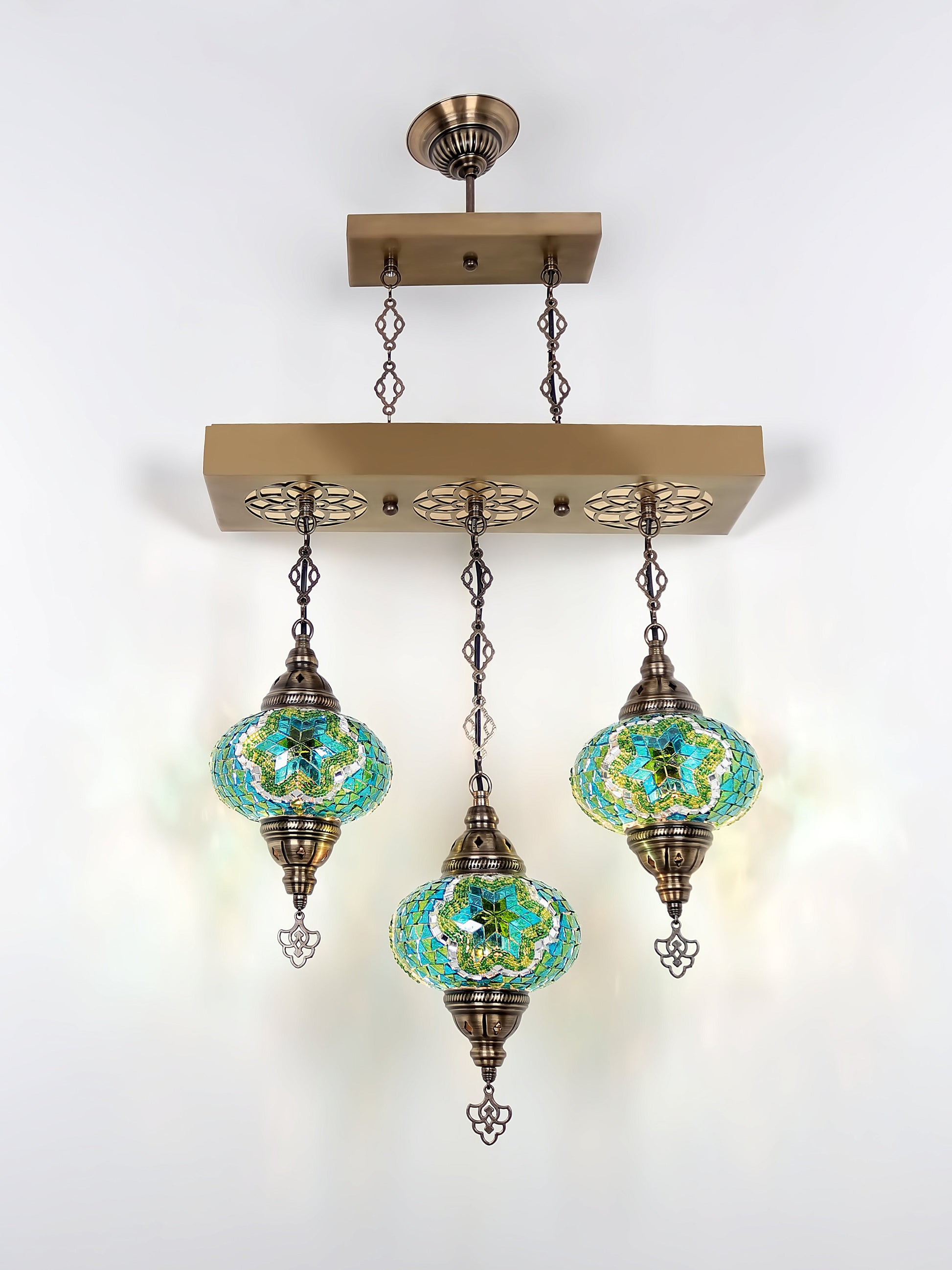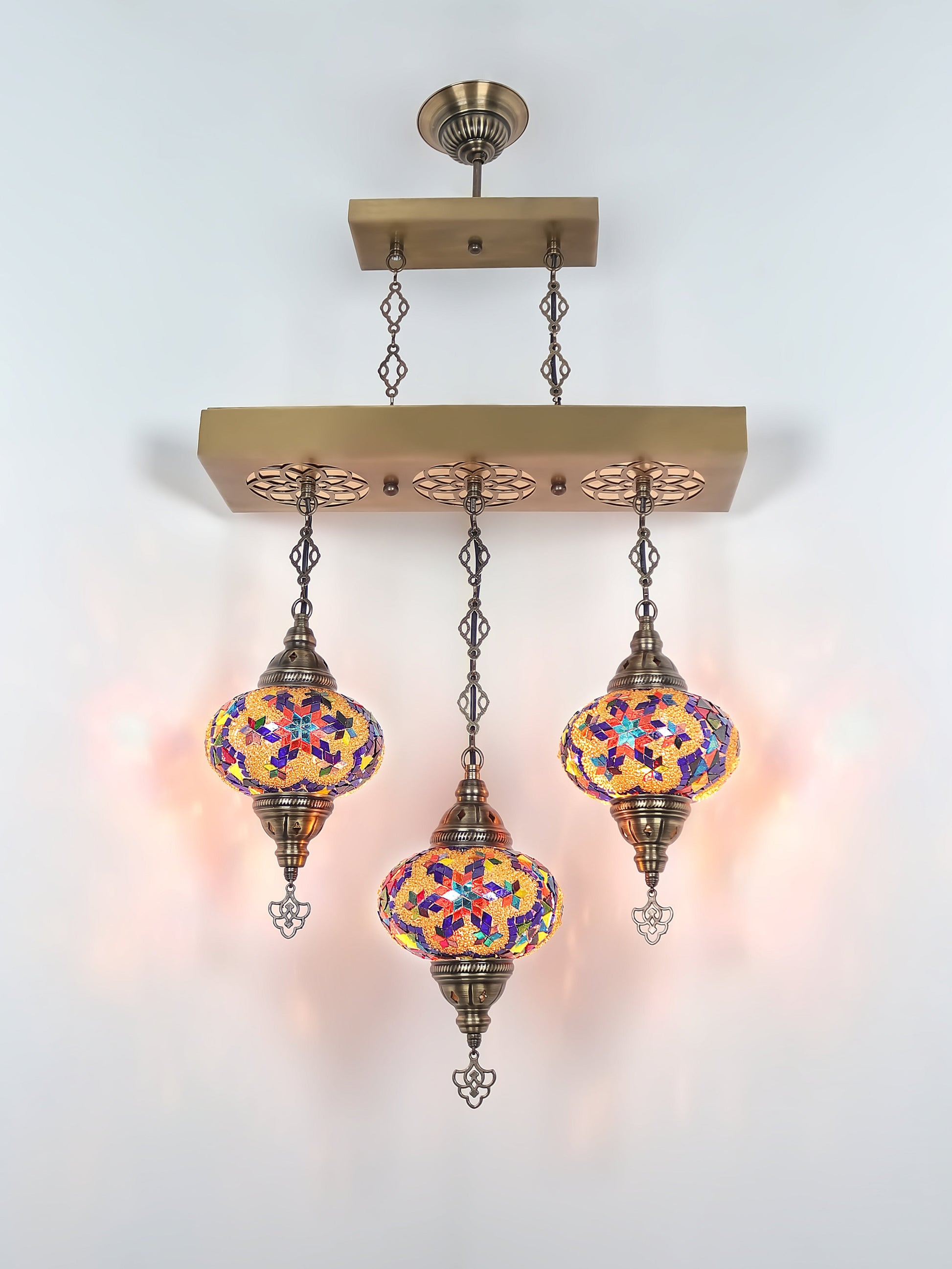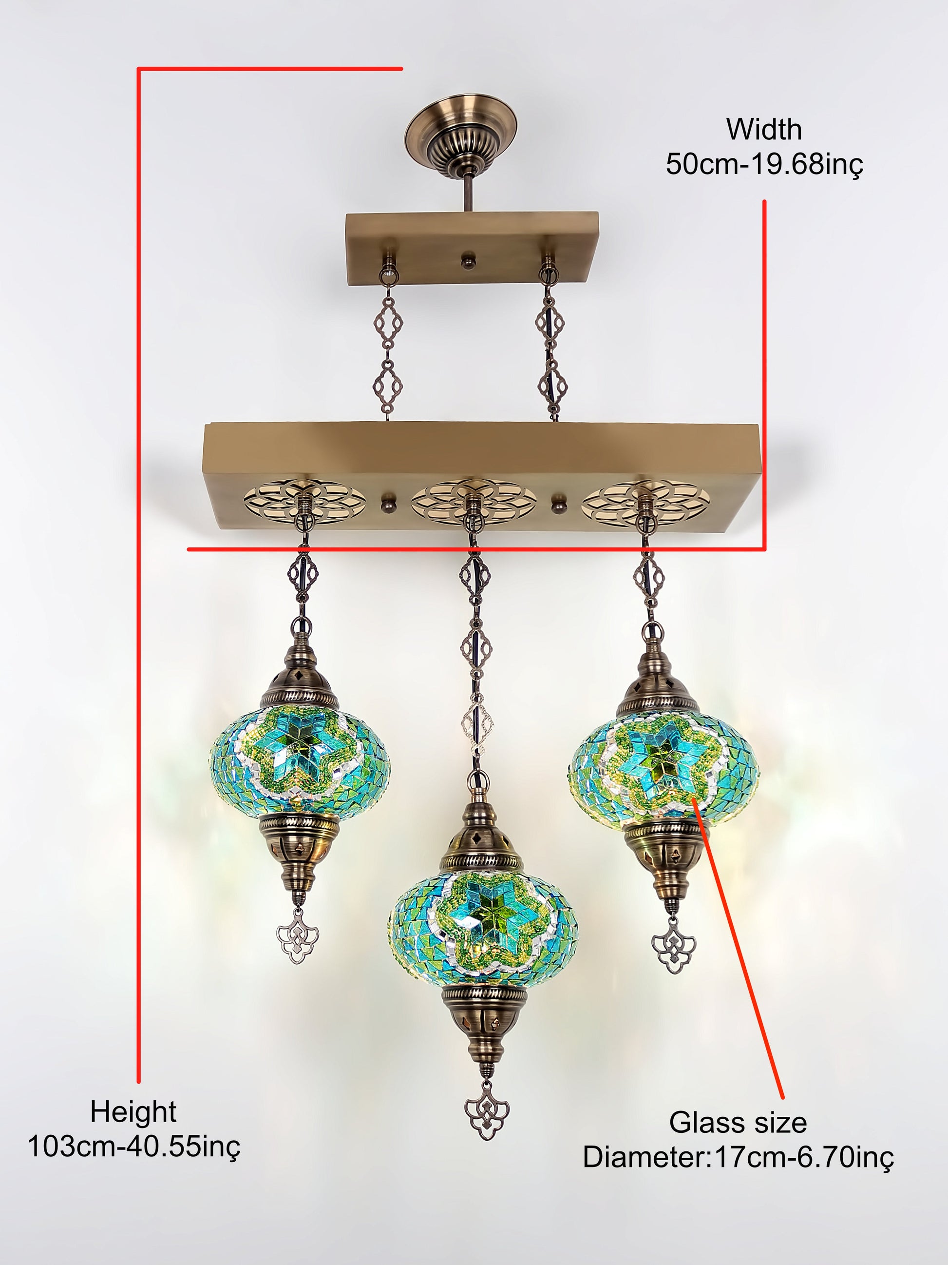 Our Turkish Mosaic Glass Chandeliers feature a Bohemian glass core overlaid with hand cut glass and beads to form various mosaic designs. This process is entirely handmade which makes each piece unique. Even if one lamp features the same design and colors of another, they are never an exact reproduction of each other. Each metal frame is individually wheeled. Metal finish color is antique brass.