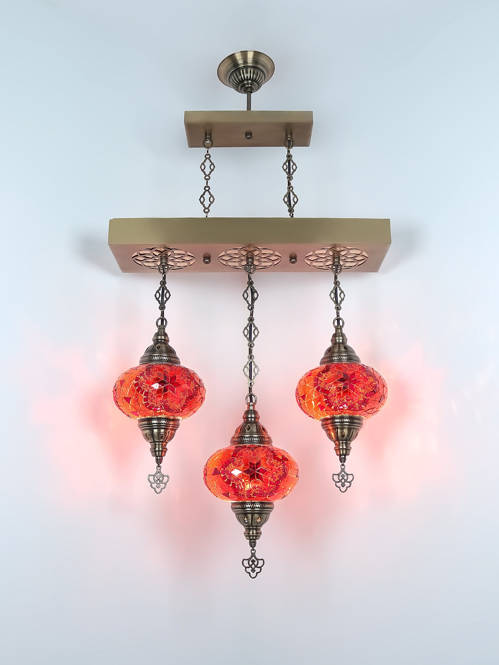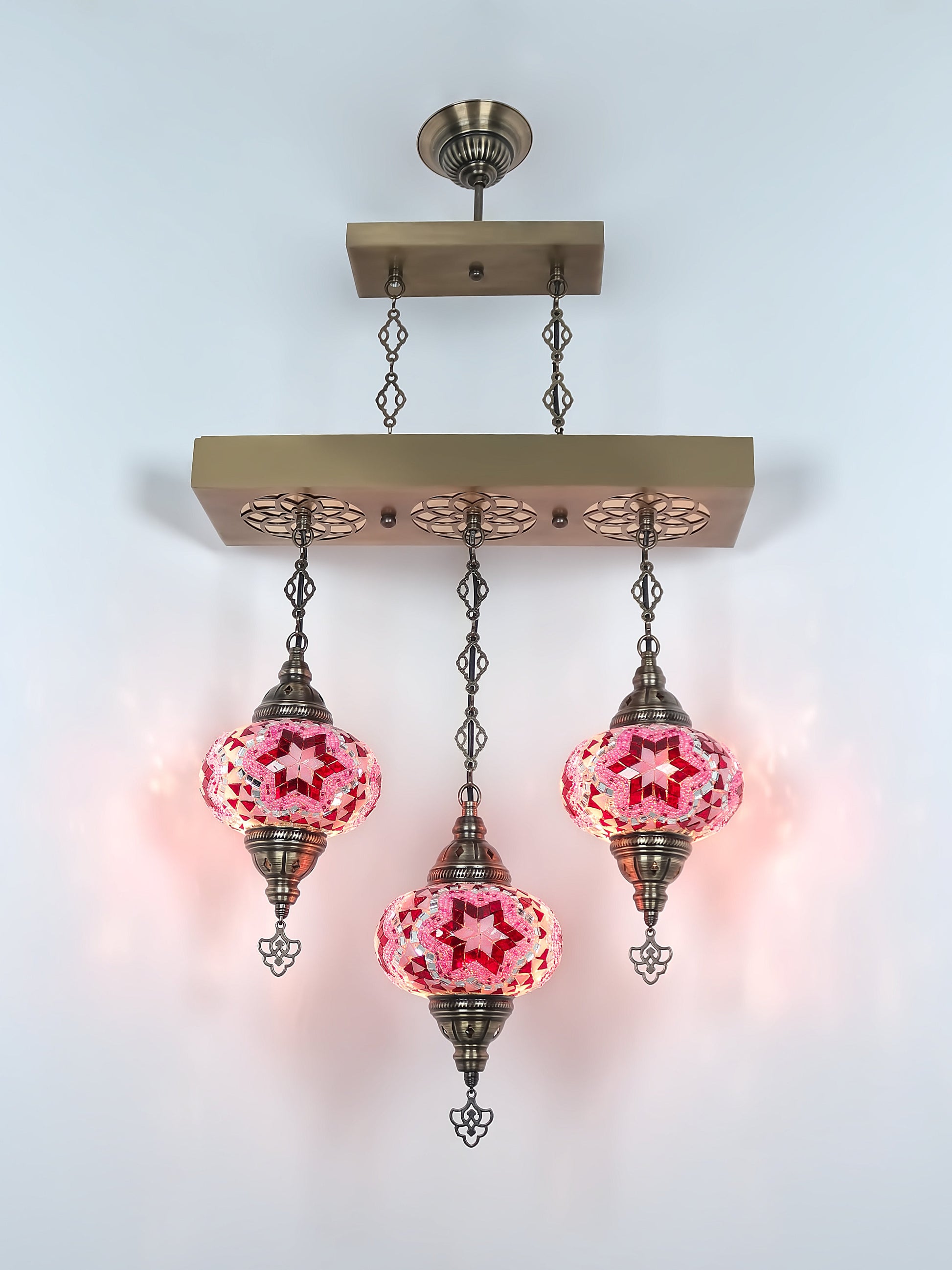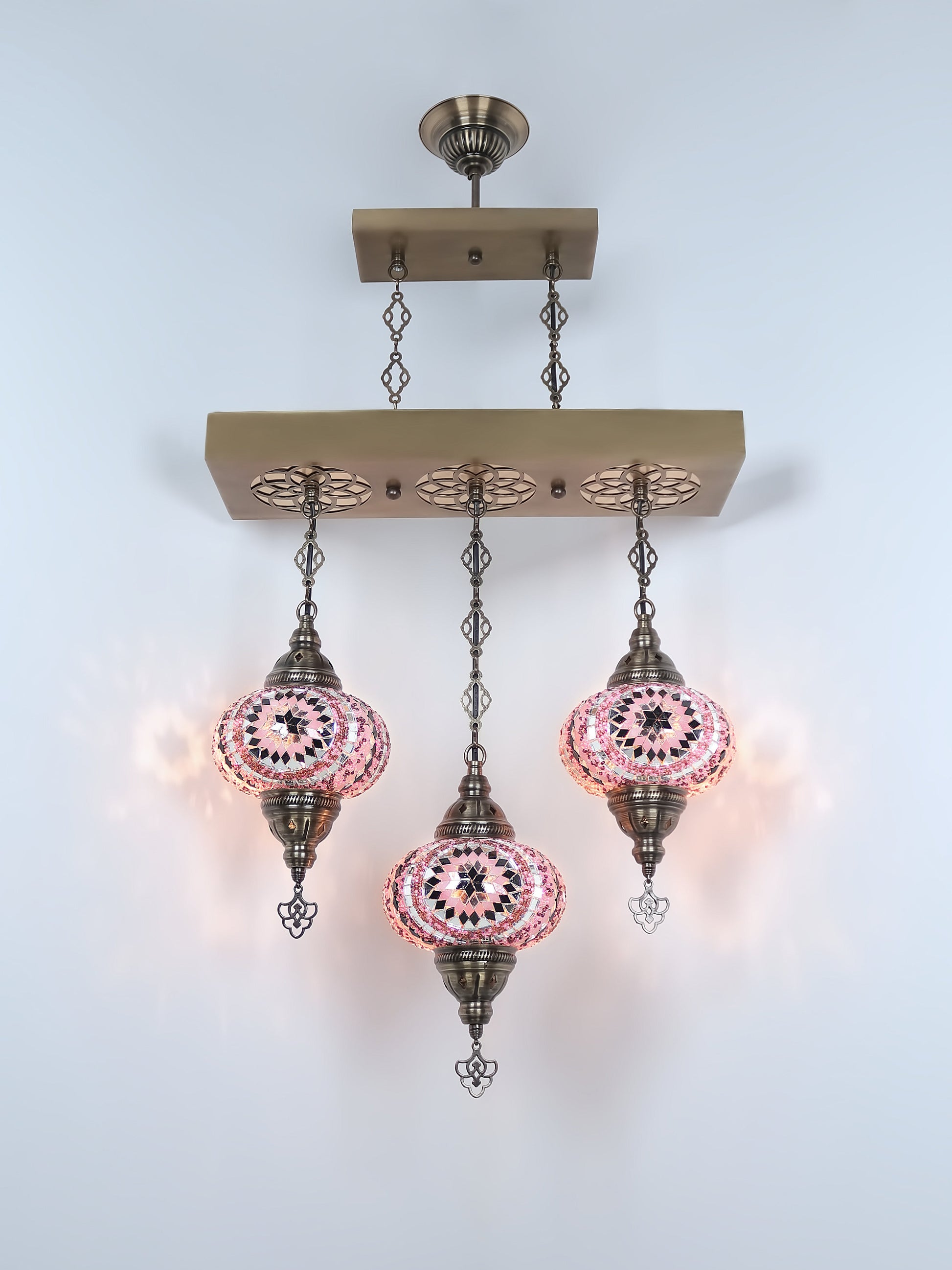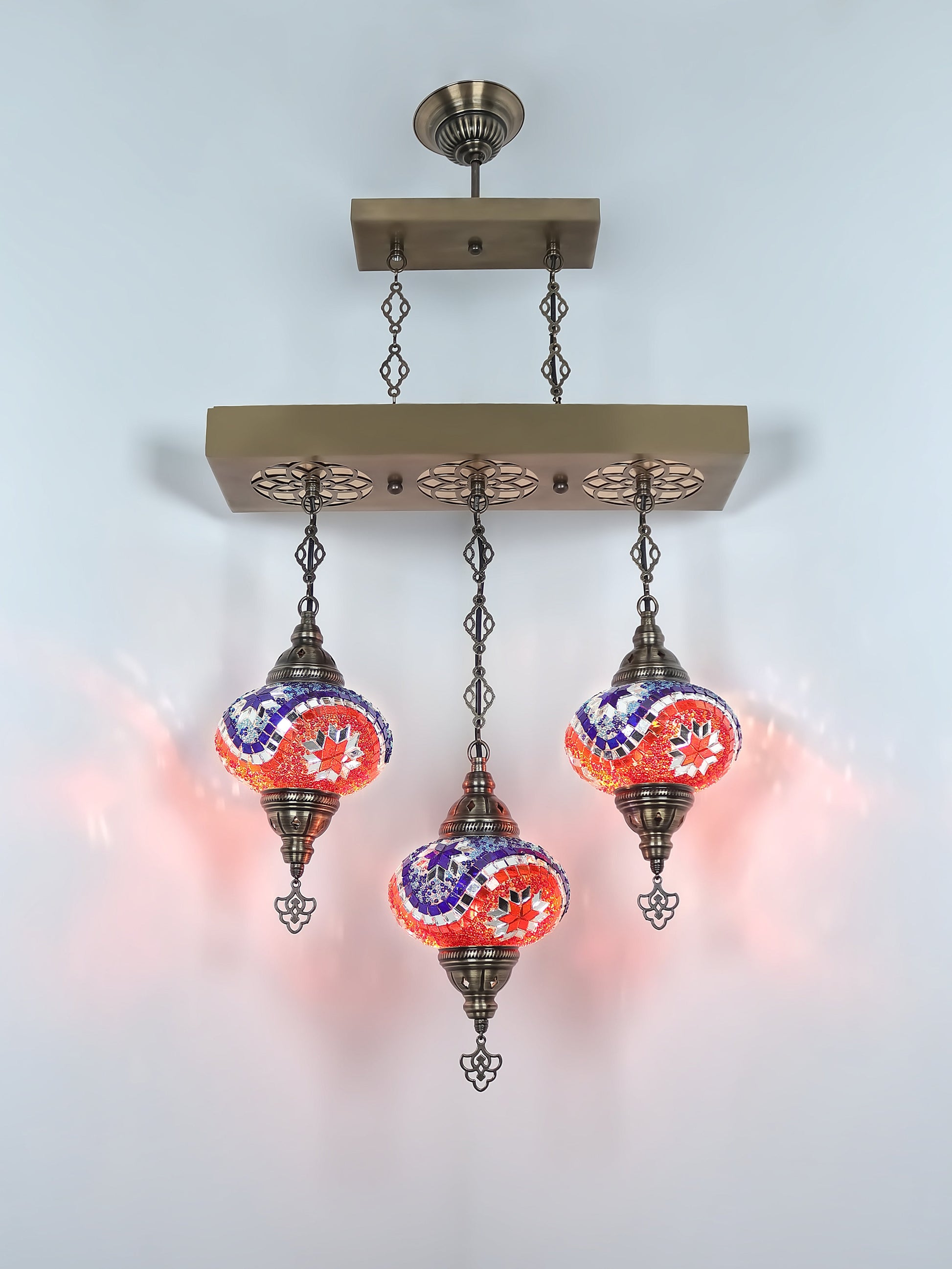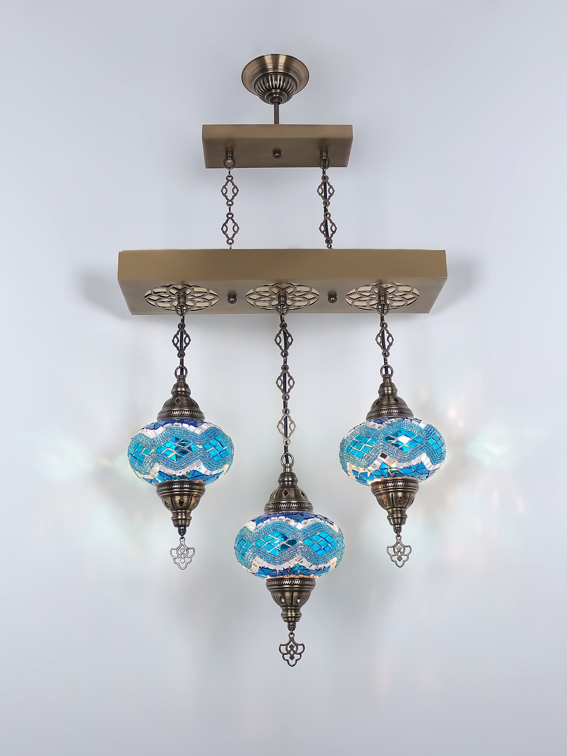 Our Turkish Mosaic Glass Chandeliers feature a Bohemian glass core overlaid with hand cut glass and beads to form various mosaic designs. This process is entirely handmade which makes each piece unique. Even if one lamp features the same design and colors of another, they are never an exact reproduction of each other. Each metal frame is individually wheeled. Metal finish color is antique brass.