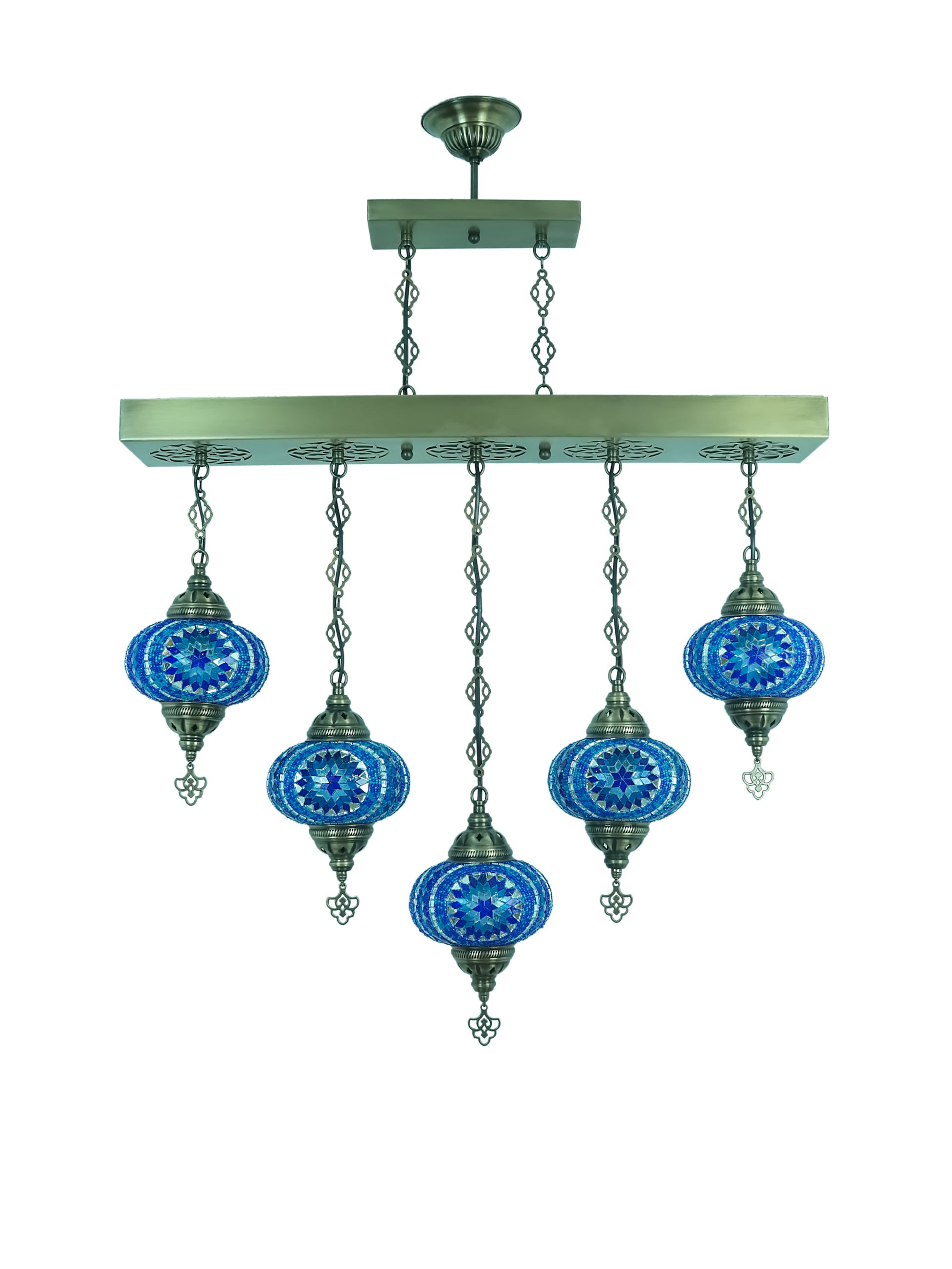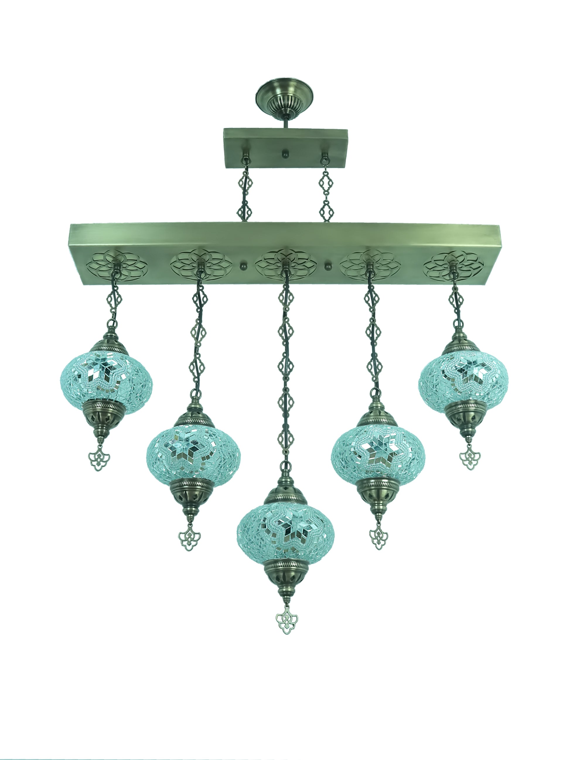 Our Turkish Mosaic Glass Chandeliers feature a Bohemian glass core overlaid with hand cut glass and beads to form various mosaic designs. This process is entirely handmade which makes each piece unique. Even if one lamp features the same design and colors of another, they are never an exact reproduction of each other. Each metal frame is individually wheeled. Metal finish color is antique brass.