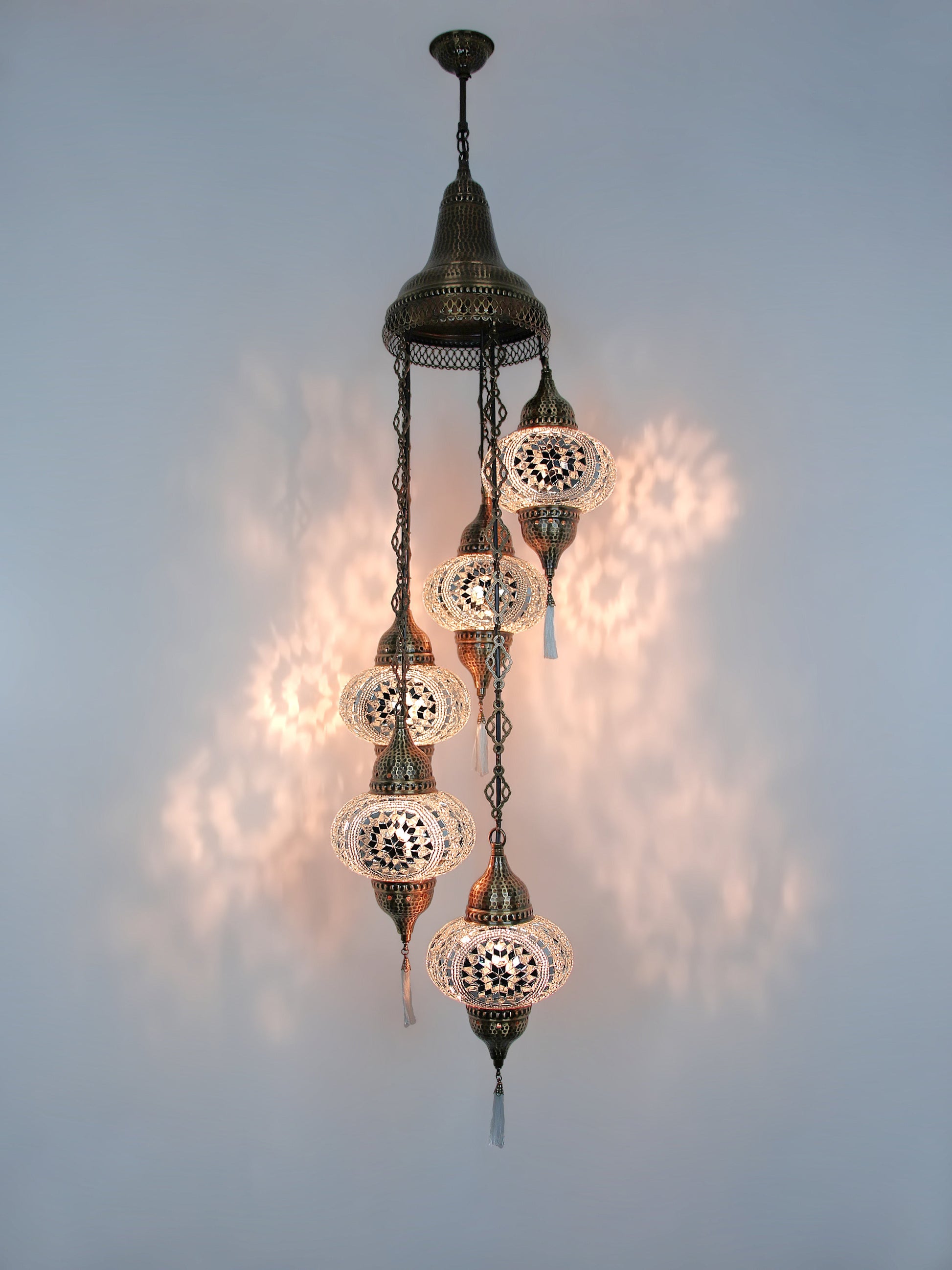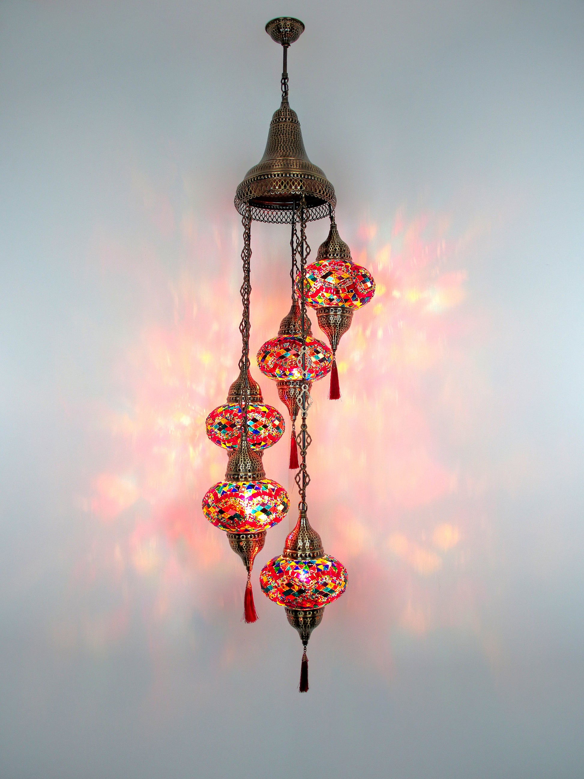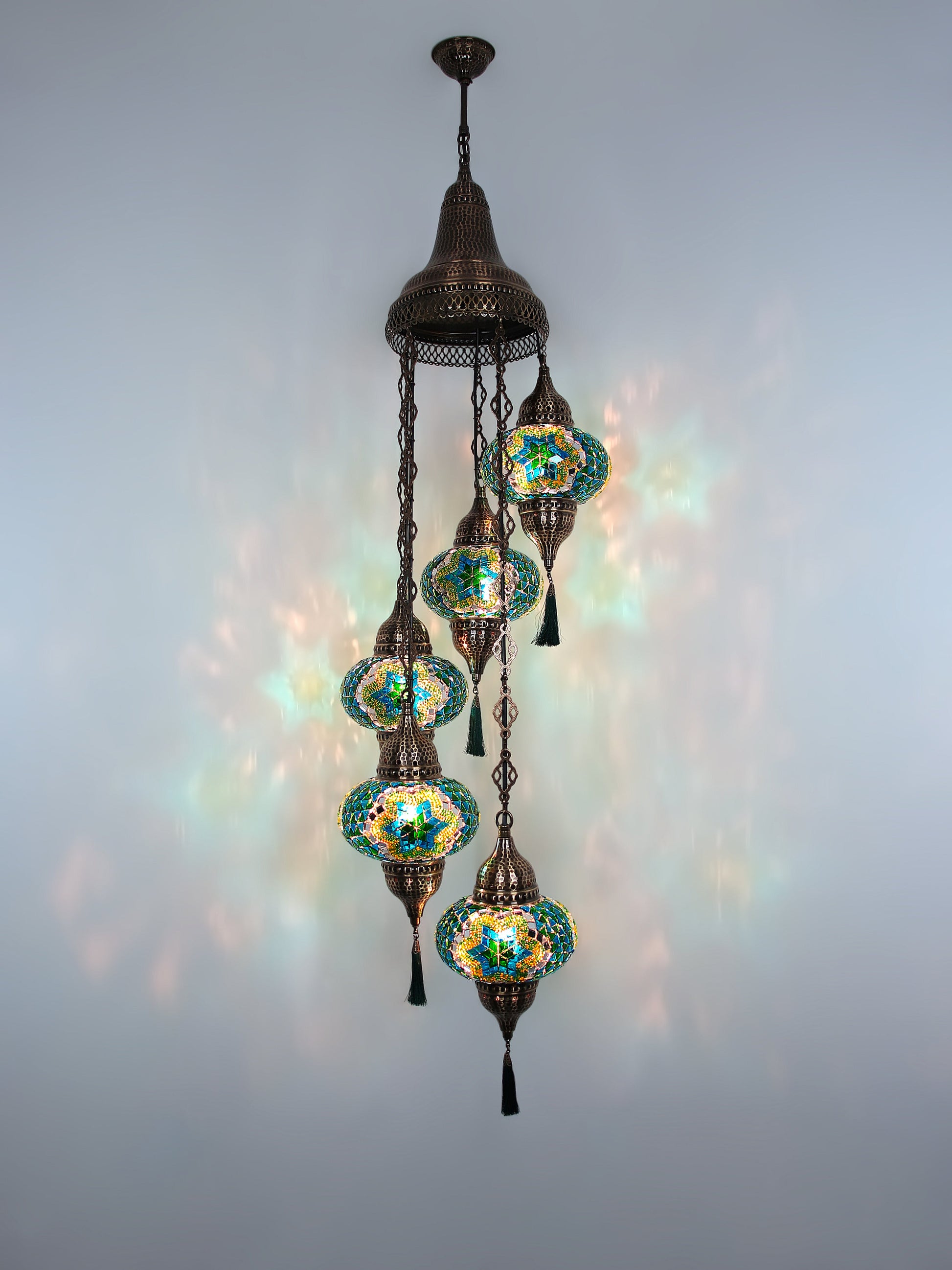 Our Turkish Mosaic Glass Chandeliers feature a Bohemian glass core overlaid with hand cut glass and beads to form various mosaic designs. This process is entirely handmade which makes each piece unique. Even if one lamp features the same design and colors of another, they are never an exact reproduction of each other. Each metal frame is individually wheeled. Metal finish color is antique brass.