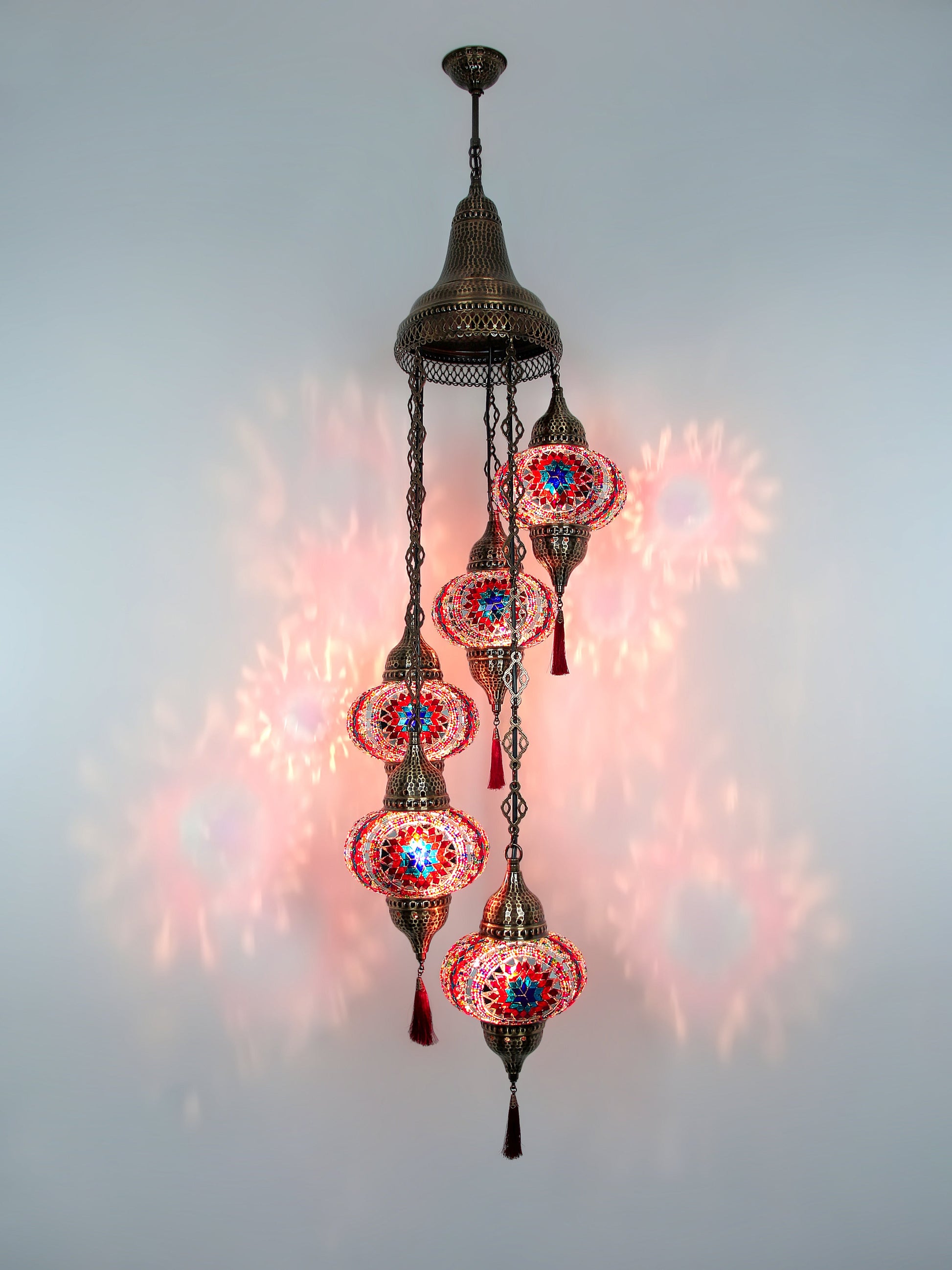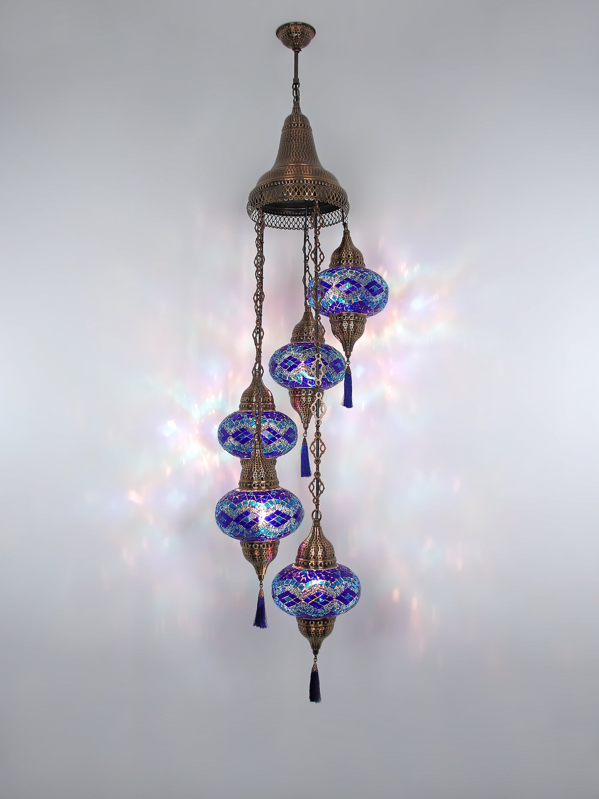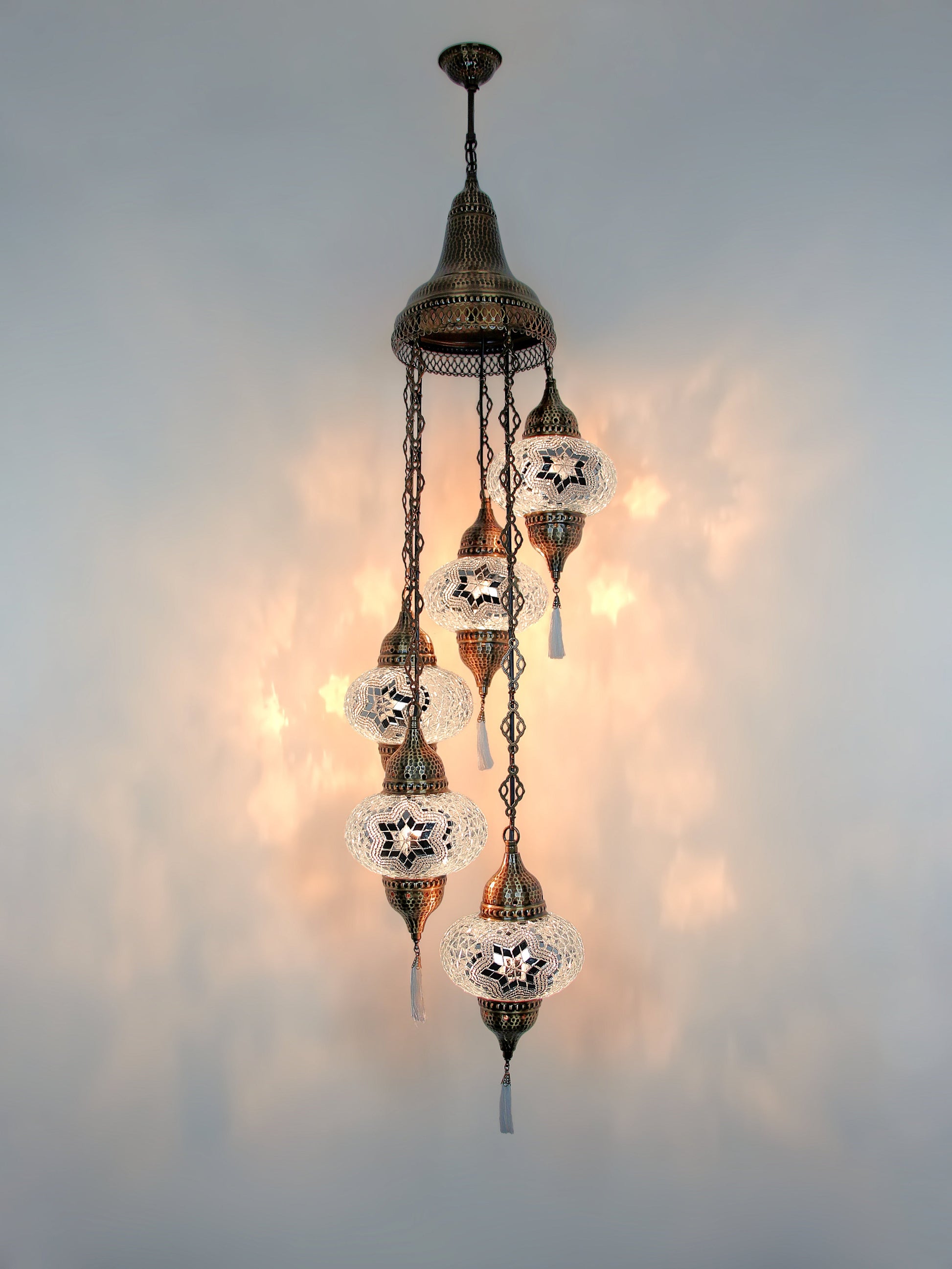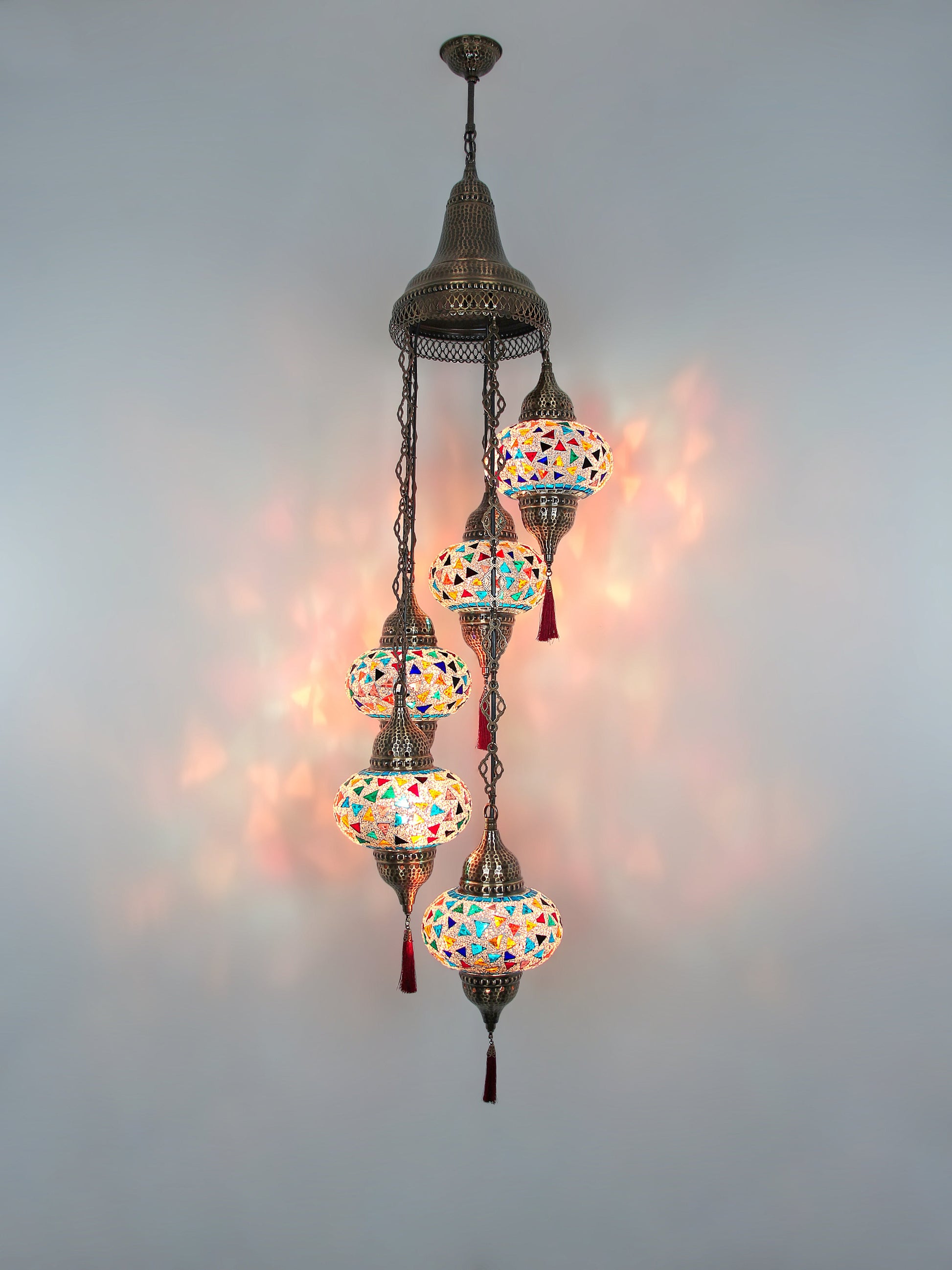 Our Turkish Mosaic Glass Chandeliers feature a Bohemian glass core overlaid with hand cut glass and beads to form various mosaic designs. This process is entirely handmade which makes each piece unique. Even if one lamp features the same design and colors of another, they are never an exact reproduction of each other. Each metal frame is individually wheeled. Metal finish color is antique brass.
