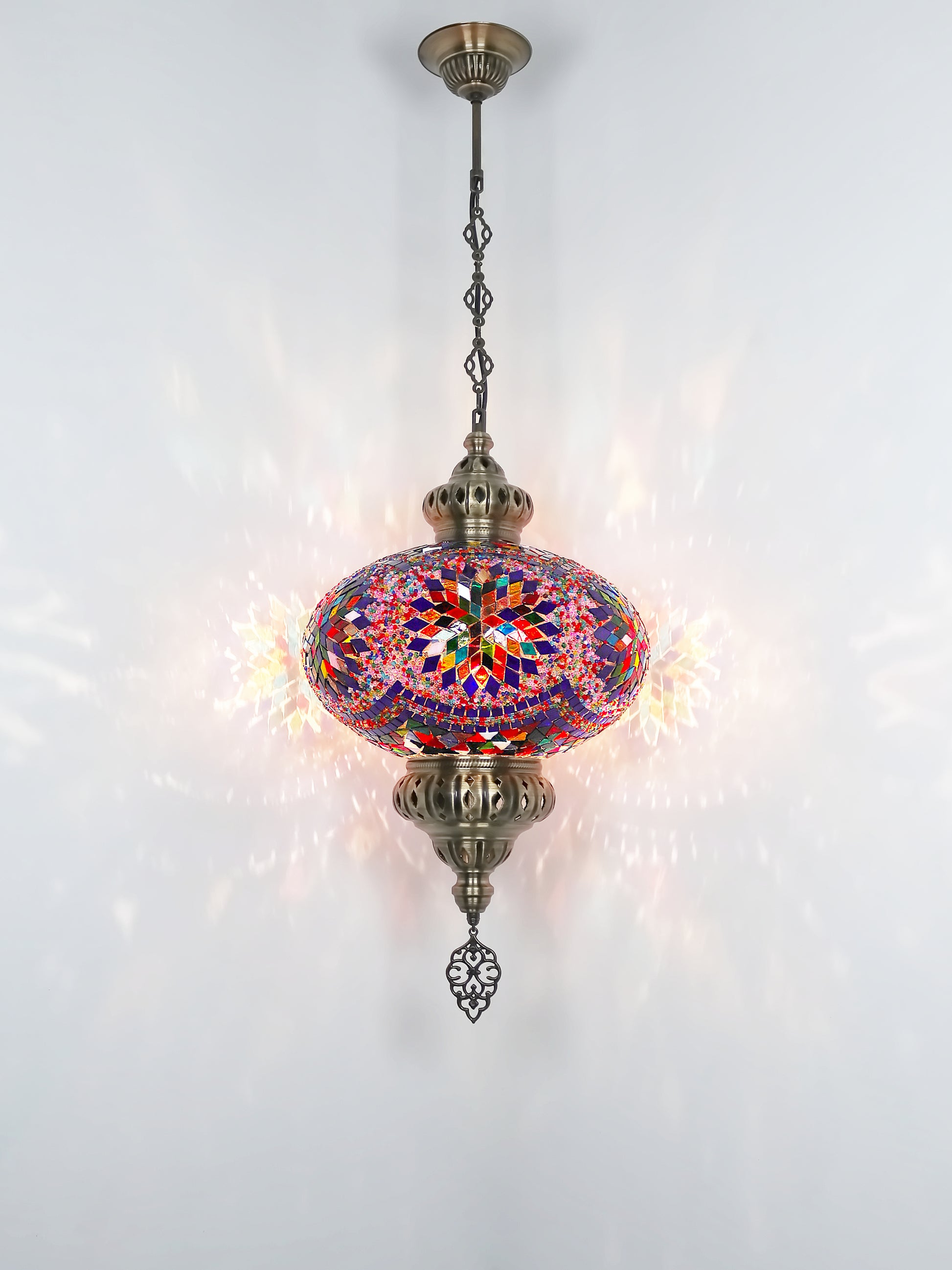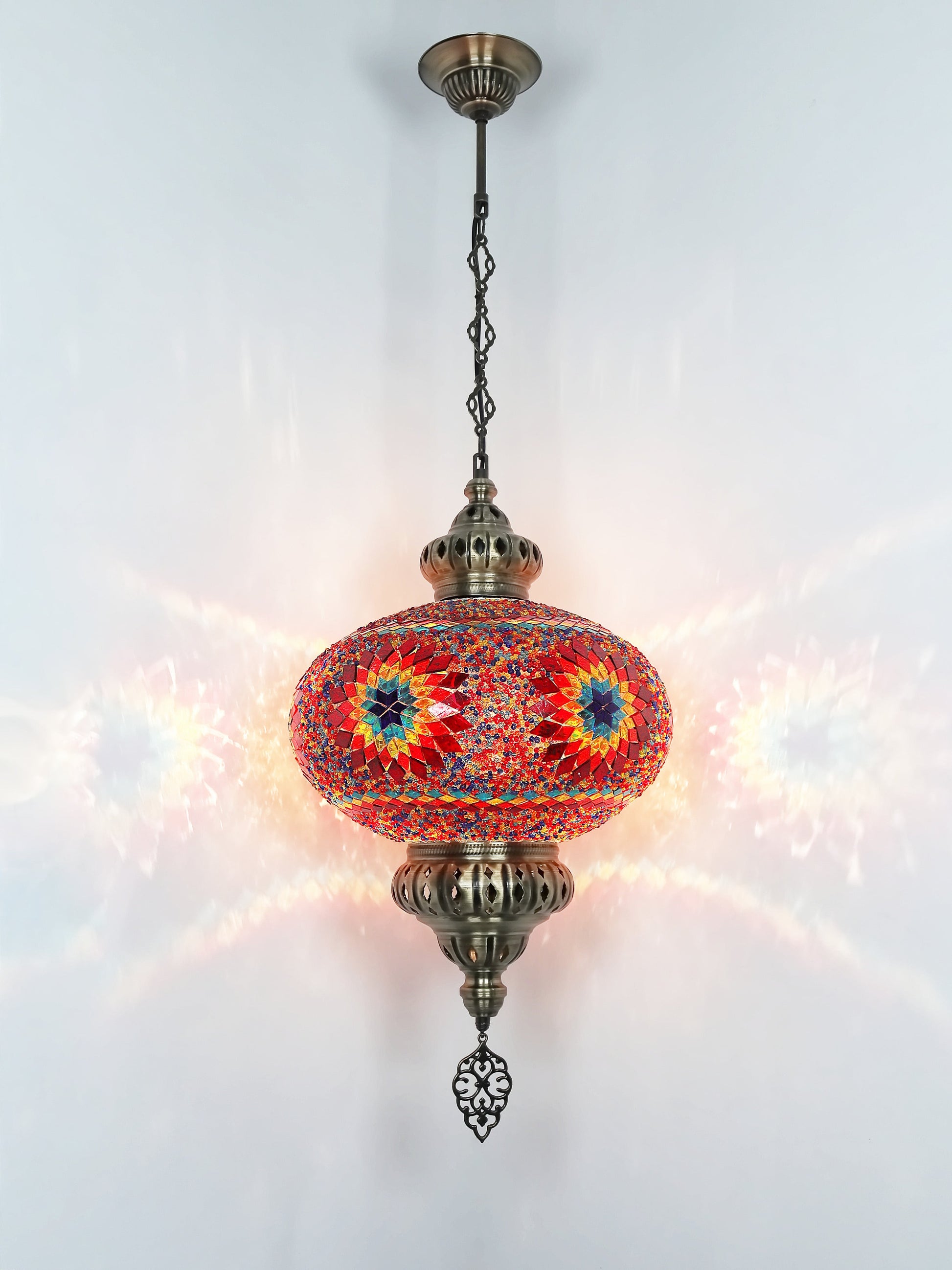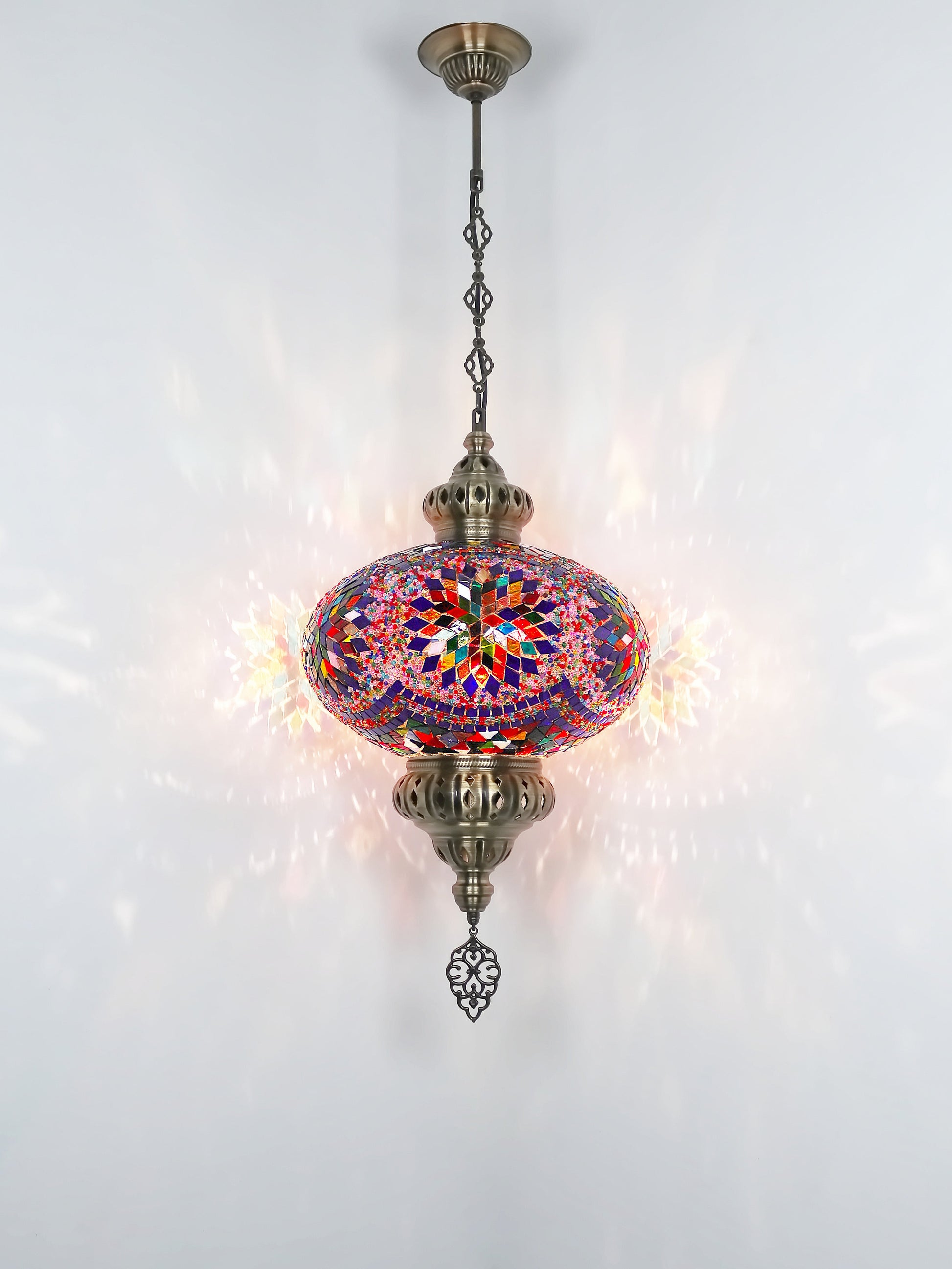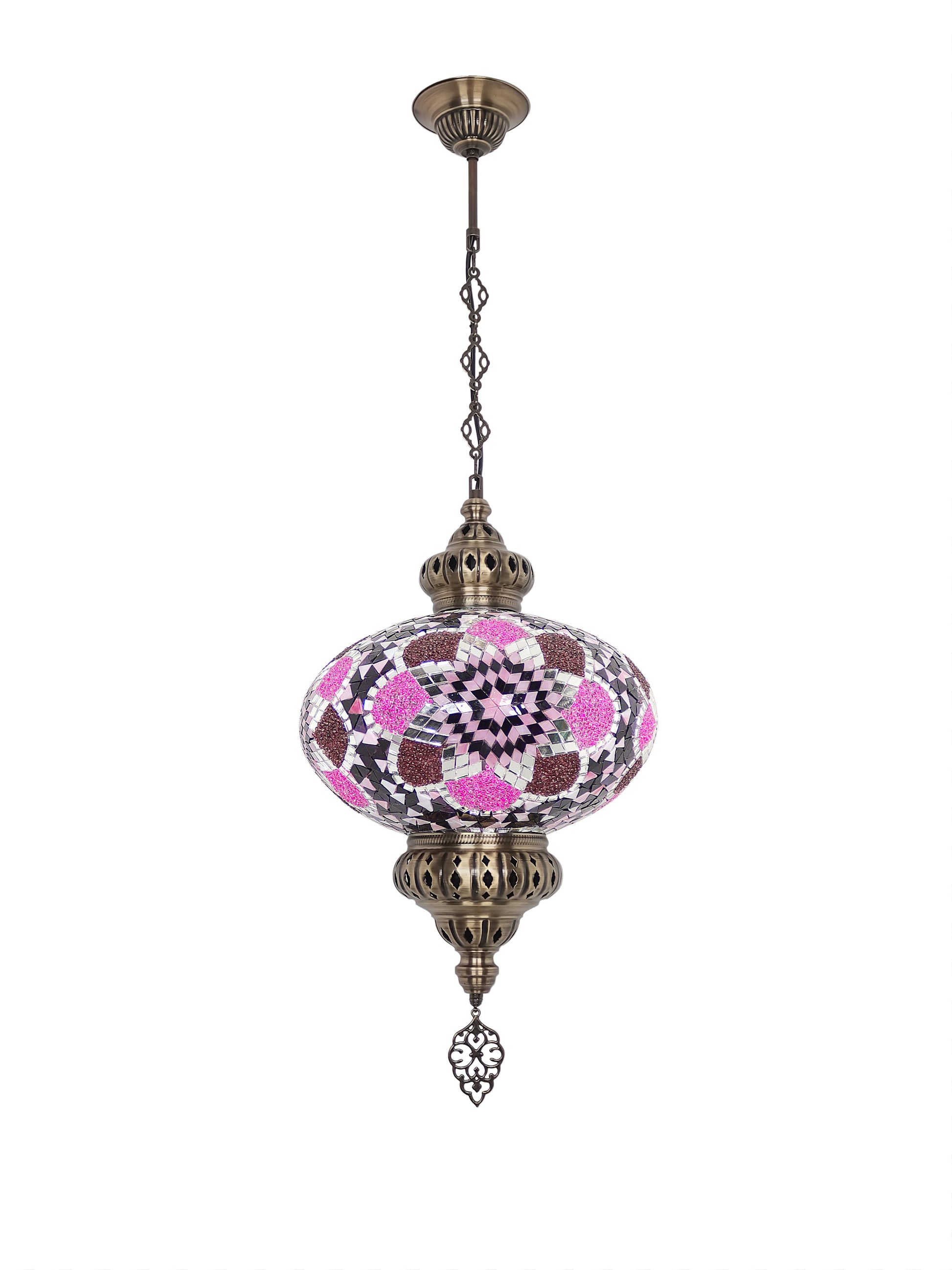 Our Turkish Pendant Lanterns feature a Bohemian glass core overlaid with hand cut glass and beads to form various mosaic designs. This process is entirely handmade which makes each piece unique. Even if one lamp features the same design and colors of another, they are never an exact reproduction of each other. Each metal frame is individually wheeled.