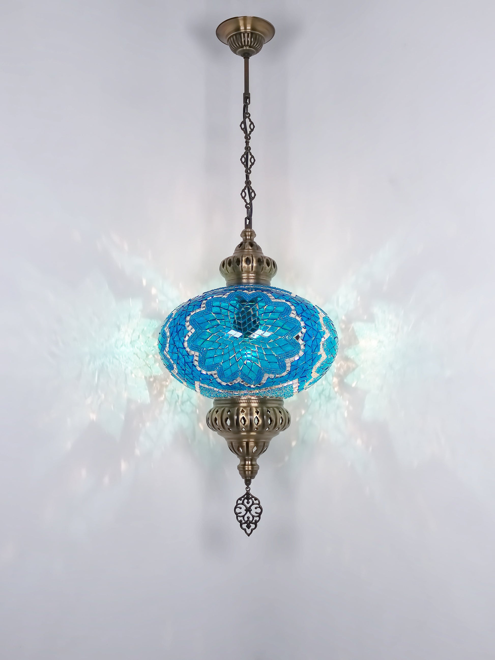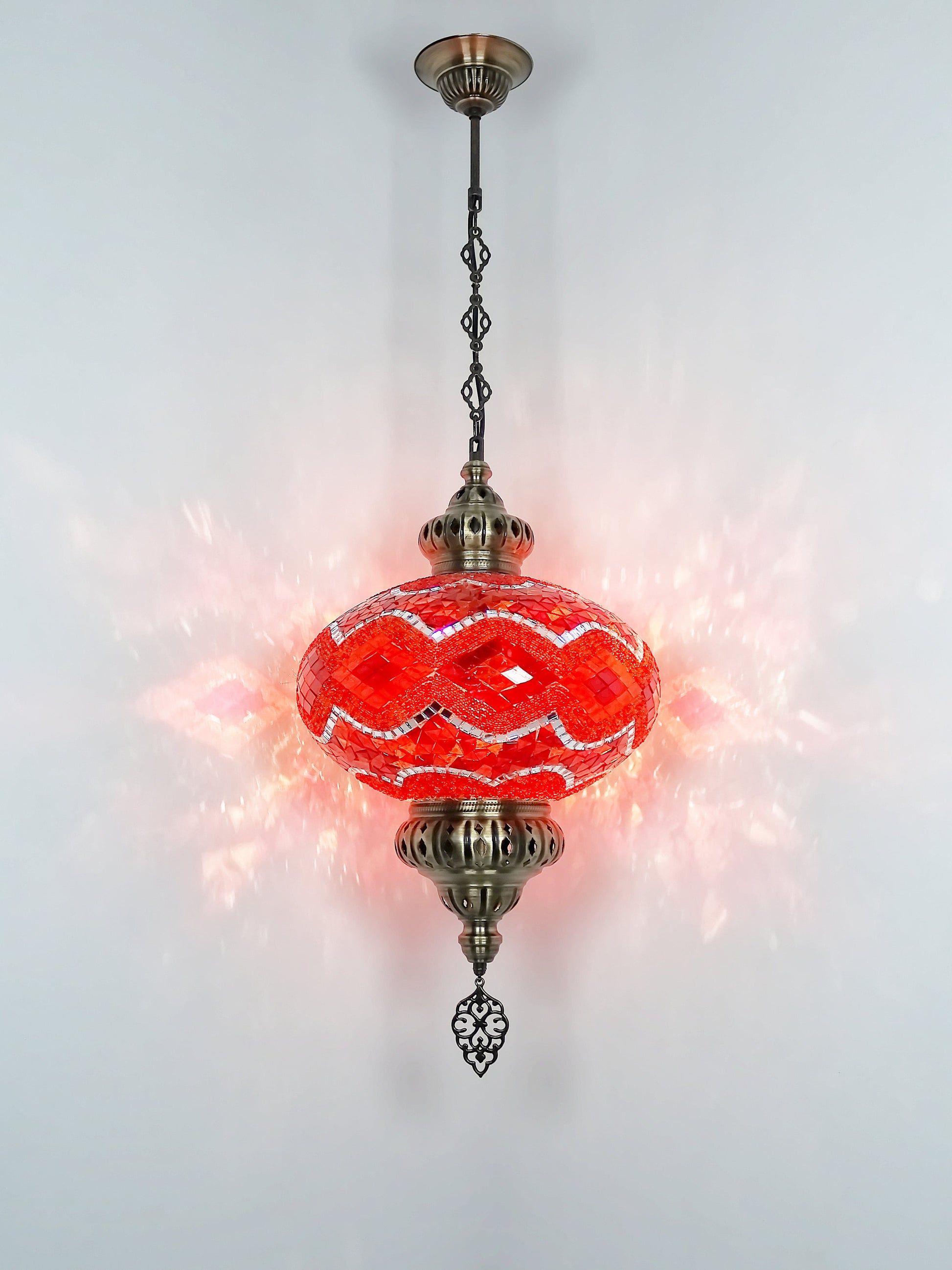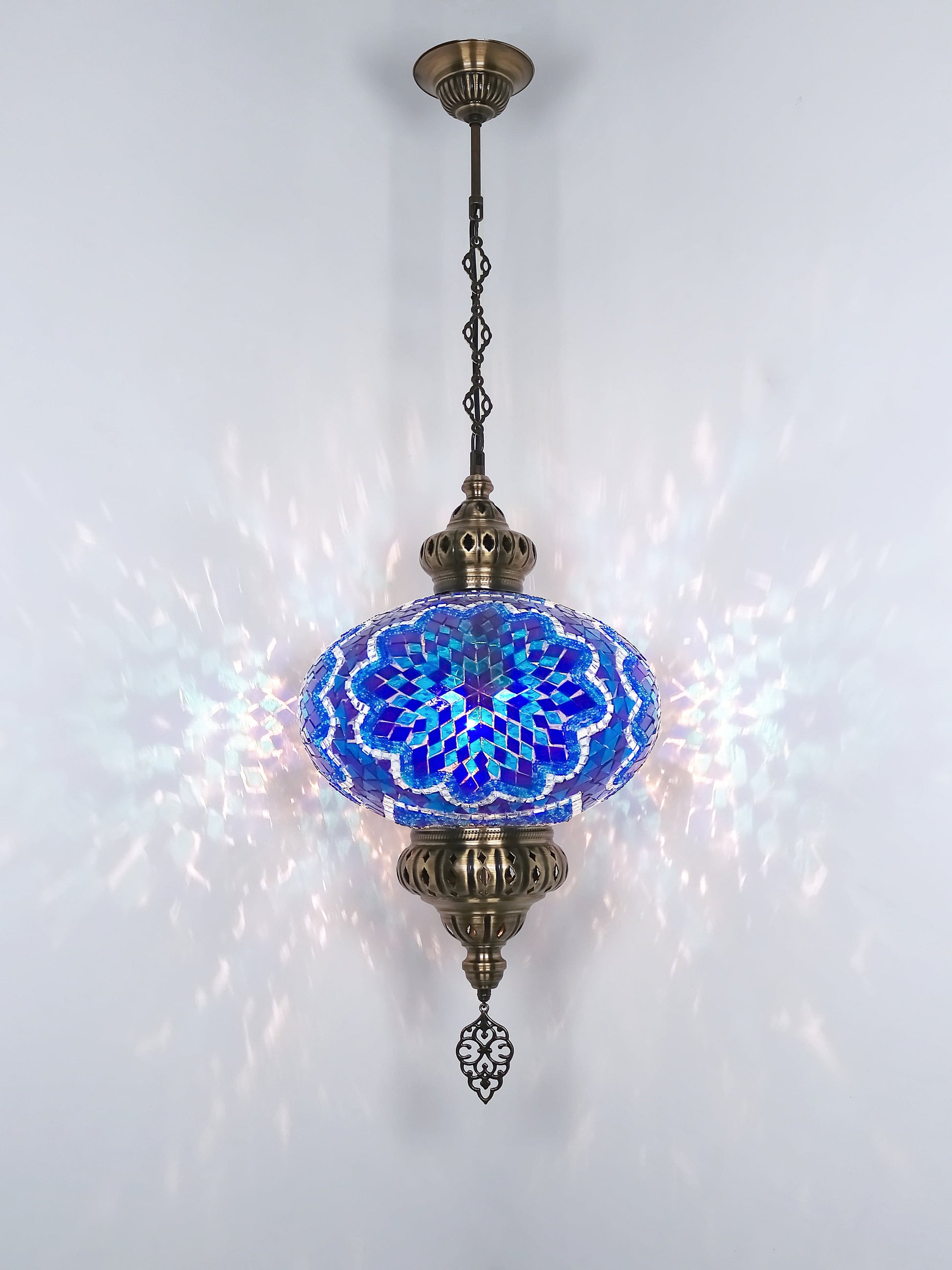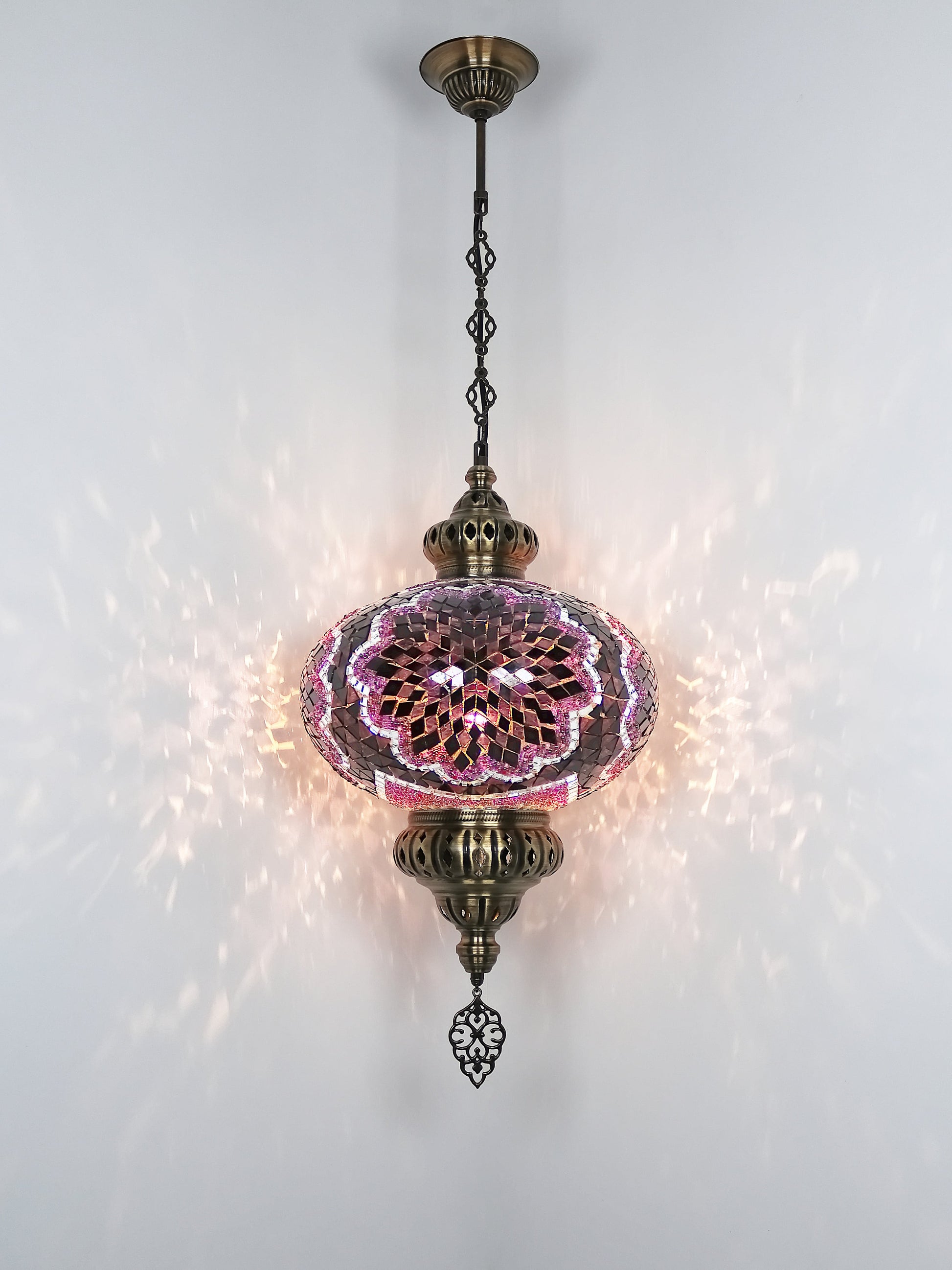 Our Turkish Pendant Lanterns feature a Bohemian glass core overlaid with hand cut glass and beads to form various mosaic designs. This process is entirely handmade which makes each piece unique. Even if one lamp features the same design and colors of another, they are never an exact reproduction of each other. Each metal frame is individually wheeled.