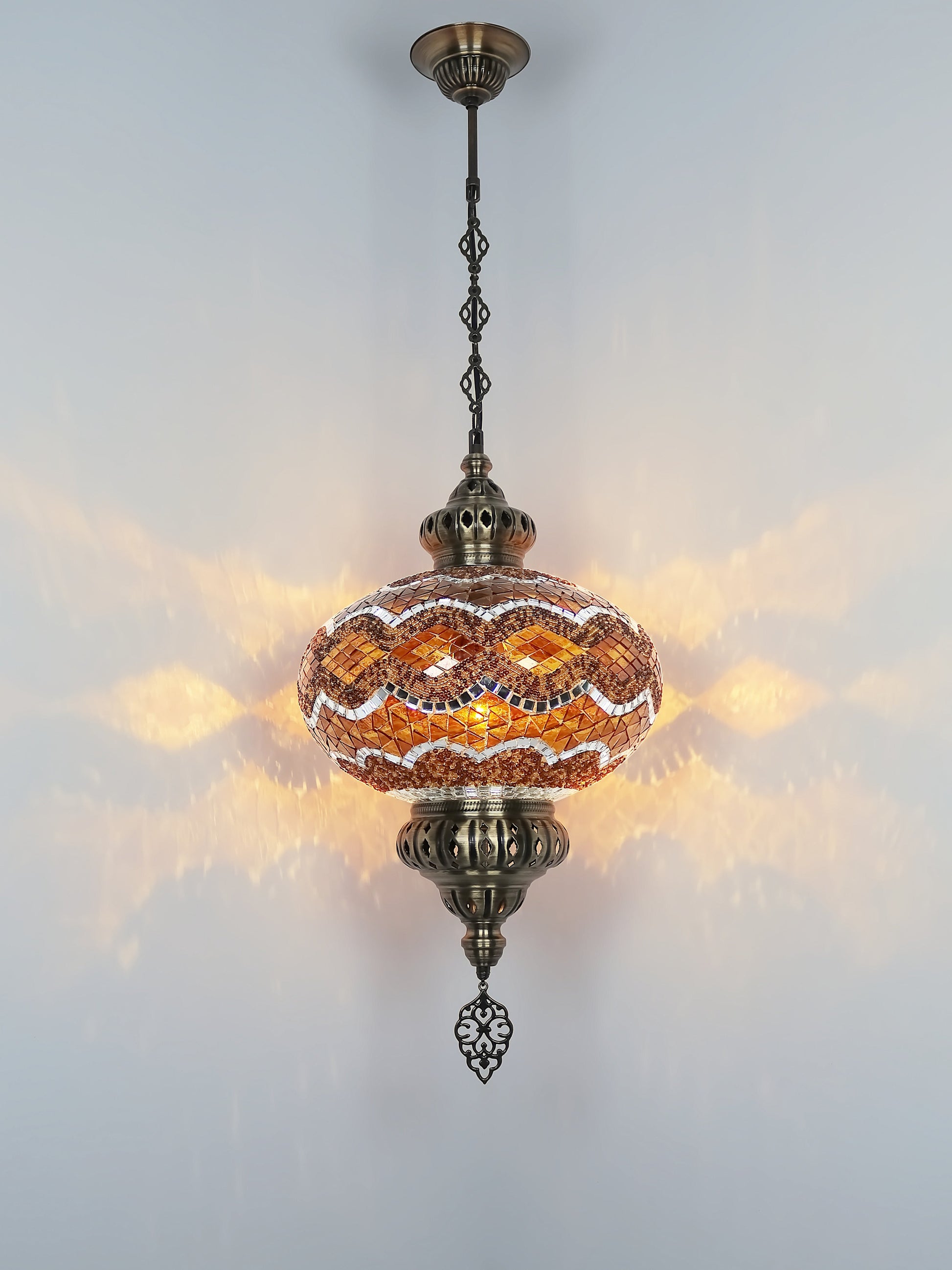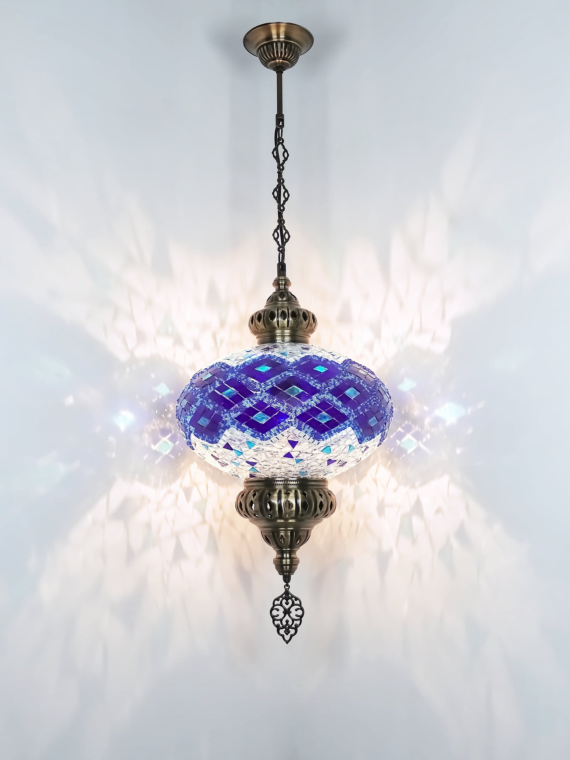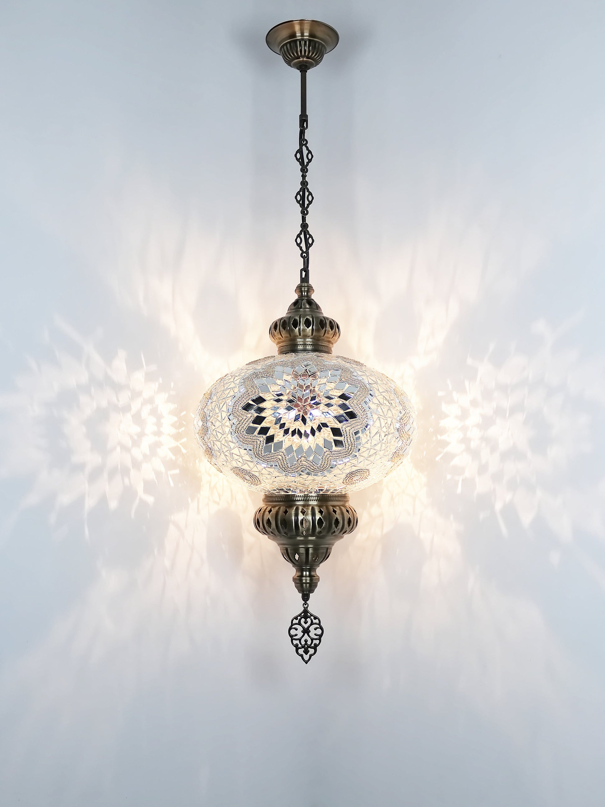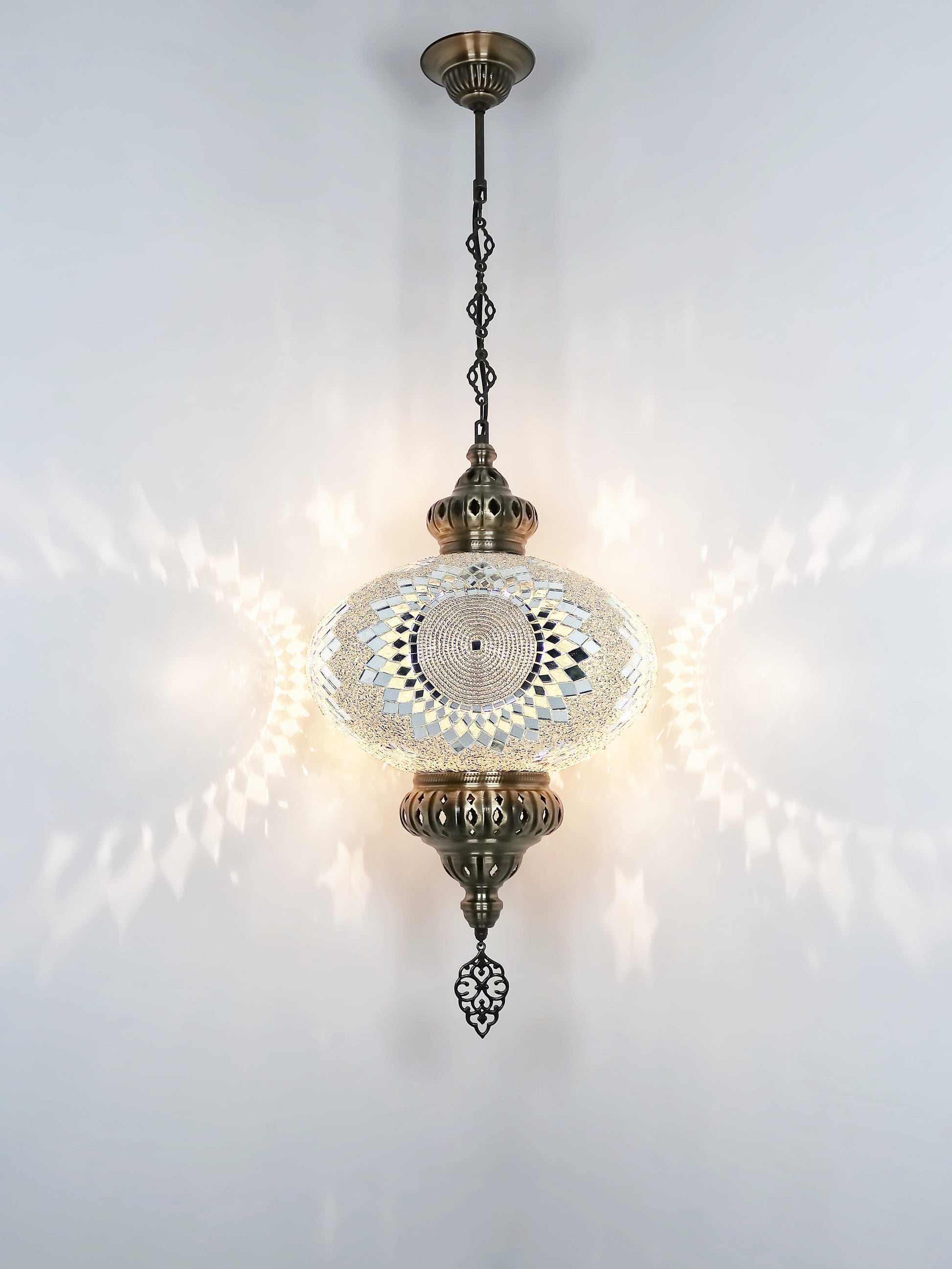 Our Turkish Pendant Lanterns feature a Bohemian glass core overlaid with hand cut glass and beads to form various mosaic designs. This process is entirely handmade which makes each piece unique. Even if one lamp features the same design and colors of another, they are never an exact reproduction of each other. Each metal frame is individually wheeled.