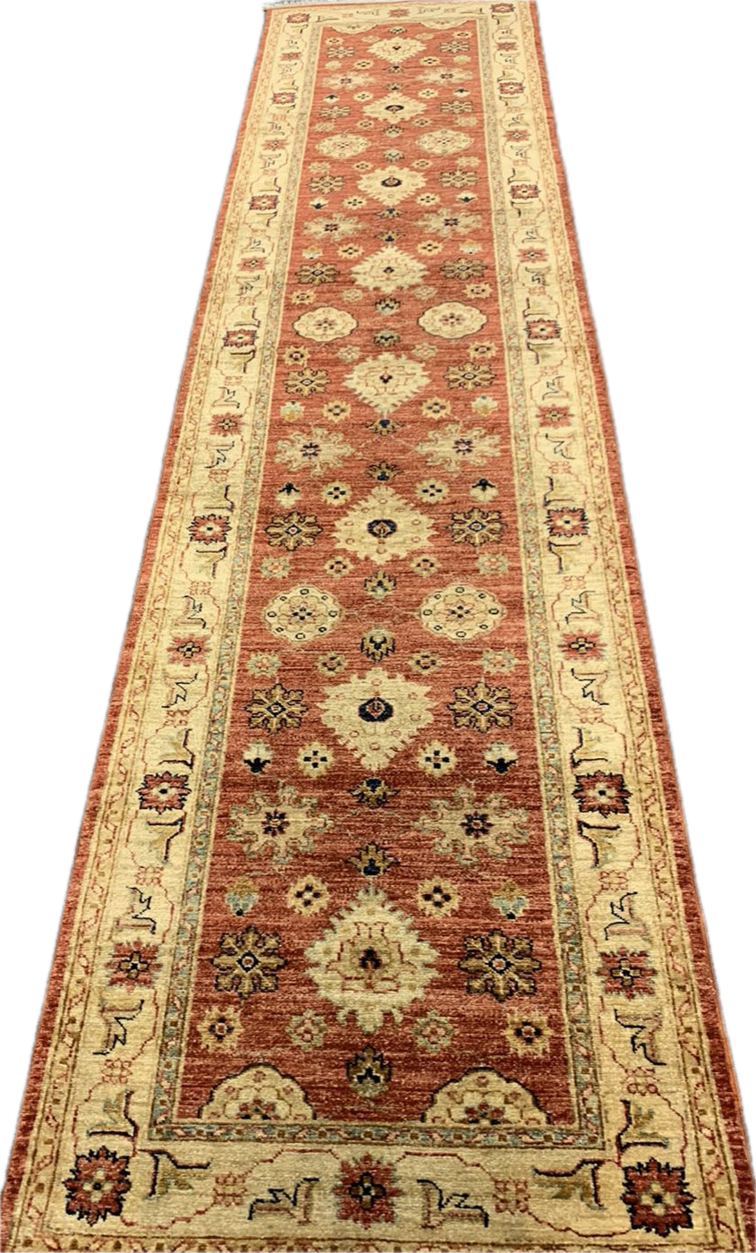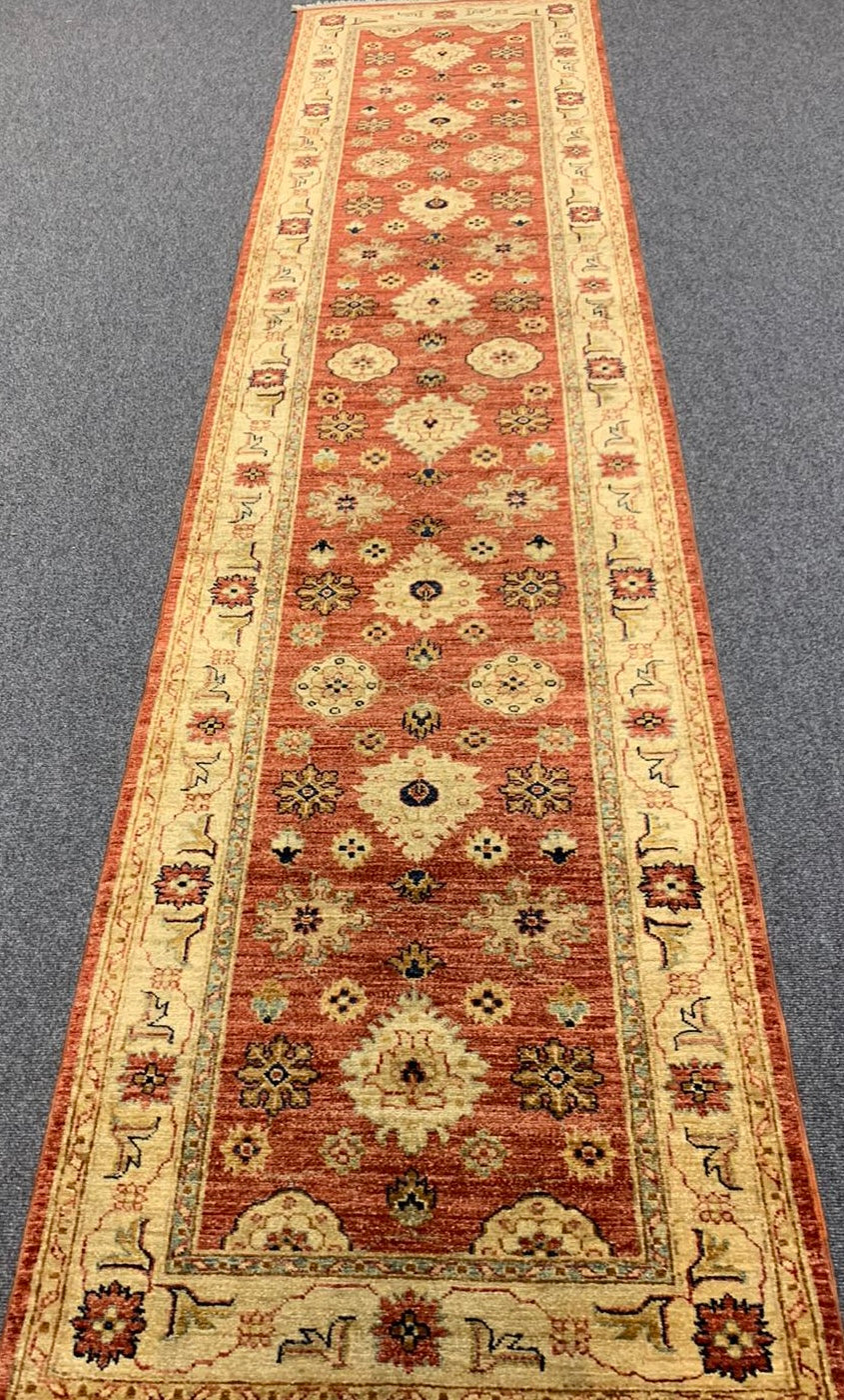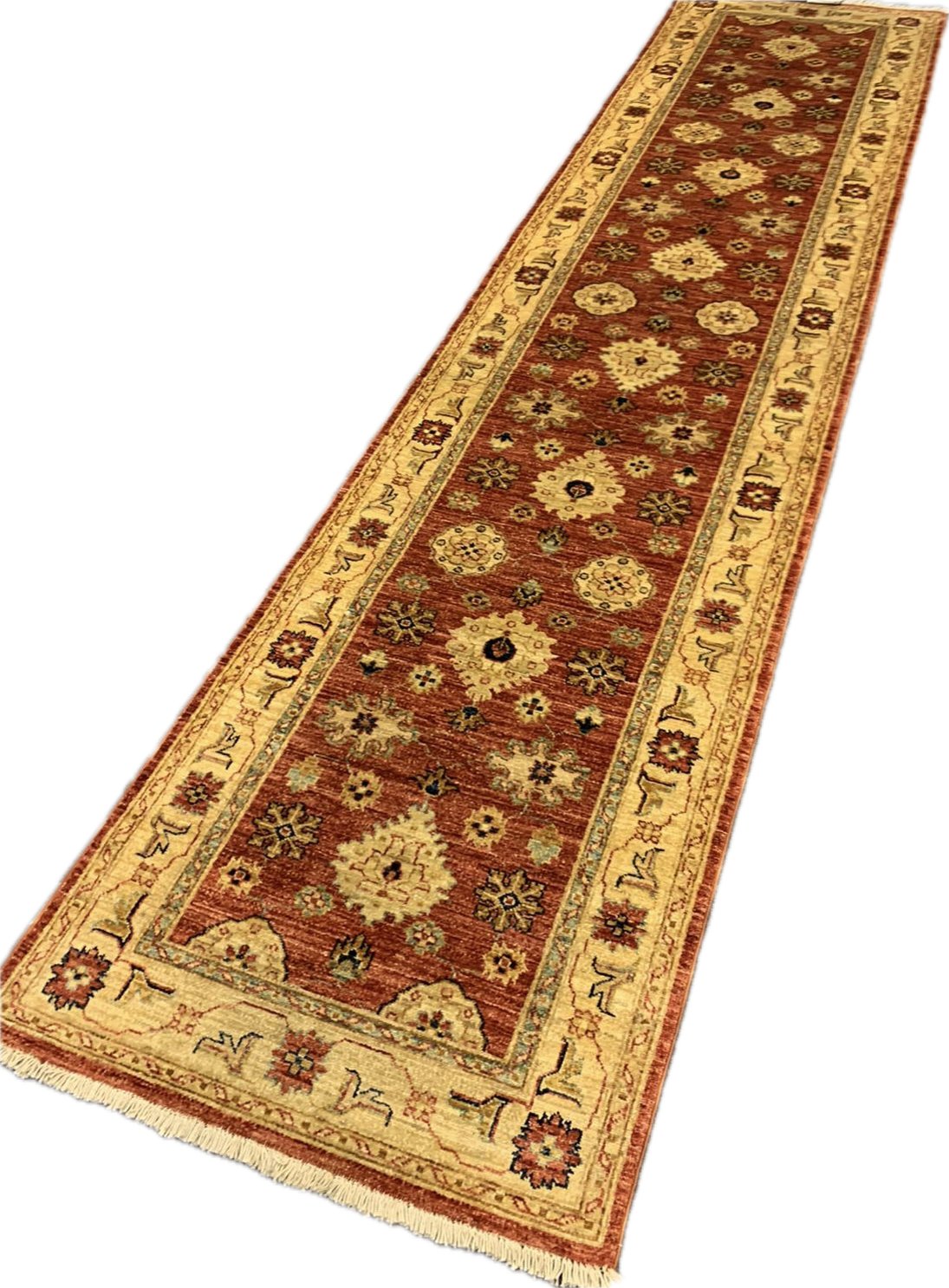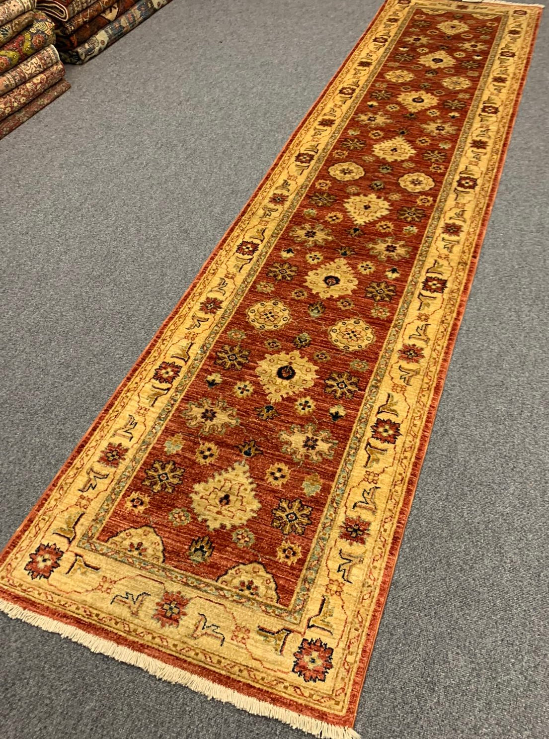 This runner is a reproduction of an antique Ushak rug with 100% handspun, non-bleached wool, (hance the color variation). It is beautifully hand knotted with all natural materials from wool to dyes. Hailing from western Turkey, Oushak rugs have a rich history dating back to the 15th century Ottoman Empire. These masterpieces, originally hand-knotted in the city of Usak, feature luxurious, shining wool and radiant colors.