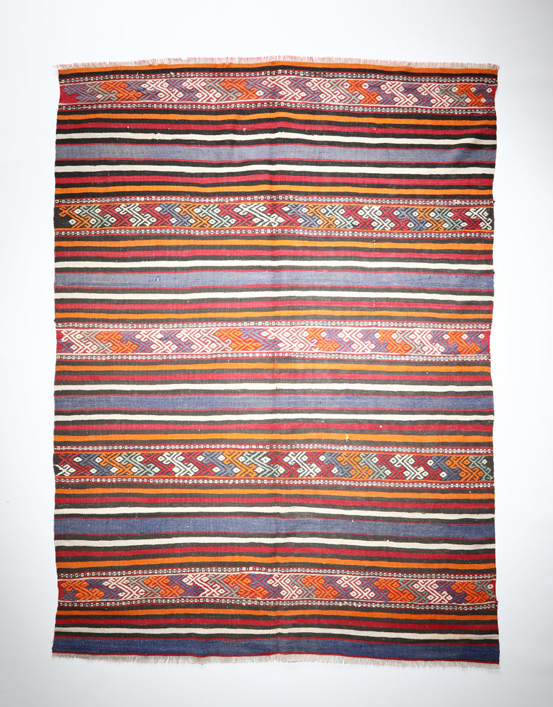 Balikesir kilims are a type of handwoven rug originating from the Balikesir region in northwest Anatolia, Turkey. These rugs are deeply connected to the nomadic customs of the Yüncü people. The first documented Turkish kilim can be traced back to Neolithic pottery from Çatalhöyük, dating back to 7000 BC. Originally used as blankets, saddle blankets, seat mats, or wall decorations, kilims with varied purposes, such as this one, were often created with striped patterns, known as "water channel" or "essence of life."