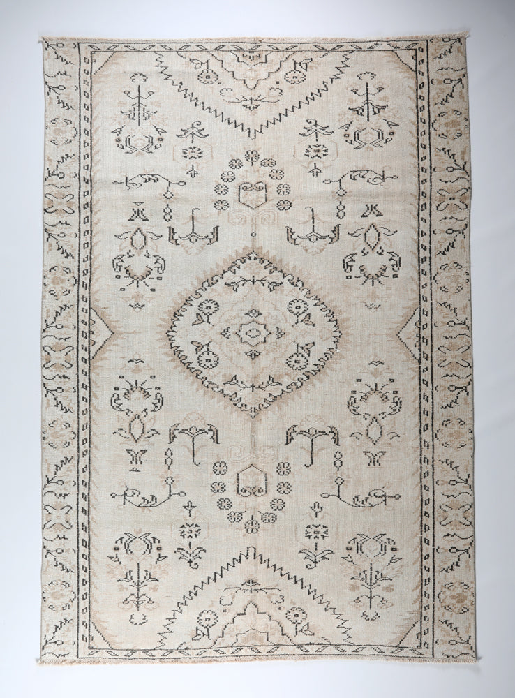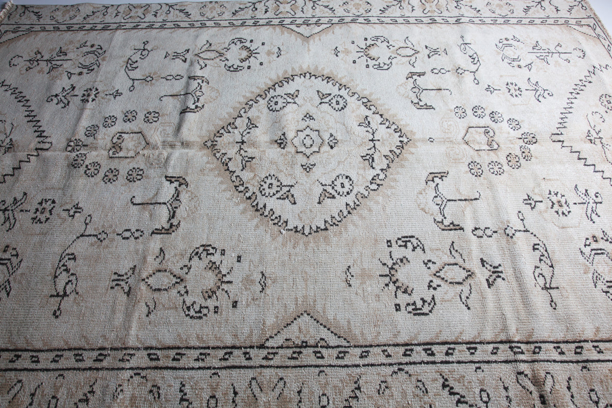 This vintage carpet is a meticulously hand-woven piece from Western Anatolia, featuring a distinctive whitewashed finish and low-sheared pile that allows it to seamlessly complement a wide variety of interior styles, from contemporary modern to rustic country living. Its design emphasizes highlighted motifs set against a neutral background, creating a subtle yet impactful focal point that enhances the natural beauty of any space. Combining traditional craftsmanship with understated elegance, this carpet offers both aesthetic versatility and enduring quality, making it an exceptional addition to sophisticated home decor.