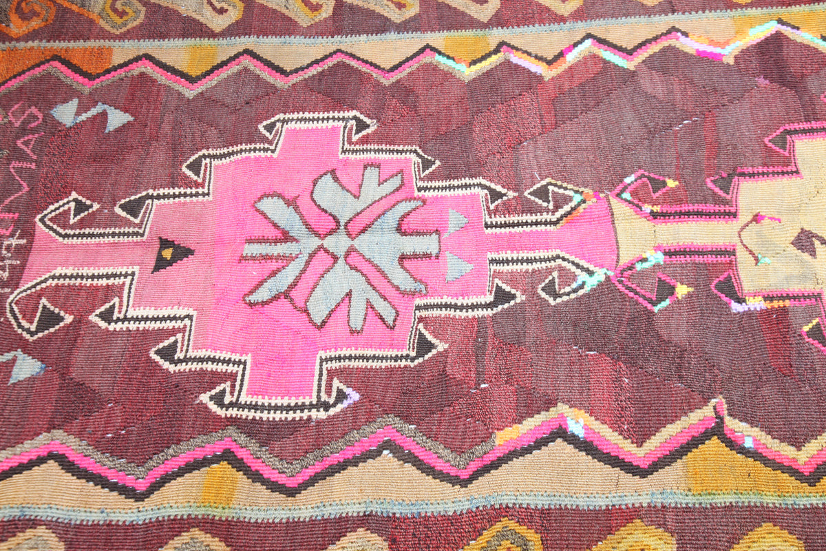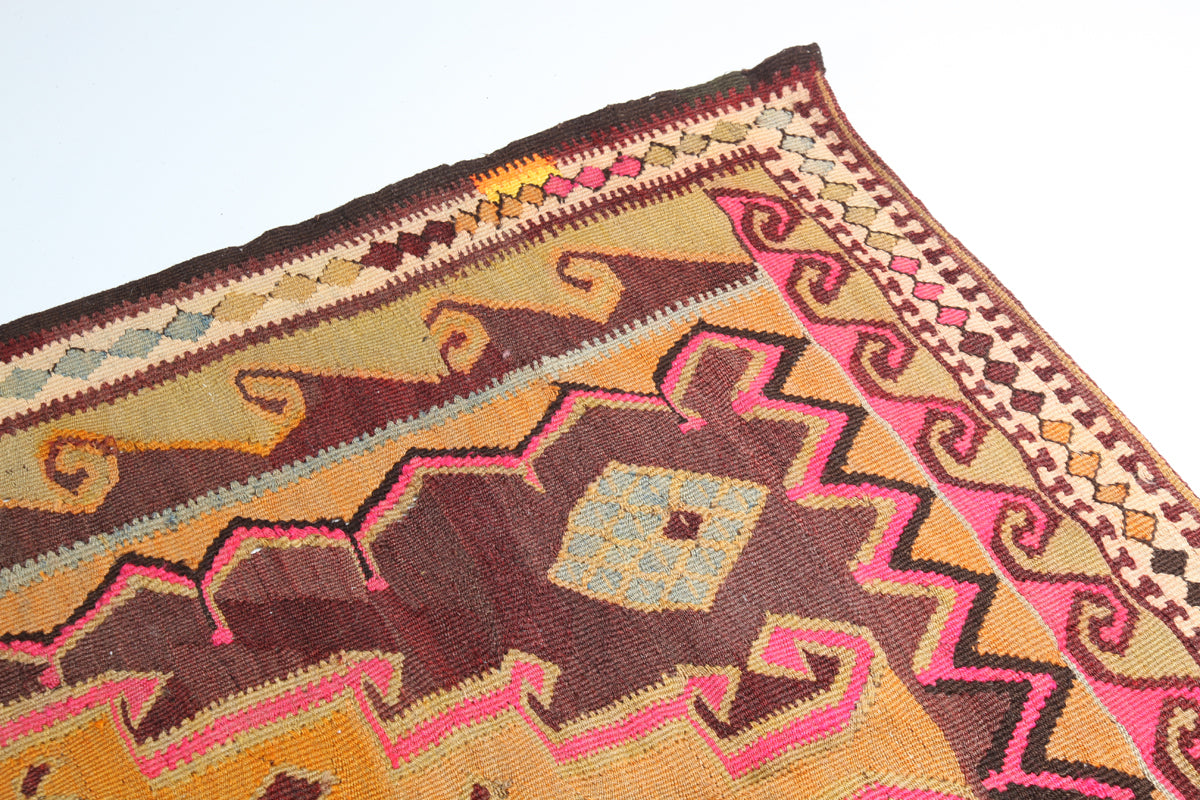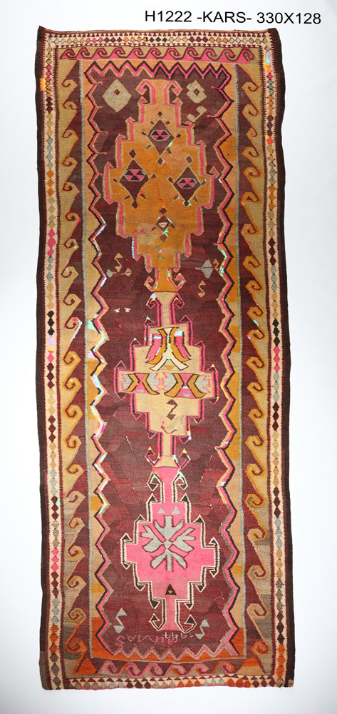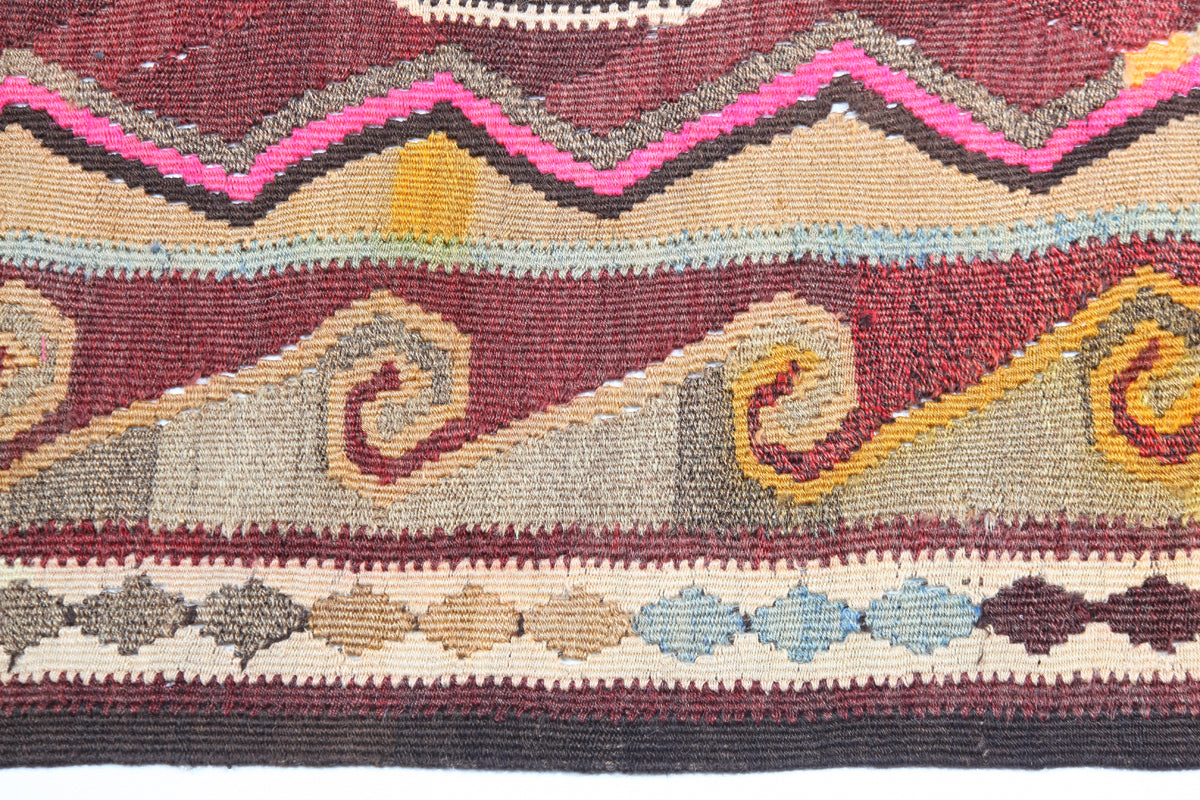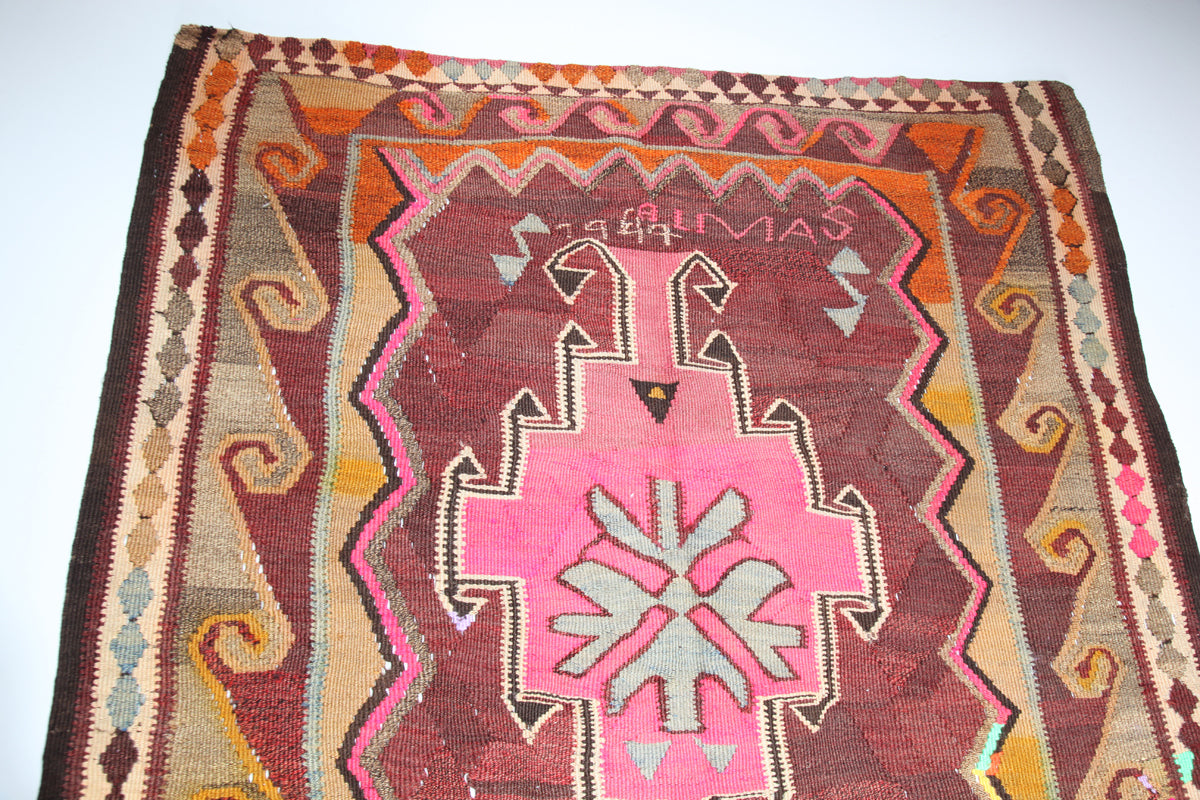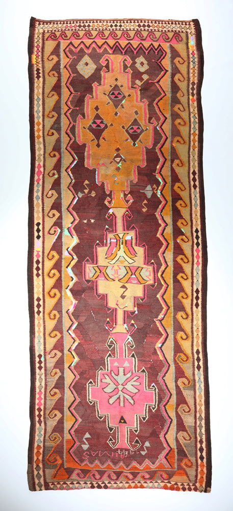 Woven by a skilled weaver in Kars, this kilim runner is woven in a wide and long style, making it ideal as a dowry or family piece. The weaver, proud of her work, dated and signed the rug, ensuring its value as a treasured piece. The kilim features a scorpion tail motif along the entire border, symbolizing dignity and pride while offering protection to its owner. Additionally, bright teal orlon highlights are scattered throughout the weaving, intended to dispel negative energy from the surroundings.