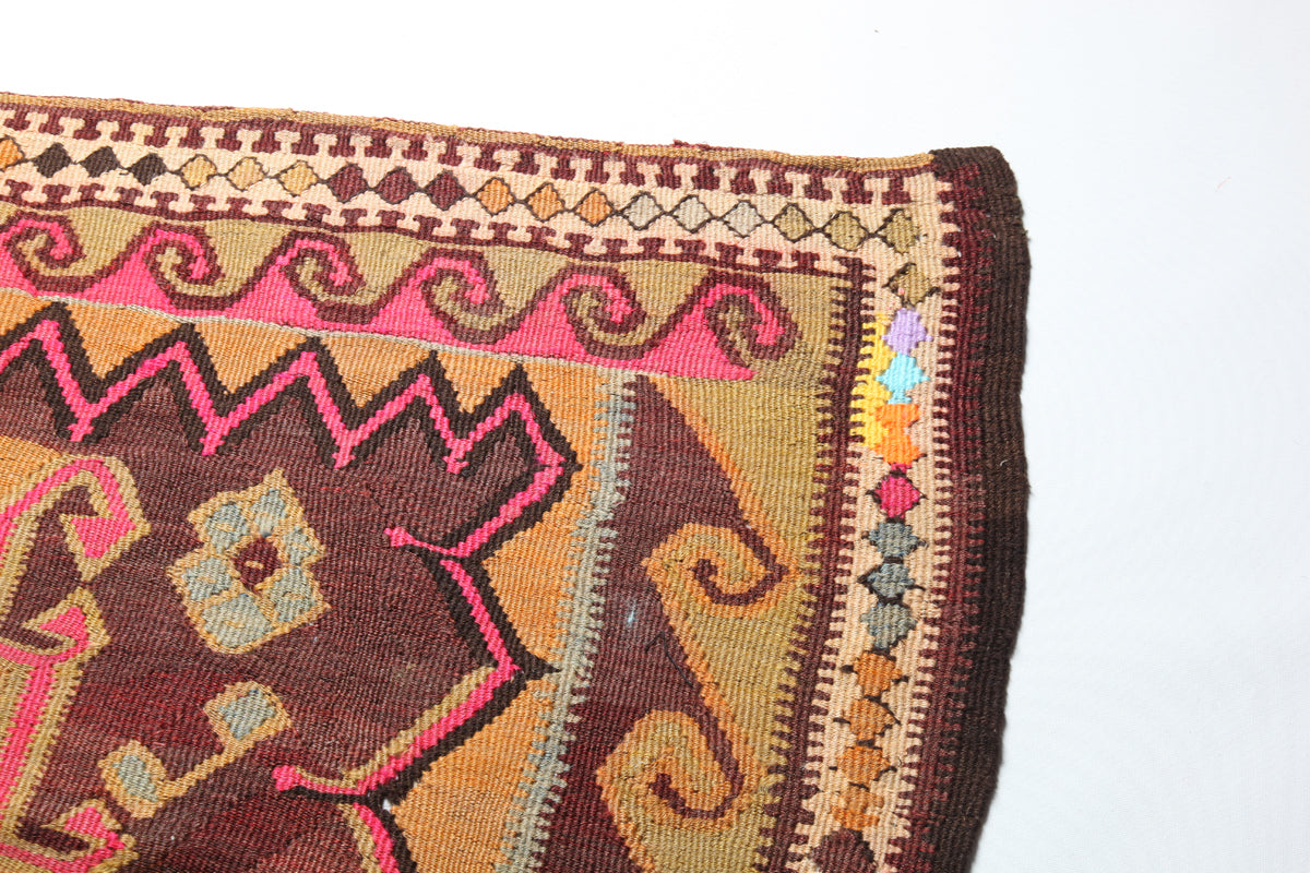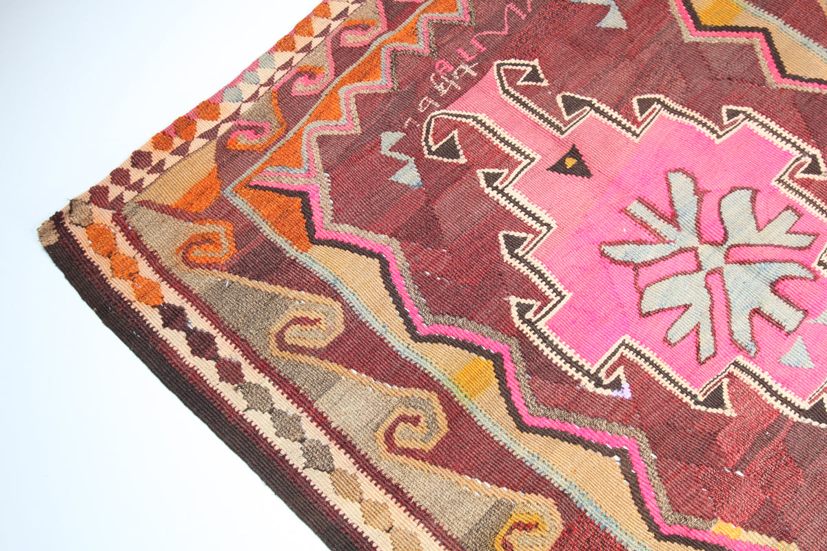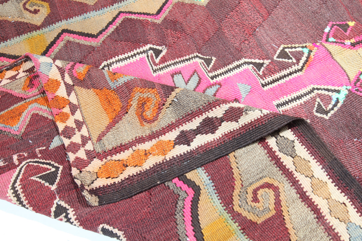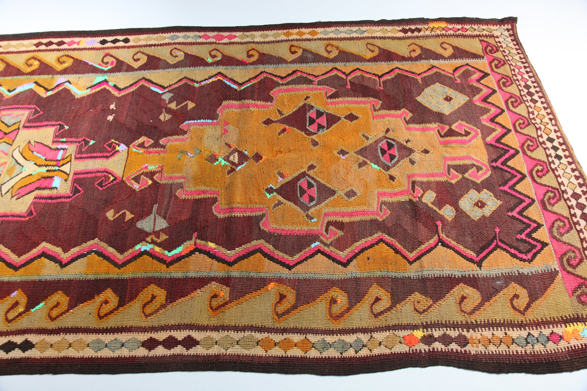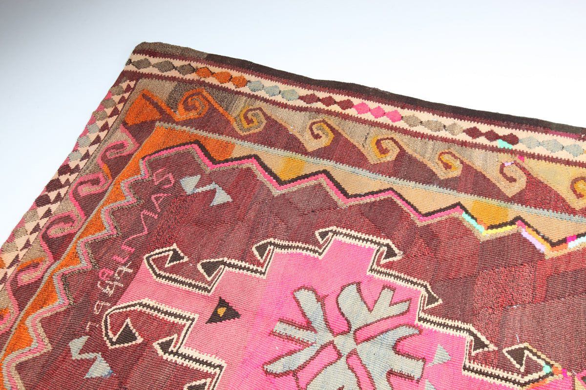 Woven by a skilled weaver in Kars, this kilim runner is woven in a wide and long style, making it ideal as a dowry or family piece. The weaver, proud of her work, dated and signed the rug, ensuring its value as a treasured piece. The kilim features a scorpion tail motif along the entire border, symbolizing dignity and pride while offering protection to its owner. Additionally, bright teal orlon highlights are scattered throughout the weaving, intended to dispel negative energy from the surroundings.