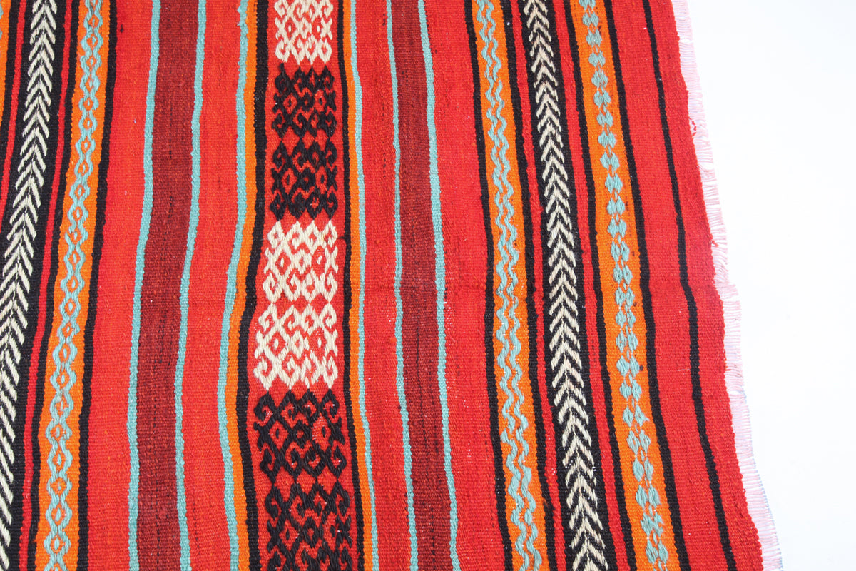 This striped vintage Denizli kilim closely resembles those from Balikkesir, reflecting the shared heritage of Turkoman nomads who settled in Western Anatolia in the 15th century. Adorned with protective all-seeing eye motifs, it is designed to ward off negative energies from anyone who owns this rug.